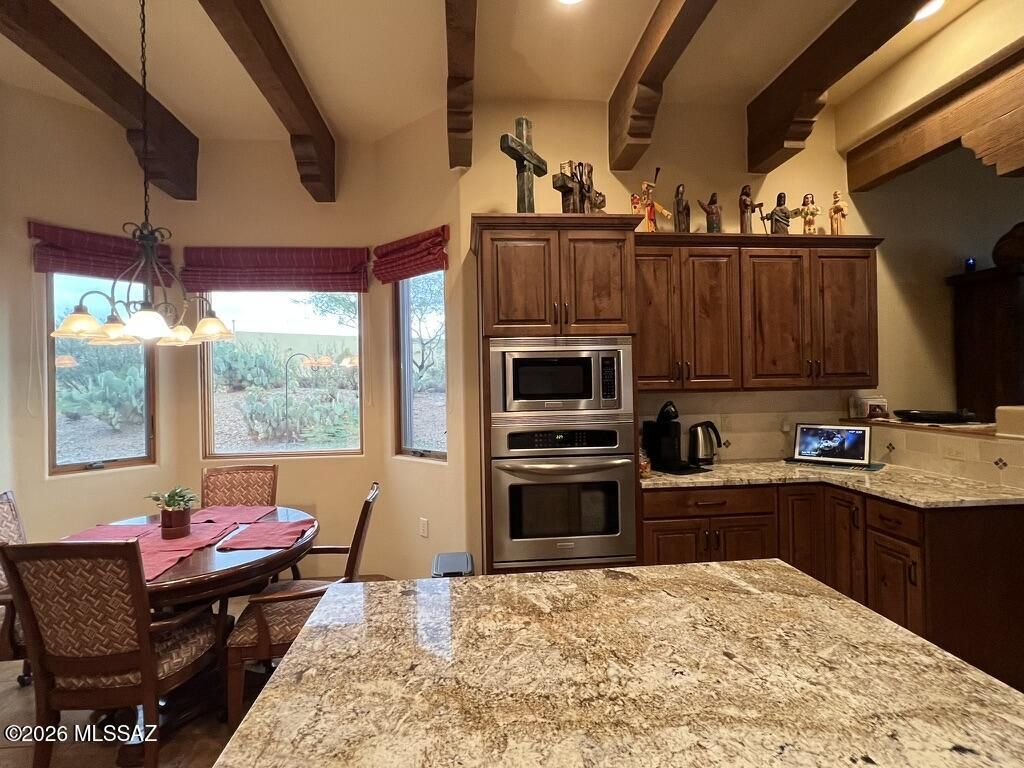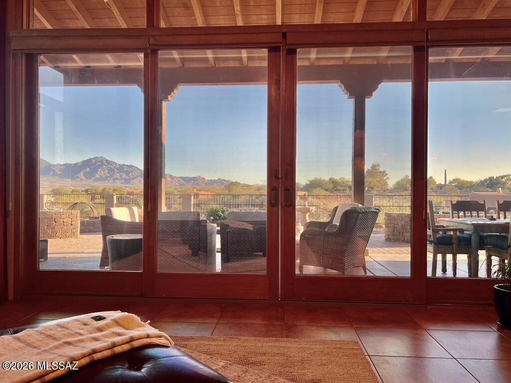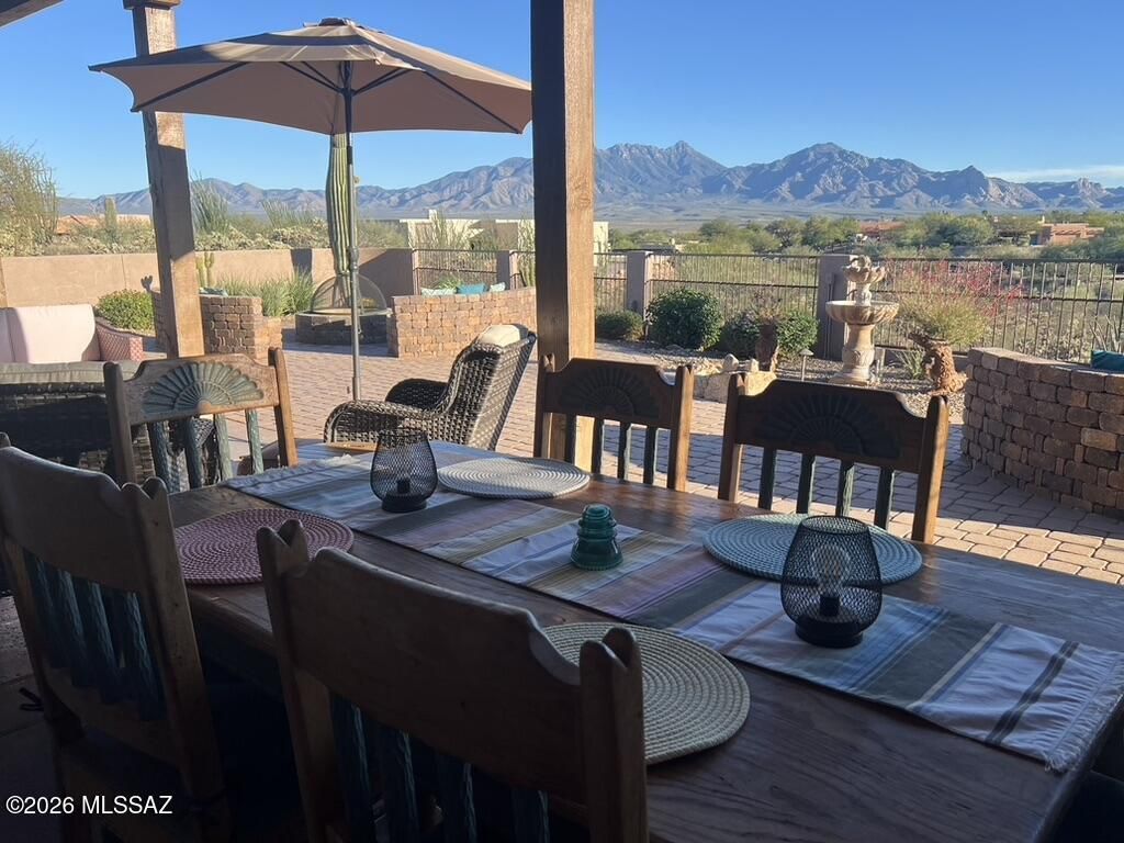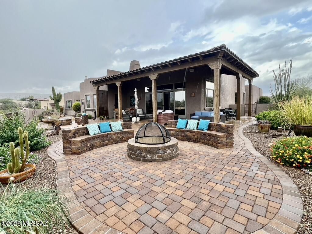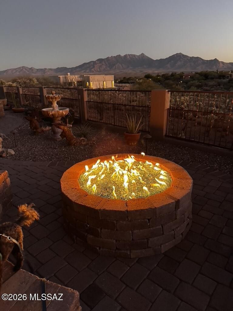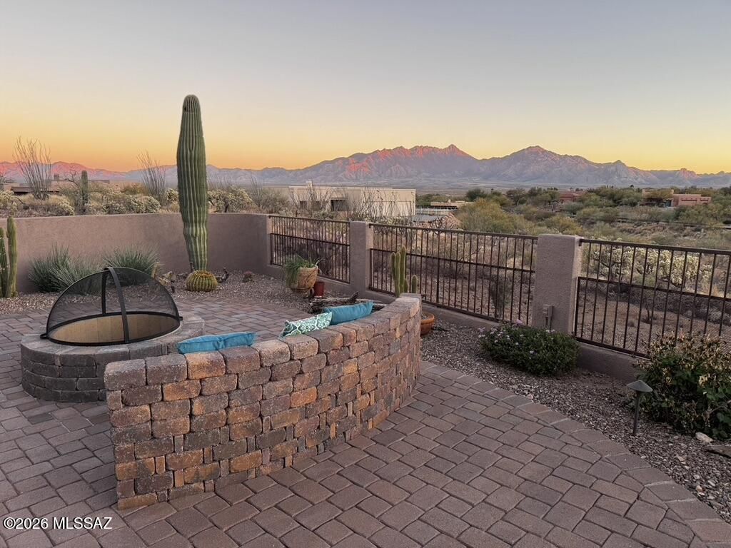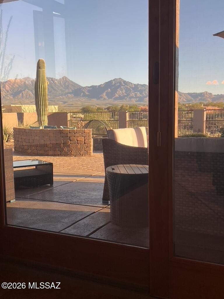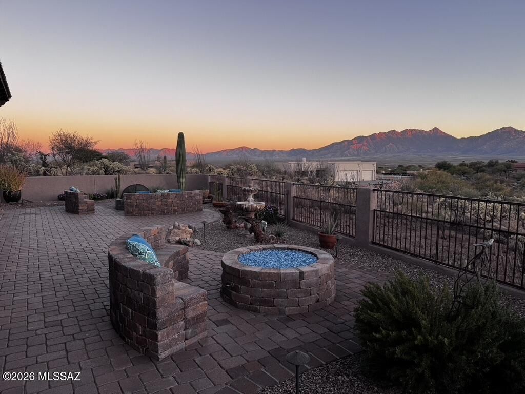 Quite possibly the best view in Green Valley! Stepping inside, the Santa Rita Mountains are ever present to take your breath away! Visible from every angle of the great room andkitchen, this is the true meaning of the phrase ''Mountain View''! The great room and kitchen are flooded with natural light and wooden beams and alder wood cabinetry add drama.Step into your chefs kitchen with granite counters with ample storage natural wood cabinets flanking the room. A separate dining area with indirect/direct lighting, along with the glowing fireplace add to the ambience. Alfresco dining at it's best. The resort style back patio with fire-pits both wood and gas and built in seating, perfect for entertaining or just relaxing. Same beautiful view from primary suite and casita.