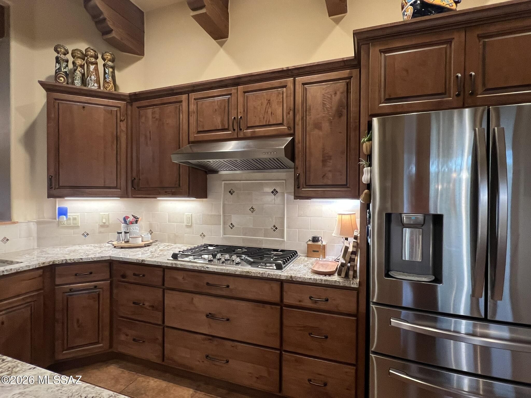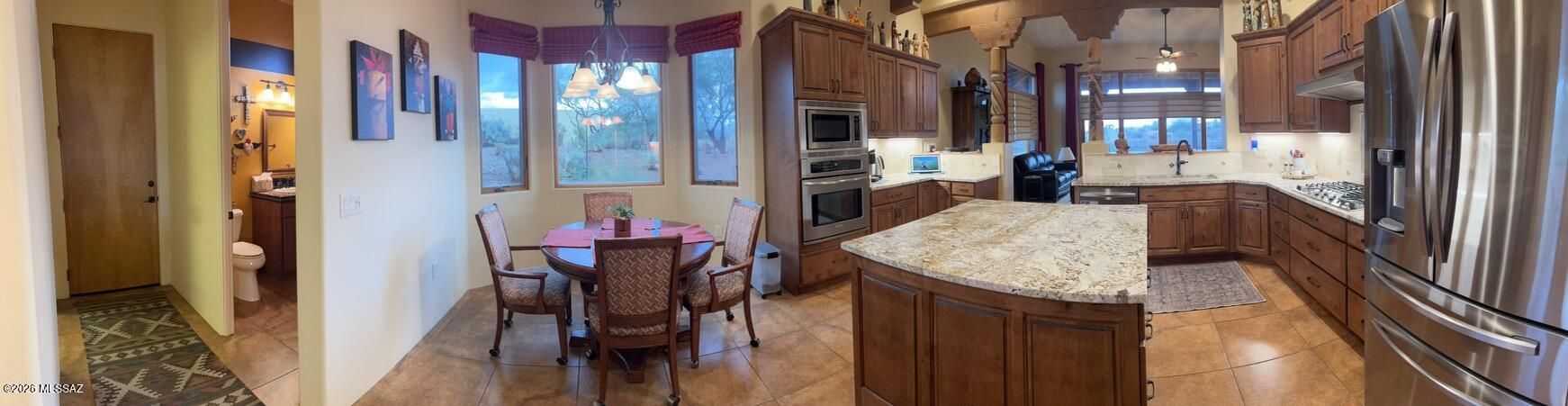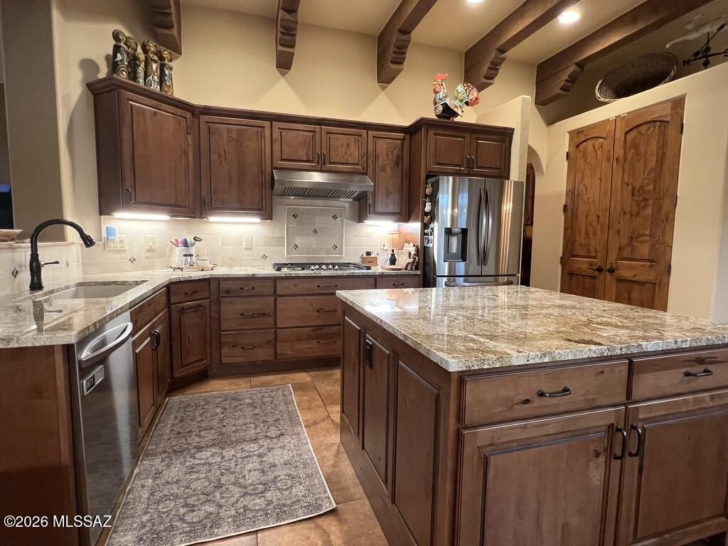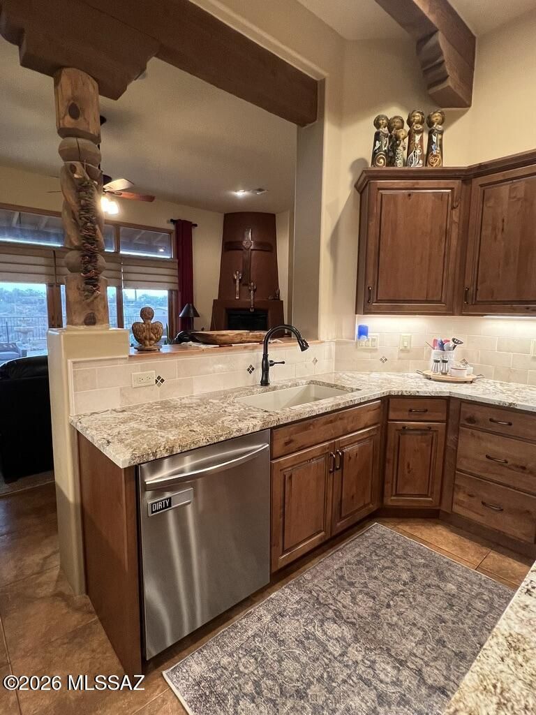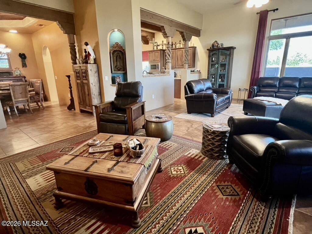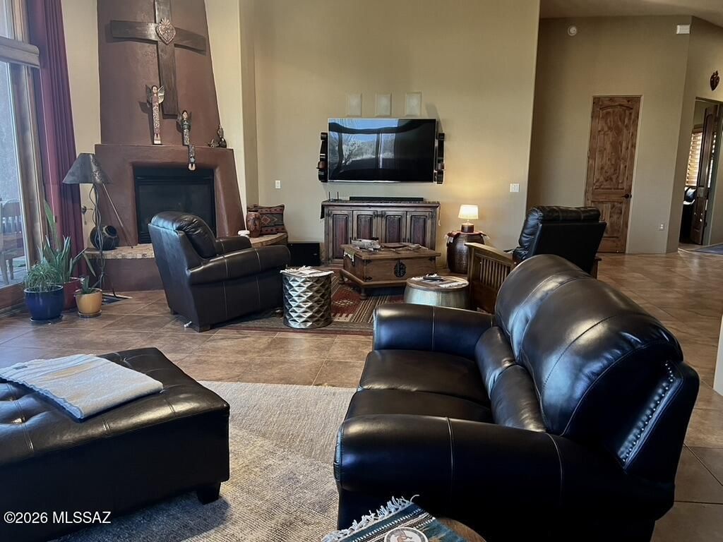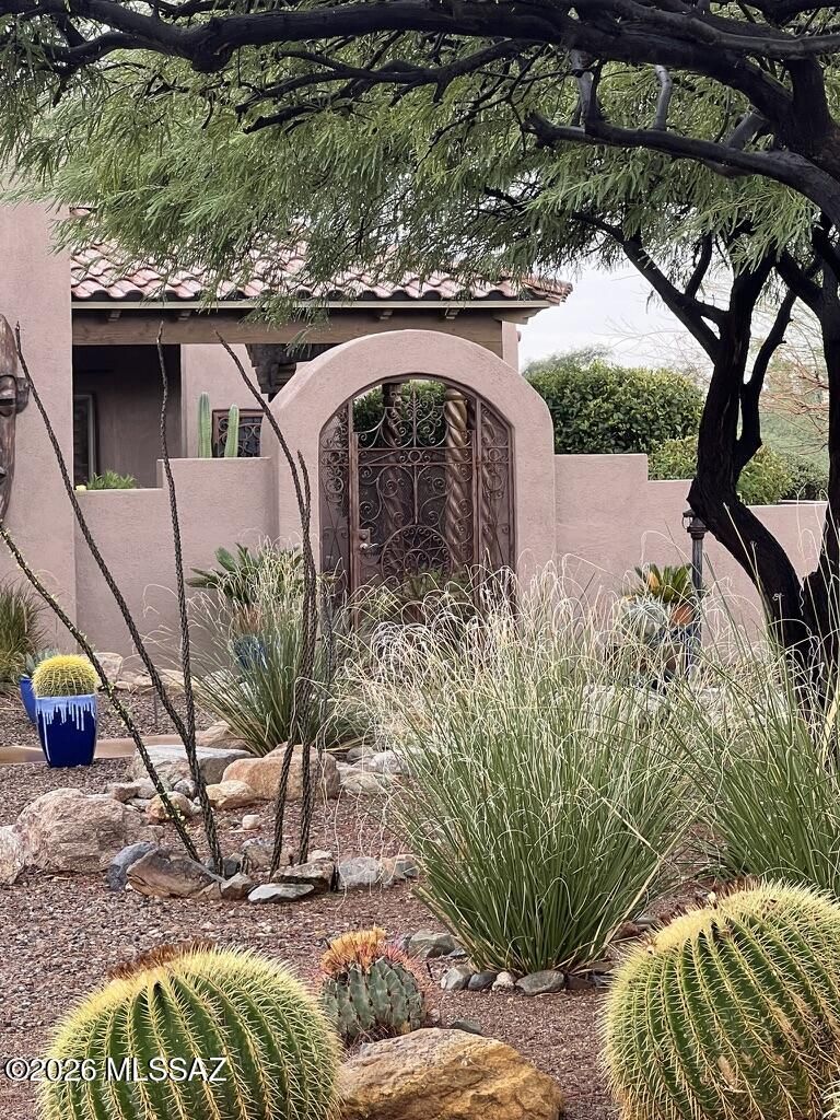 Quite possibly the best view in Green Valley! Stepping inside, the Santa Rita Mountains are ever present to take your breath away! Visible from every angle of the great room andkitchen, this is the true meaning of the phrase ''Mountain View''! The great room and kitchen are flooded with natural light and wooden beams and alder wood cabinetry add drama.Step into your chefs kitchen with granite counters with ample storage natural wood cabinets flanking the room. A separate dining area with indirect/direct lighting, along with the glowing fireplace add to the ambience. Alfresco dining at it's best. The resort style back patio with fire-pits both wood and gas and built in seating, perfect for entertaining or just relaxing. Same beautiful view from primary suite and casita.