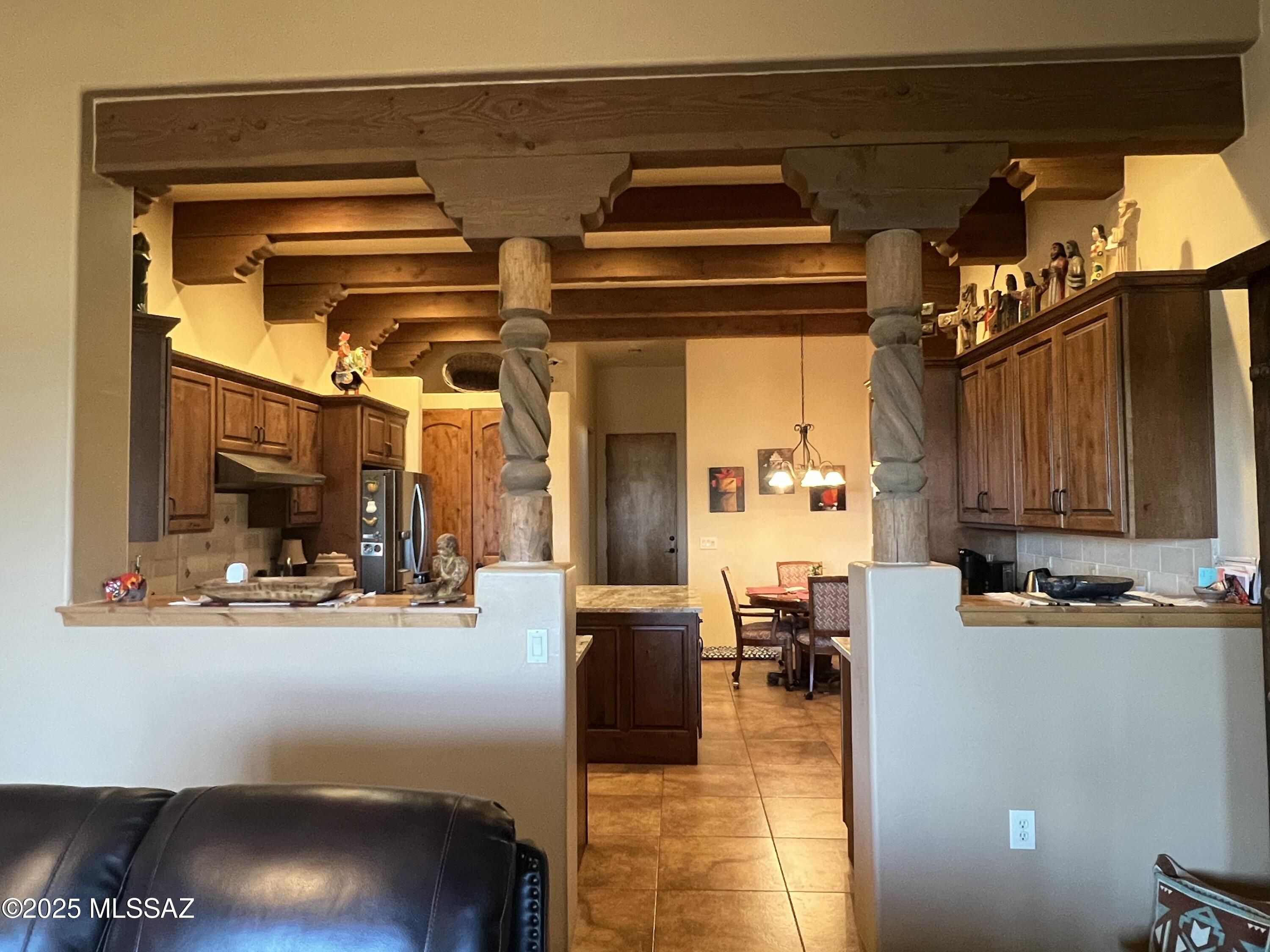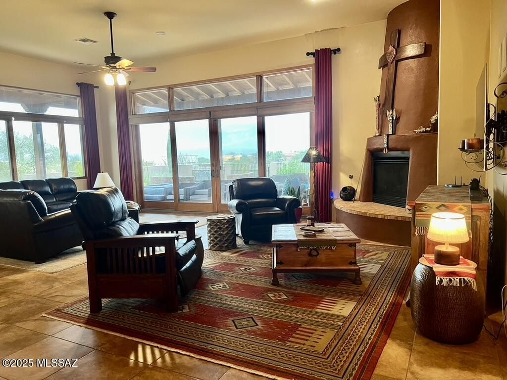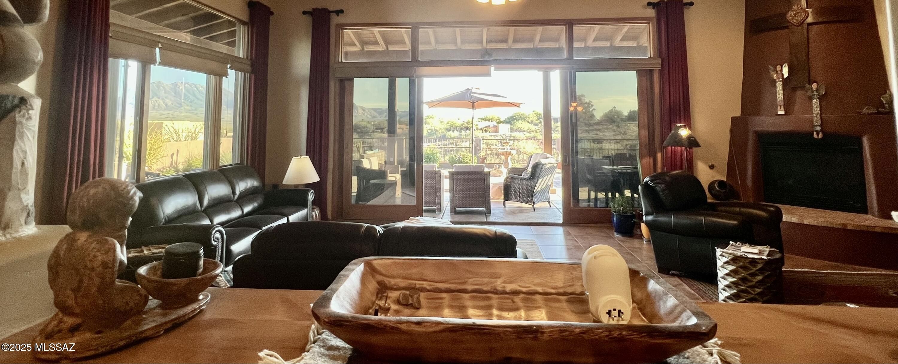 Quite possibly the best view in Green Valley! Stepping inside, the Santa Rita Mountains are ever present to take your breath away! Visible from every angle of the great room and kitchen, this is the true meaning of the phrase ''Mountain View''! The great room and kitchen are floodedwith natural light and wooden beams and alder wood cabinetry add drama. Step into your chefskitchen with granite counters with ample storage natural wood cabinets flanking the room. A separate dining area with indirect/direct lighting, along with the glowing fireplace add to the ambience. Alfresco dining at it's best. The resort style back patio with fire-pits both wood and gas and built in seating, perfect for entertaining or just relaxing. Same beautiful view from primary suite and casita.