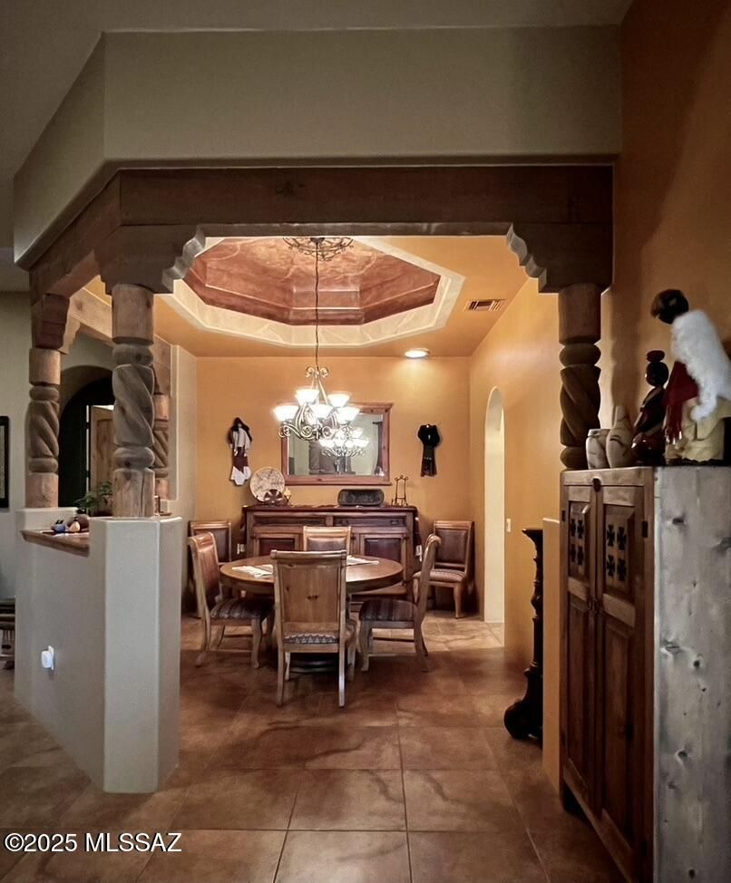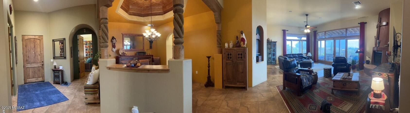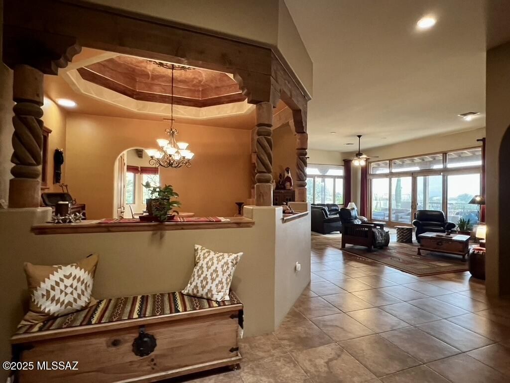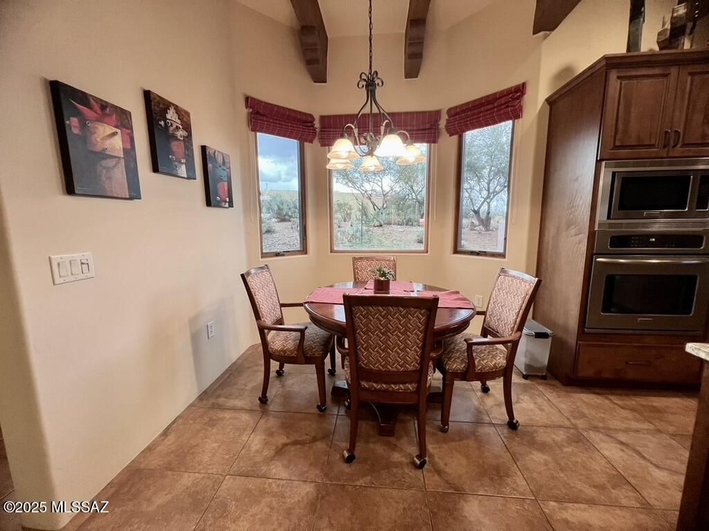 Quite possibly the best view in Green Valley! Stepping inside, the Santa Rita Mountains are ever present to take your breath away! Visible from every angle of the great room and kitchen, this is the true meaning of the phrase ''Mountain View''! The great room and kitchen are floodedwith natural light and wooden beams and alder wood cabinetry add drama. Step into your chefskitchen with granite counters with ample storage natural wood cabinets flanking the room. A separate dining area with indirect/direct lighting, along with the glowing fireplace add to the ambience. Alfresco dining at it's best. The resort style back patio with fire-pits both wood and gas and built in seating, perfect for entertaining or just relaxing. Same beautiful view from primary suite and casita.