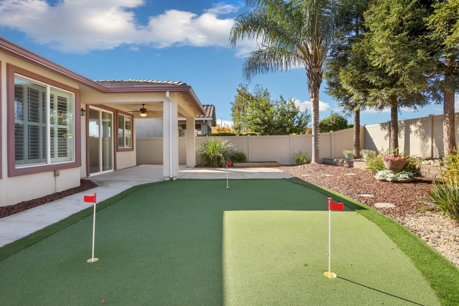Welcome to this beautifully maintained home in the vibrant 55+ community of Del Webb Woodbridge! This 2-bedroom, 2-bath residence combines comfort, style, and efficiency in every detail. Step inside to a bright, open-concept layout featuring fresh interior and exterior paint, with newer carpet and plantation shutters throughout, creating a warm and inviting atmosphere. Thoughtful upgrades include a newer HVAC system with UV lights for enhanced air quality and allergen reduction, an attic ventilation system for improved energy efficiency, and a tankless water heater. The kitchen offers granite countertops, a double oven, tile flooring, and ample kitchen cabinetry. The spacious primary suite offers elegant crown molding, a relaxing ensuite bath, and a tranquil retreat to unwind. Step outside to your private backyard oasis complete with a personal putting green, covered patio with ceiling fan, and freshly landscaped front and backyards perfect for relaxing or entertaining. Residents enjoy resort-style amenities including a clubhouse, fitness center, indoor and outdoor pools, tennis and pickleball courts, bocce ball, softball field, putting course, and scenic parks. Move-in ready and loaded with thoughtful upgrades this is retirement living at its finest!