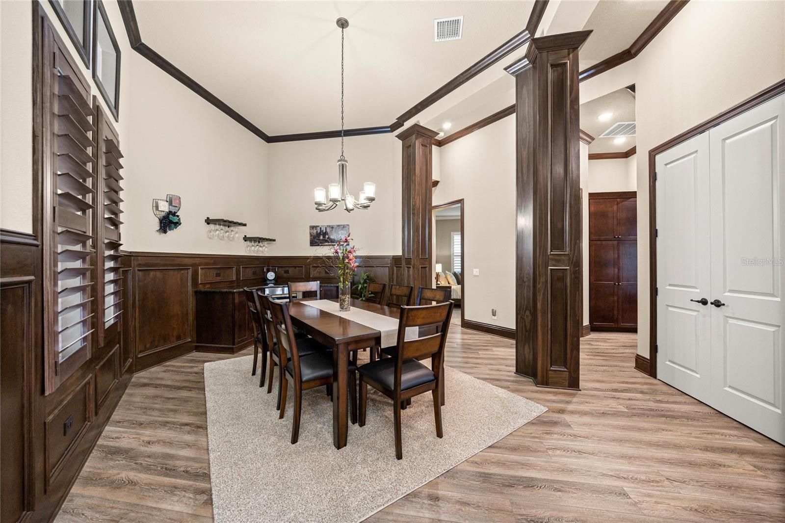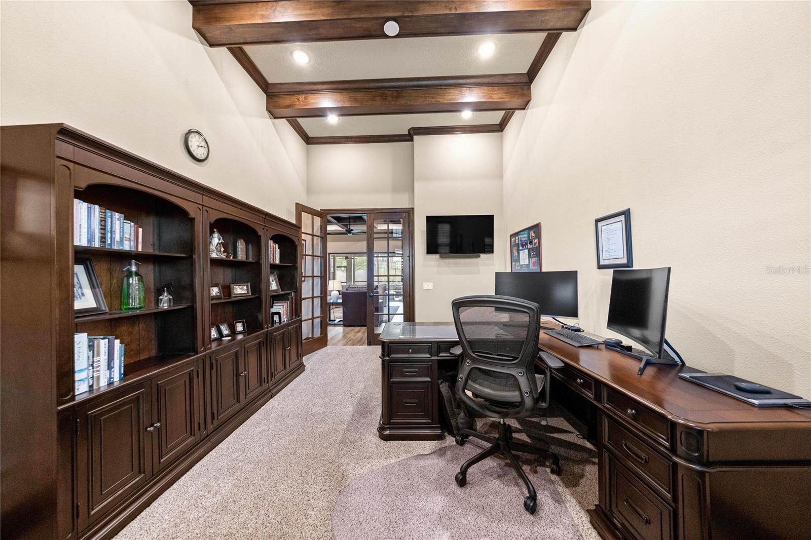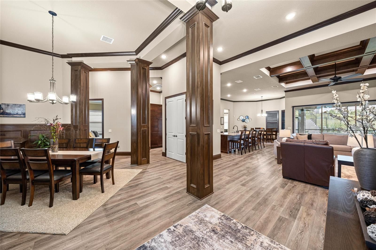 - Built-in Features, Ceiling Fan(s), Coffered Ceiling(s), Crown Molding, Eat-in Kitchen, High Ceilings, Open Floorplan, In-Wall Pest Control, Solid-Wood Cabinets, Split Bedrooms, Stone Counters, Thermostat, Tray Ceiling(s), Walk-In Closet(s), Window Treatments