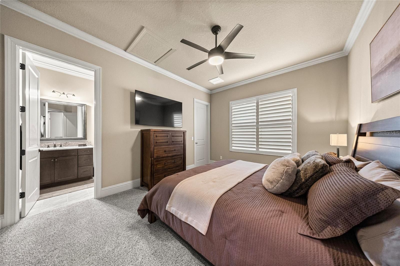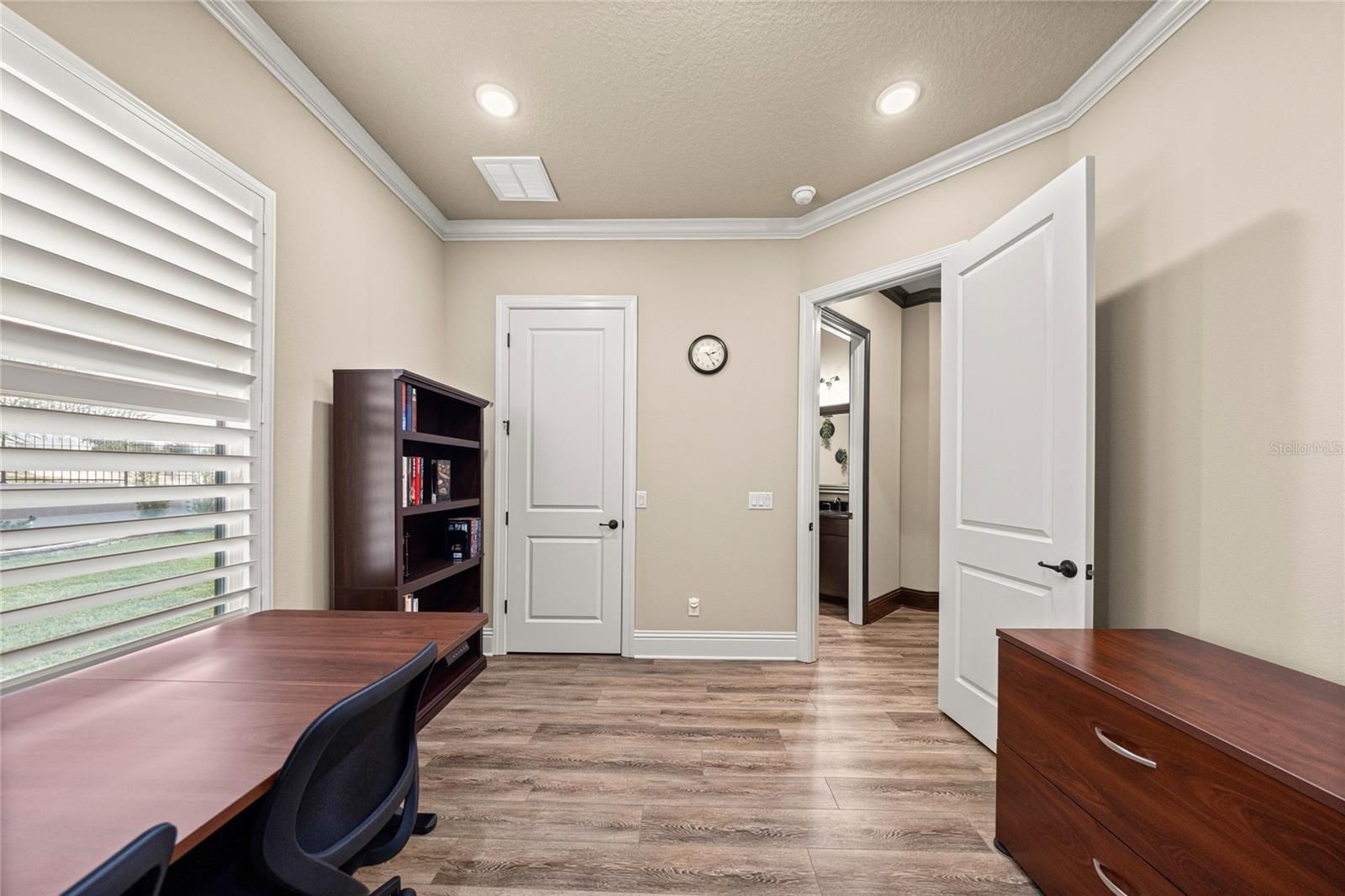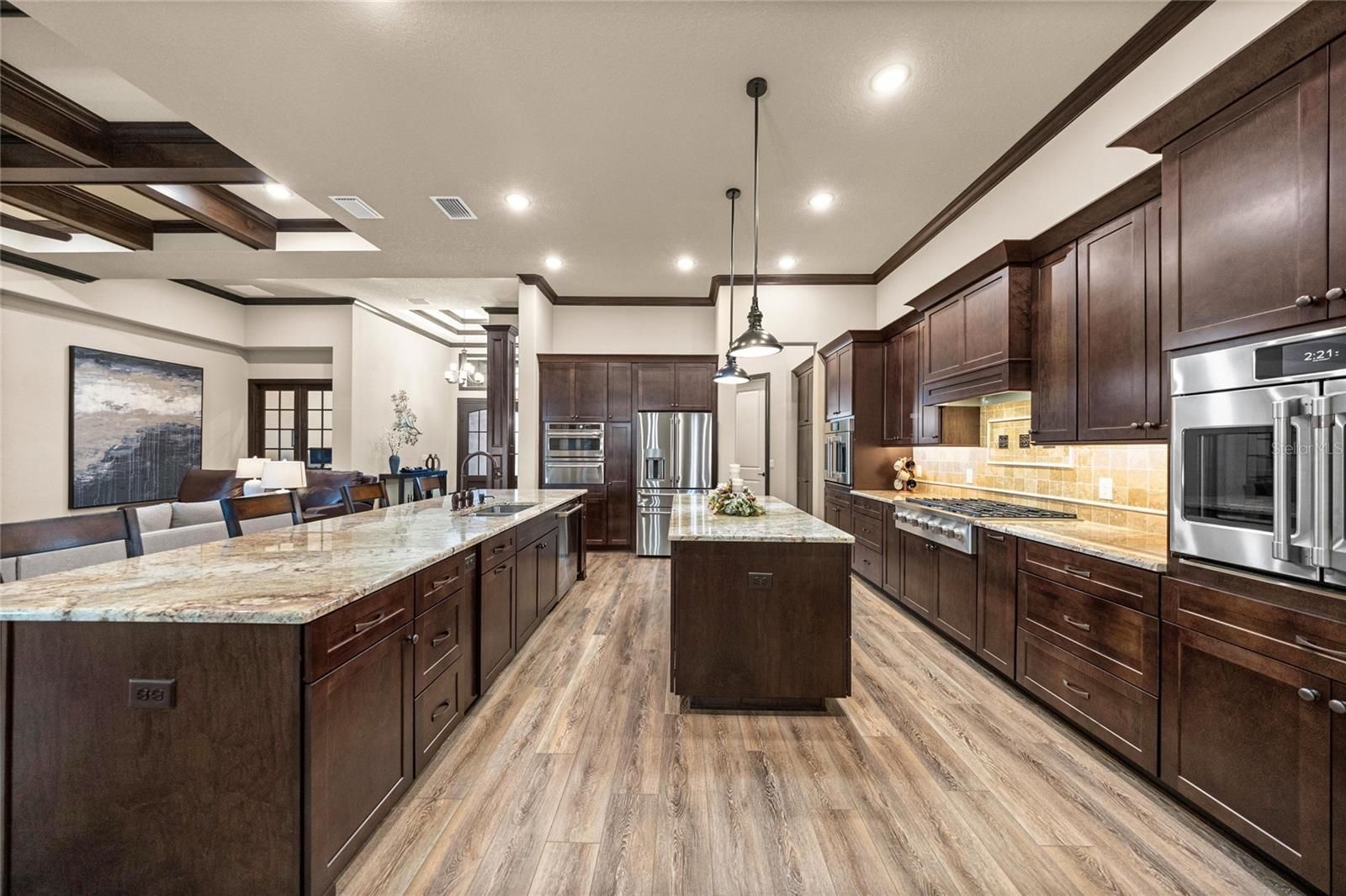 - Built-in Features, Ceiling Fan(s), Coffered Ceiling(s), Crown Molding, Eat-in Kitchen, High Ceilings, Open Floorplan, In-Wall Pest Control, Solid-Wood Cabinets, Split Bedrooms, Stone Counters, Thermostat, Tray Ceiling(s), Walk-In Closet(s), Window Treatments
