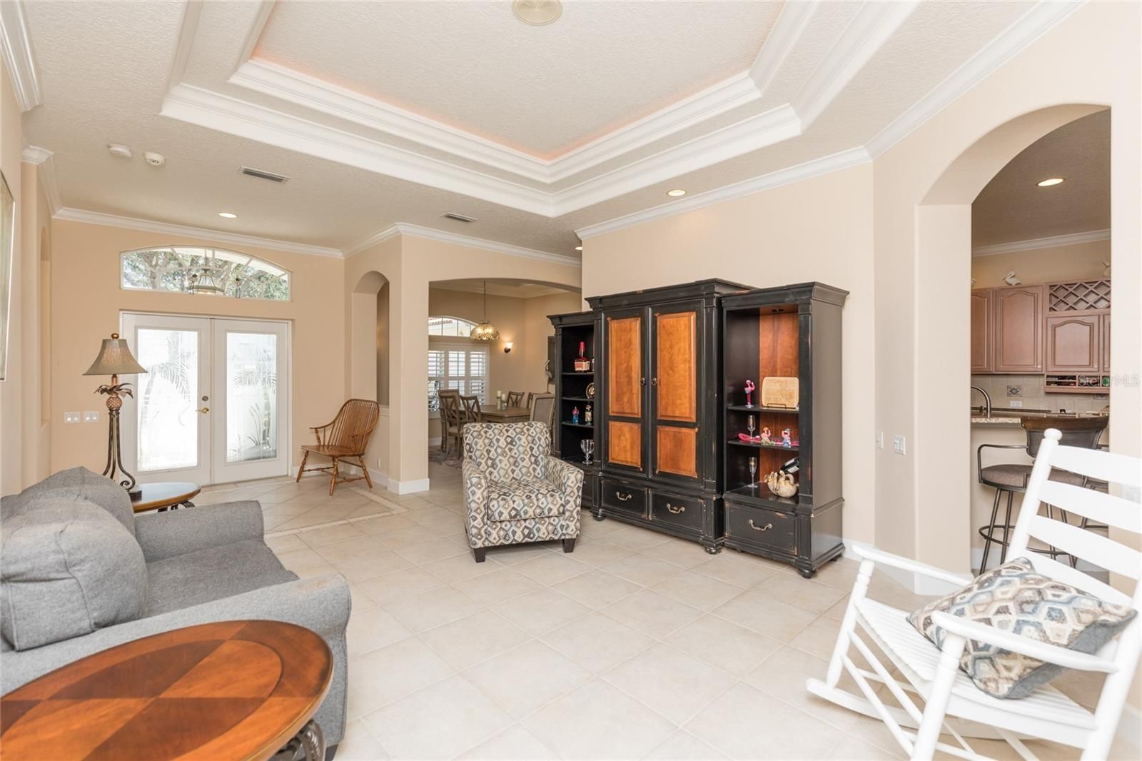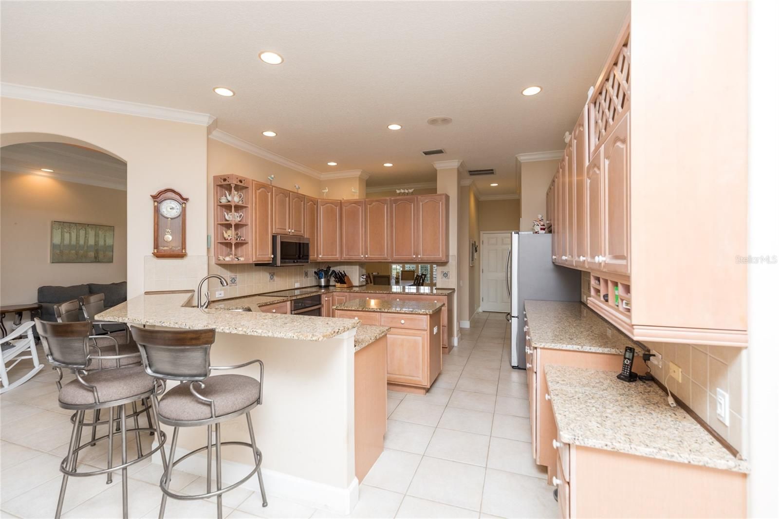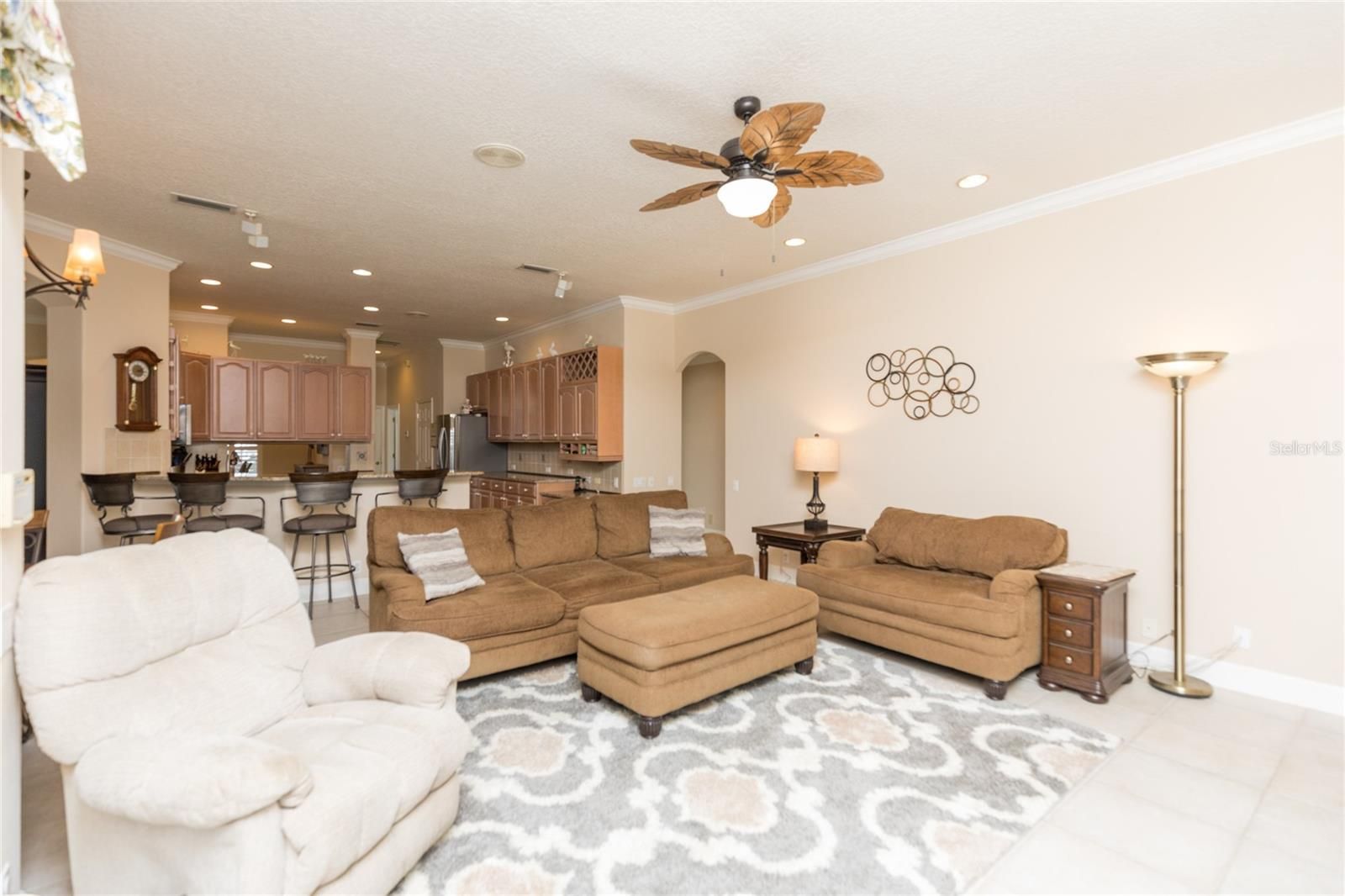 - Built-in Features, Ceiling Fan(s), Crown Molding, Eat-in Kitchen, High Ceilings, Kitchen/Family Room Combo, Open Floorplan, Main Level Primary, Solid Surface Counters, Solid-Wood Cabinets, Split Bedrooms, Stone Counters, Walk-In Closet(s), Window Treatments