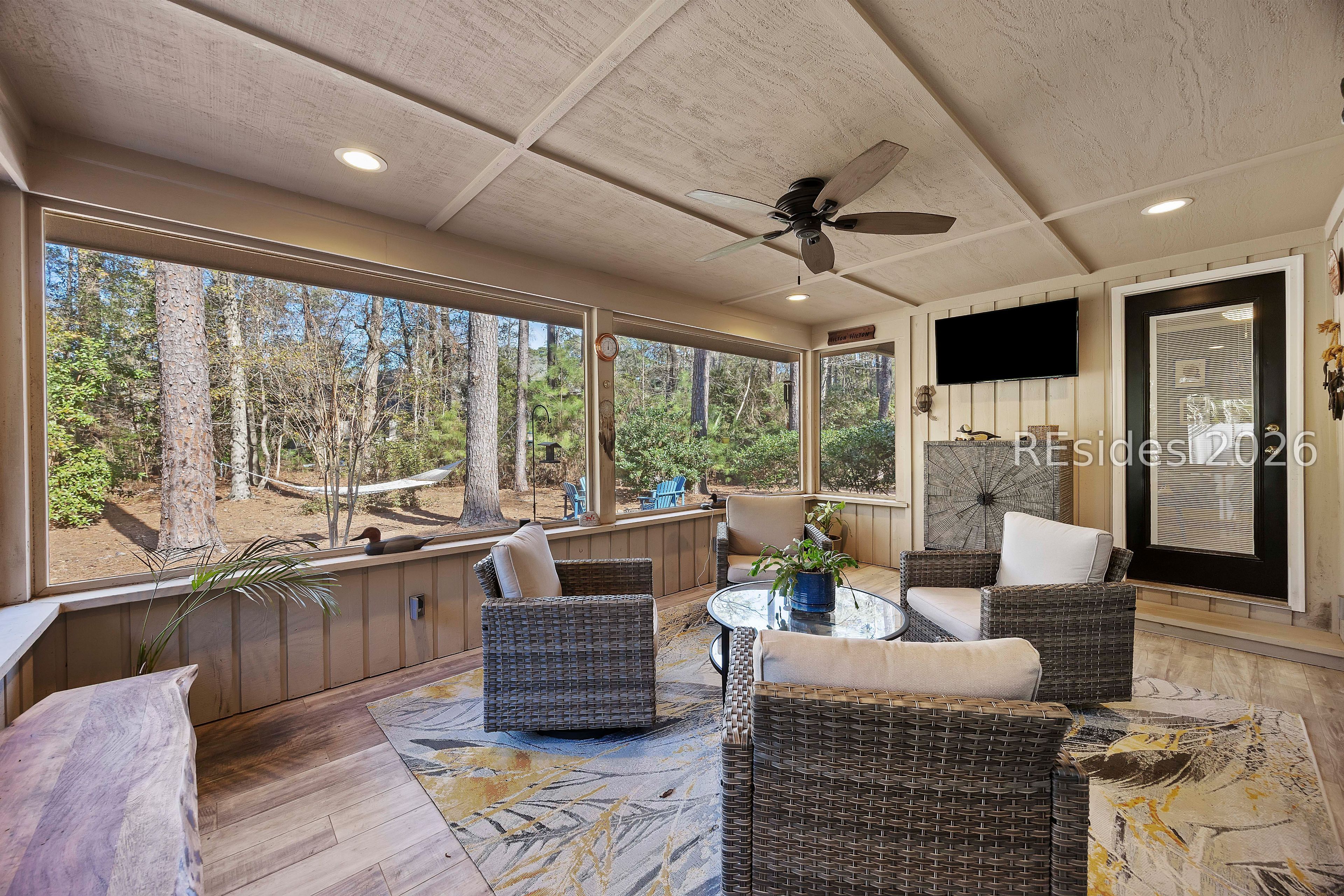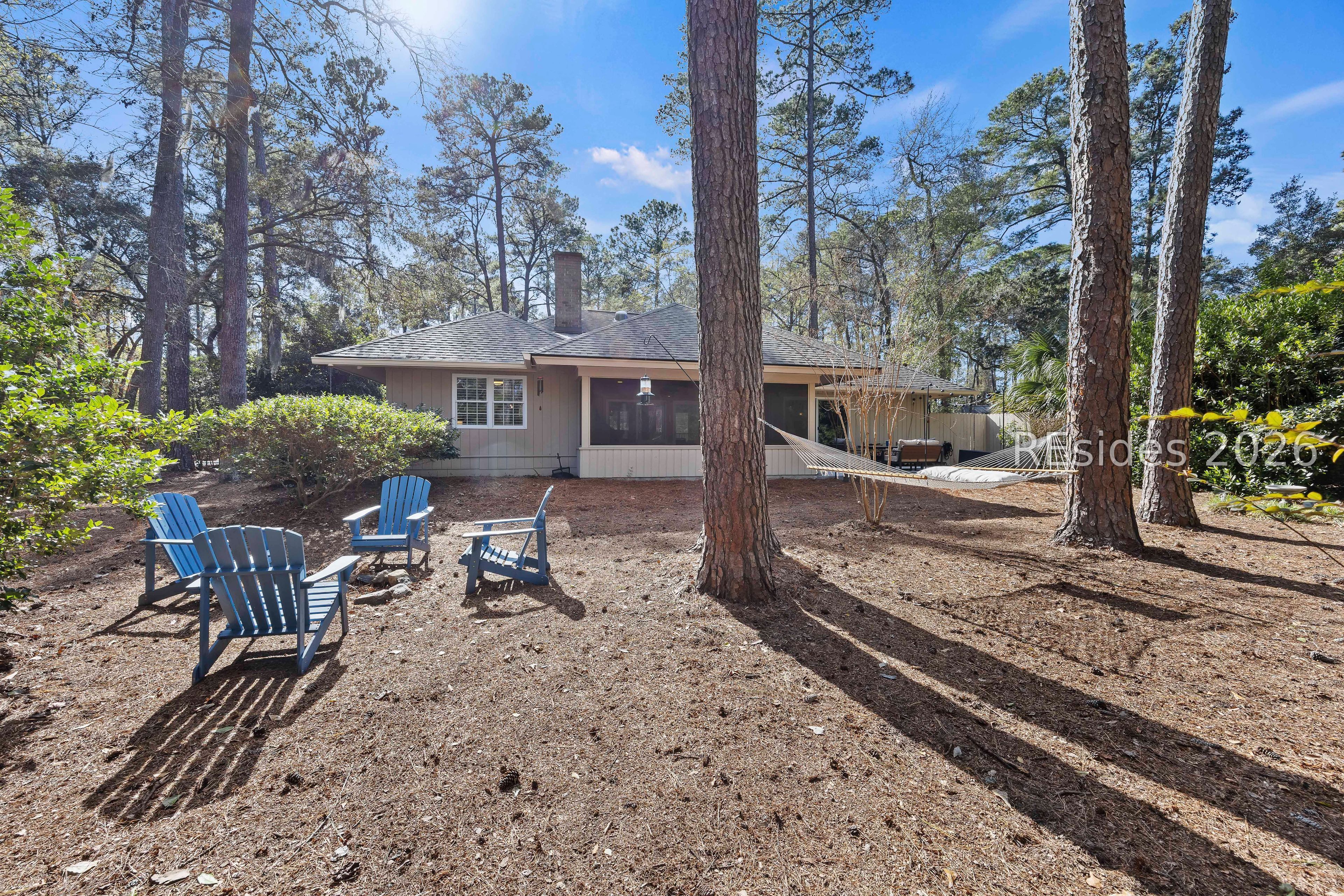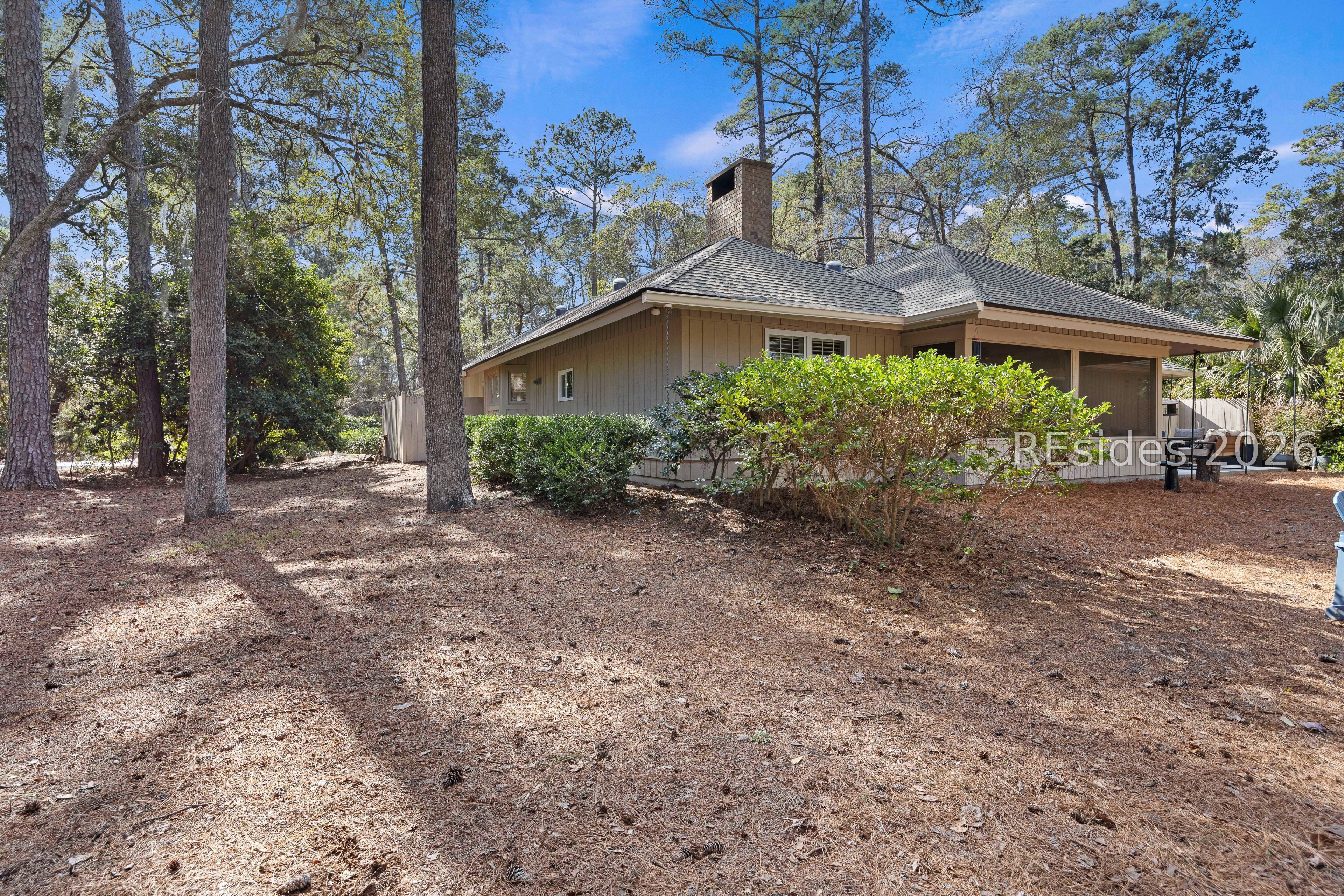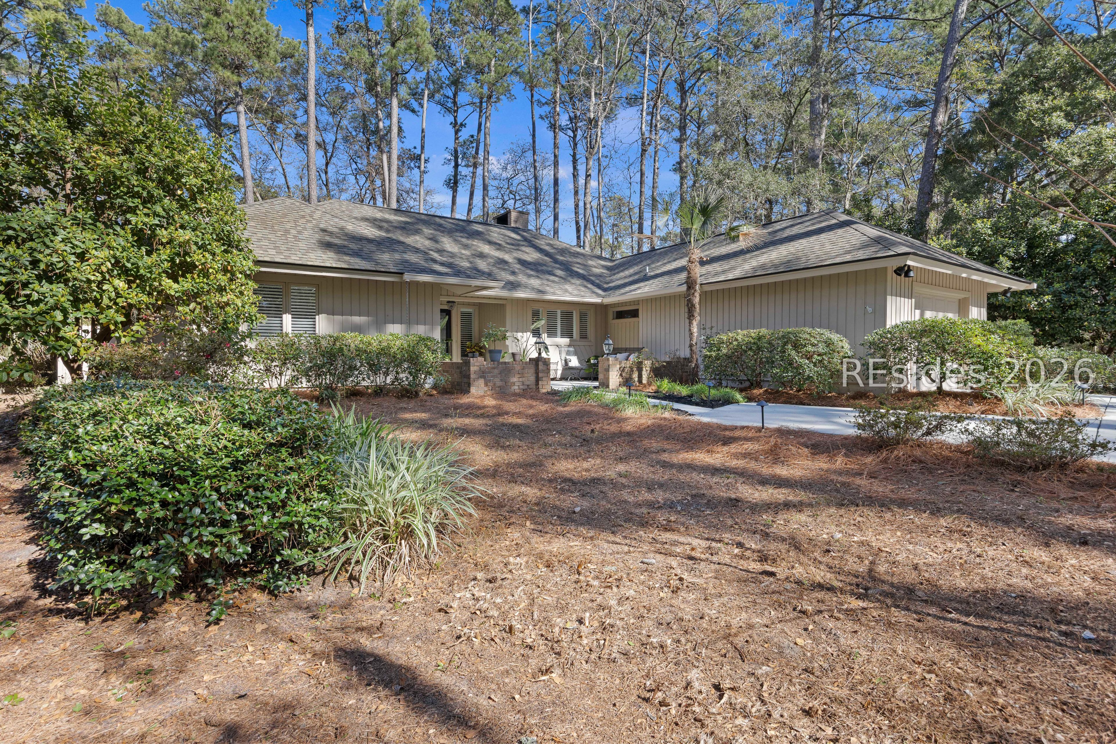 Welcome to 2 Fish Hawk! This eclectic, mid-century coastal cottage offers single-level living on an oversized lot with a peaceful wooded view. As you enter the home through the quaint front courtyard, the Mahogany front door opens to the spacious living area with cathedral ceilings and a wood burning fireplace. The updated kitchen features quartz countertops, newer cabinets, an extended island, coffee/wine bar and new appliances (refrigerator, convection oven/induction range and dishwasher). The designer inspired primary suite boasts a luxurious tiled shower, walk-in closet and a slider door that opens to its own private patio. The adjacent guest bedroom is spacious and opens to the updated 2nd bathroom. The 3rd bedroom (currently used as an office) is off of the kitchen with a private door to the large screened porch that looks out over the private natural setting. The .446 acre lot provides ample room for expansion and plenty of space for a pool. Additional recent upgrades include a 3-ton variable speed HVAC system, new 200 amp electrical panel, new lighting fixtures, solar tubes, interior paint, plantation shutters, a whole house water purifier/softener, and epoxy flooring in the oversized 1-car garage. Centrally located in amenity rich Hilton Head Plantation, within close proximity to both Spring Lake and Dolphin Head, this beautiful home is a "box checker", indeed. Most furnishings are available/negotiable. Hurry, don't wait on this one.