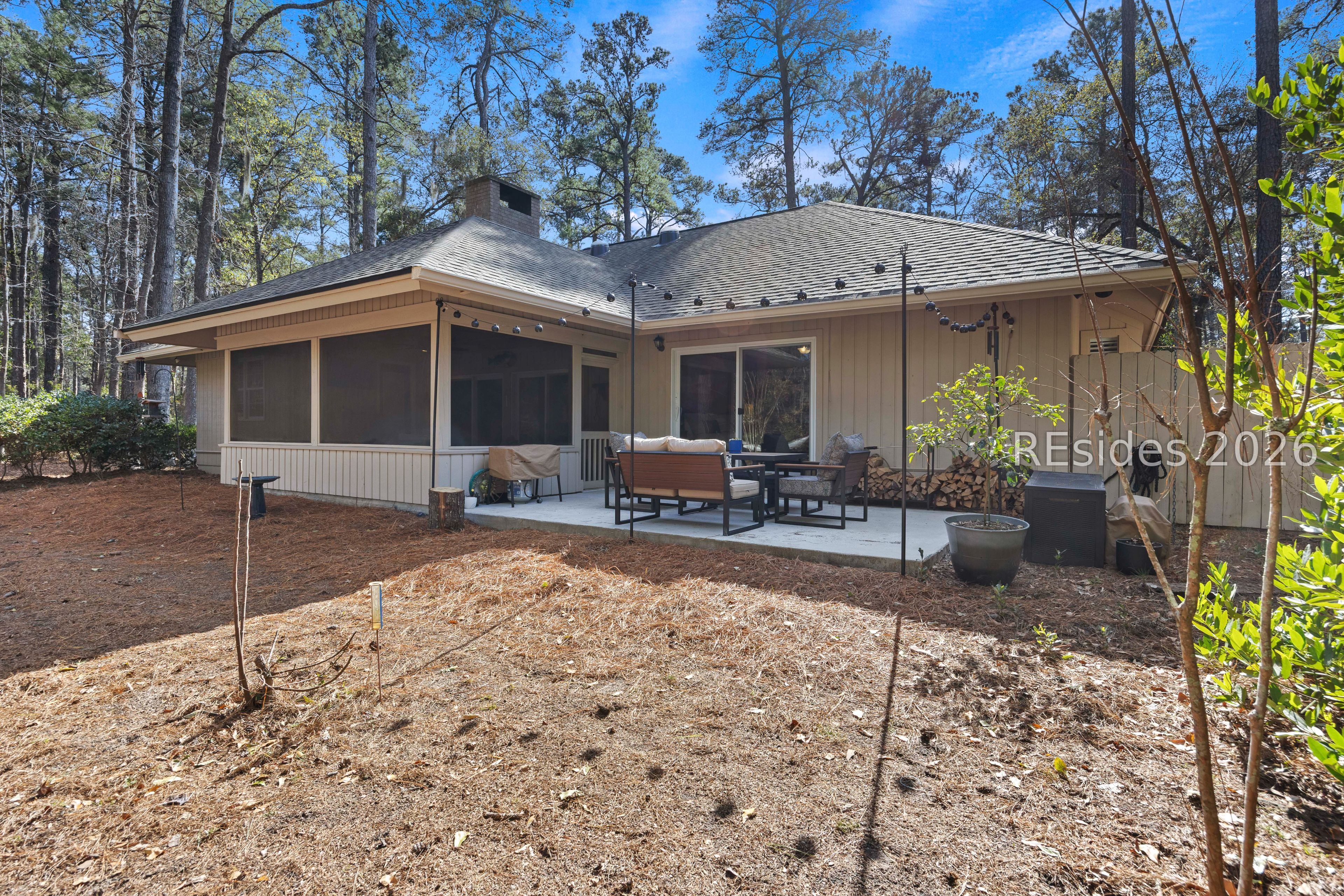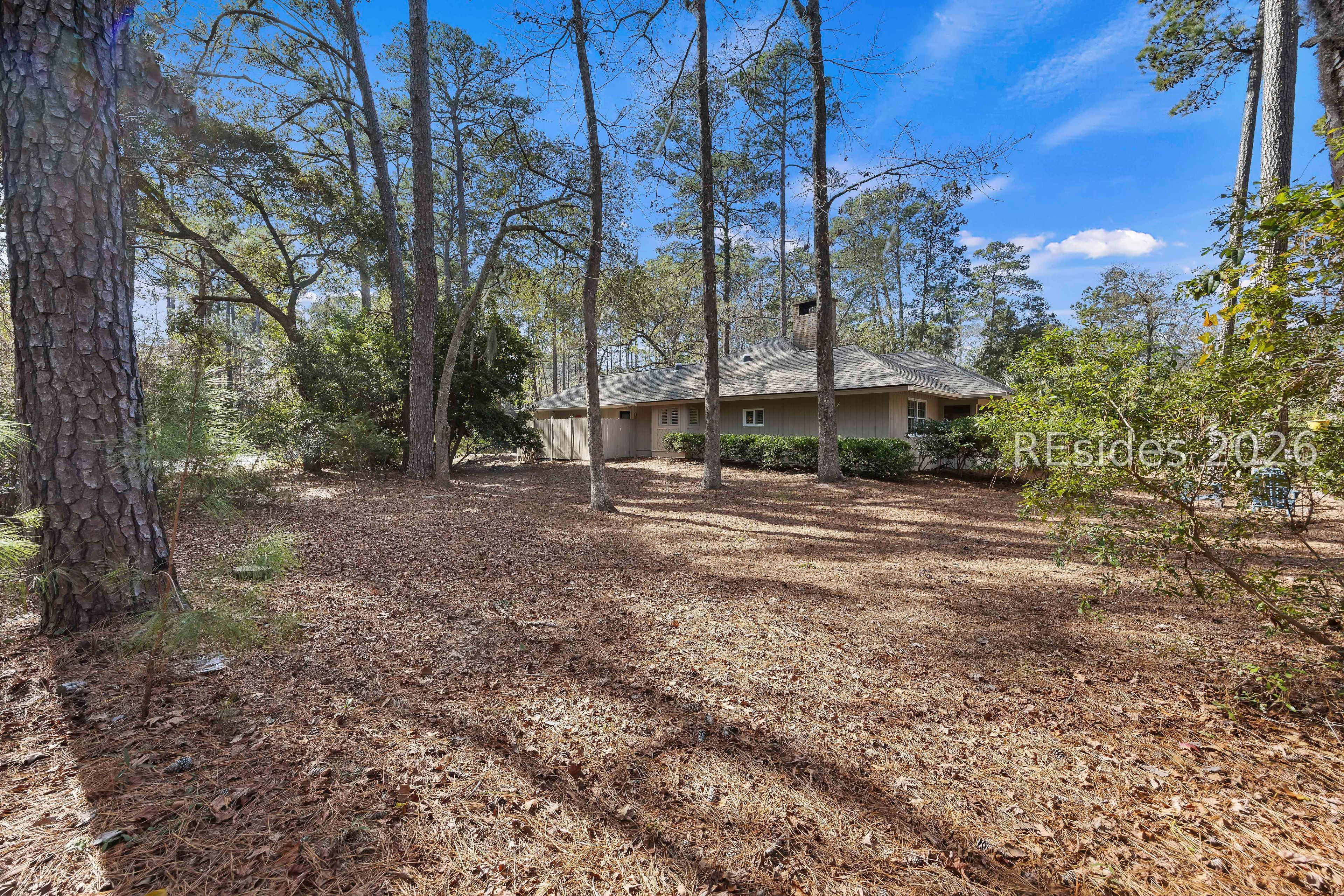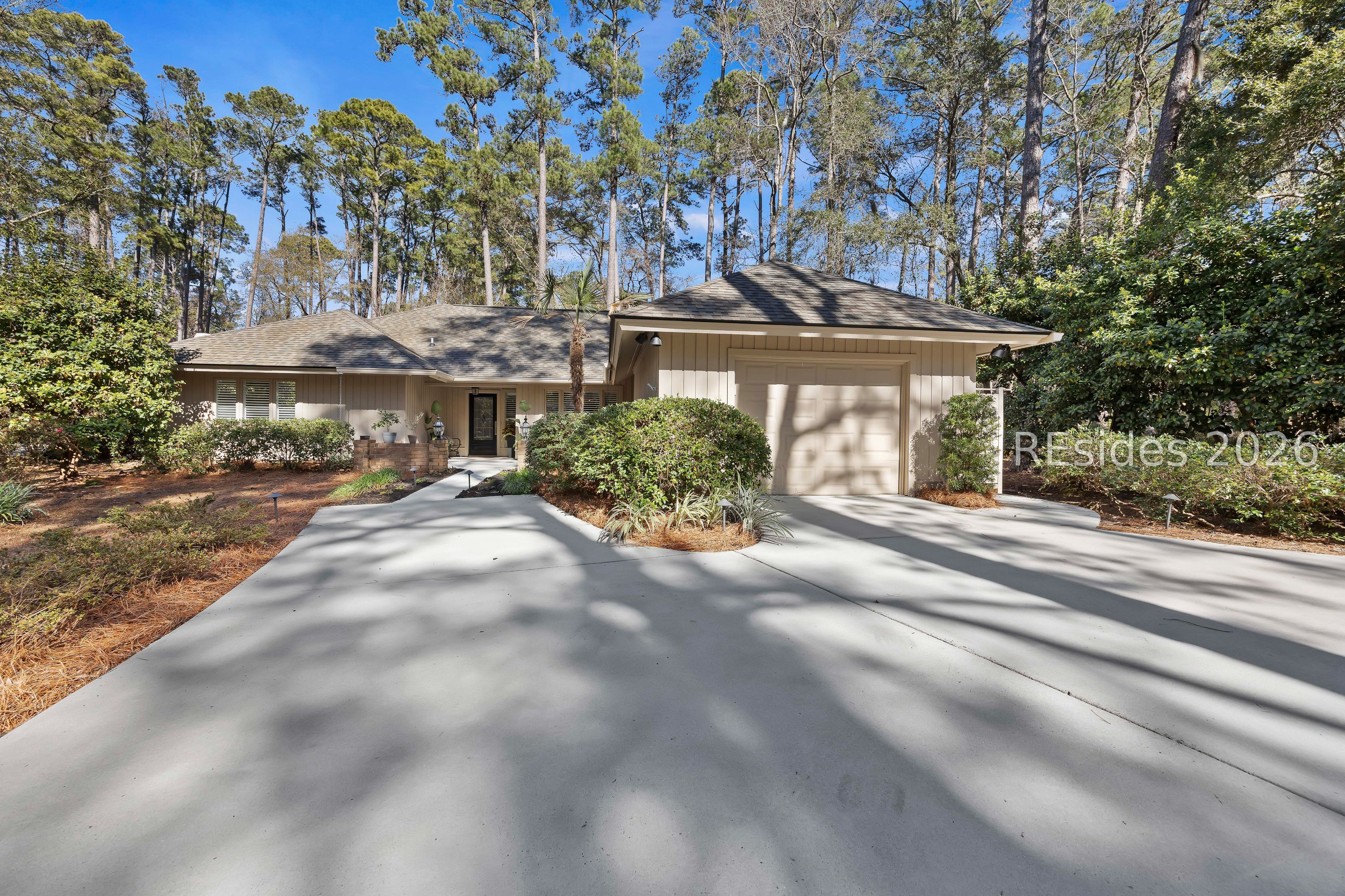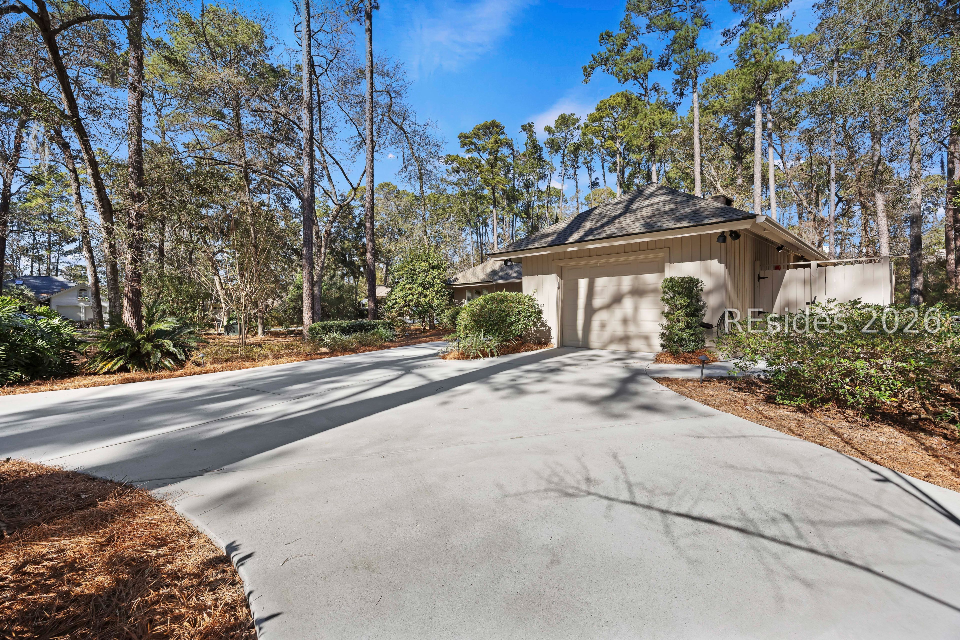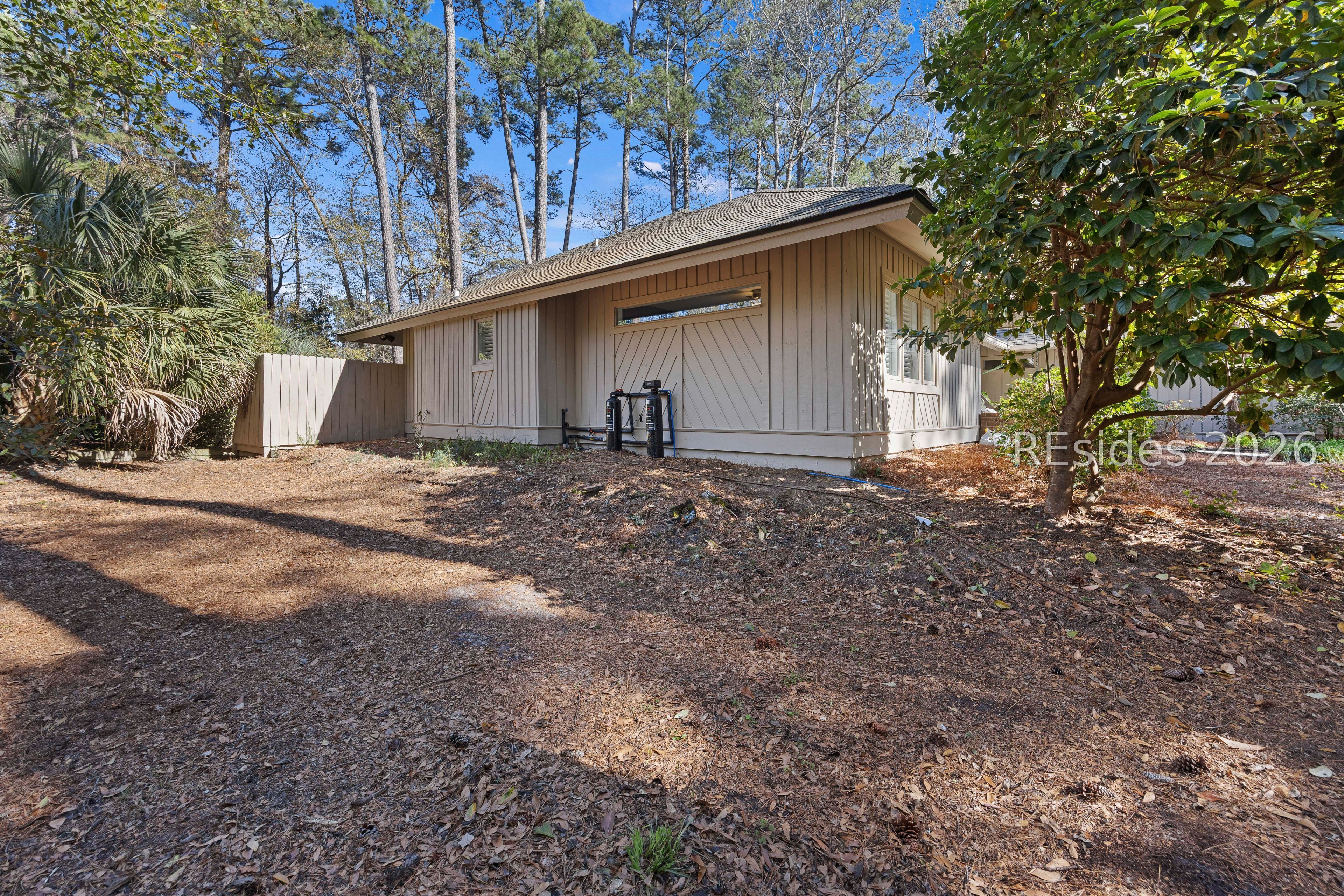 Welcome to 2 Fish Hawk! This eclectic, mid-century coastal cottage offers single-level living on an oversized lot with a peaceful wooded view. As you enter the home through the quaint front courtyard, the Mahogany front door opens to the spacious living area with cathedral ceilings and a wood burning fireplace. The updated kitchen features quartz countertops, newer cabinets, an extended island, coffee/wine bar and new appliances (refrigerator, convection oven/induction range and dishwasher). The designer inspired primary suite boasts a luxurious tiled shower, walk-in closet and a slider door that opens to its own private patio. The adjacent guest bedroom is spacious and opens to the updated 2nd bathroom. The 3rd bedroom (currently used as an office) is off of the kitchen with a private door to the large screened porch that looks out over the private natural setting. The .446 acre lot provides ample room for expansion and plenty of space for a pool. Additional recent upgrades include a 3-ton variable speed HVAC system, new 200 amp electrical panel, new lighting fixtures, solar tubes, interior paint, plantation shutters, a whole house water purifier/softener, and epoxy flooring in the oversized 1-car garage. Centrally located in amenity rich Hilton Head Plantation, within close proximity to both Spring Lake and Dolphin Head, this beautiful home is a "box checker", indeed. Most furnishings are available/negotiable. Hurry, don't wait on this one.