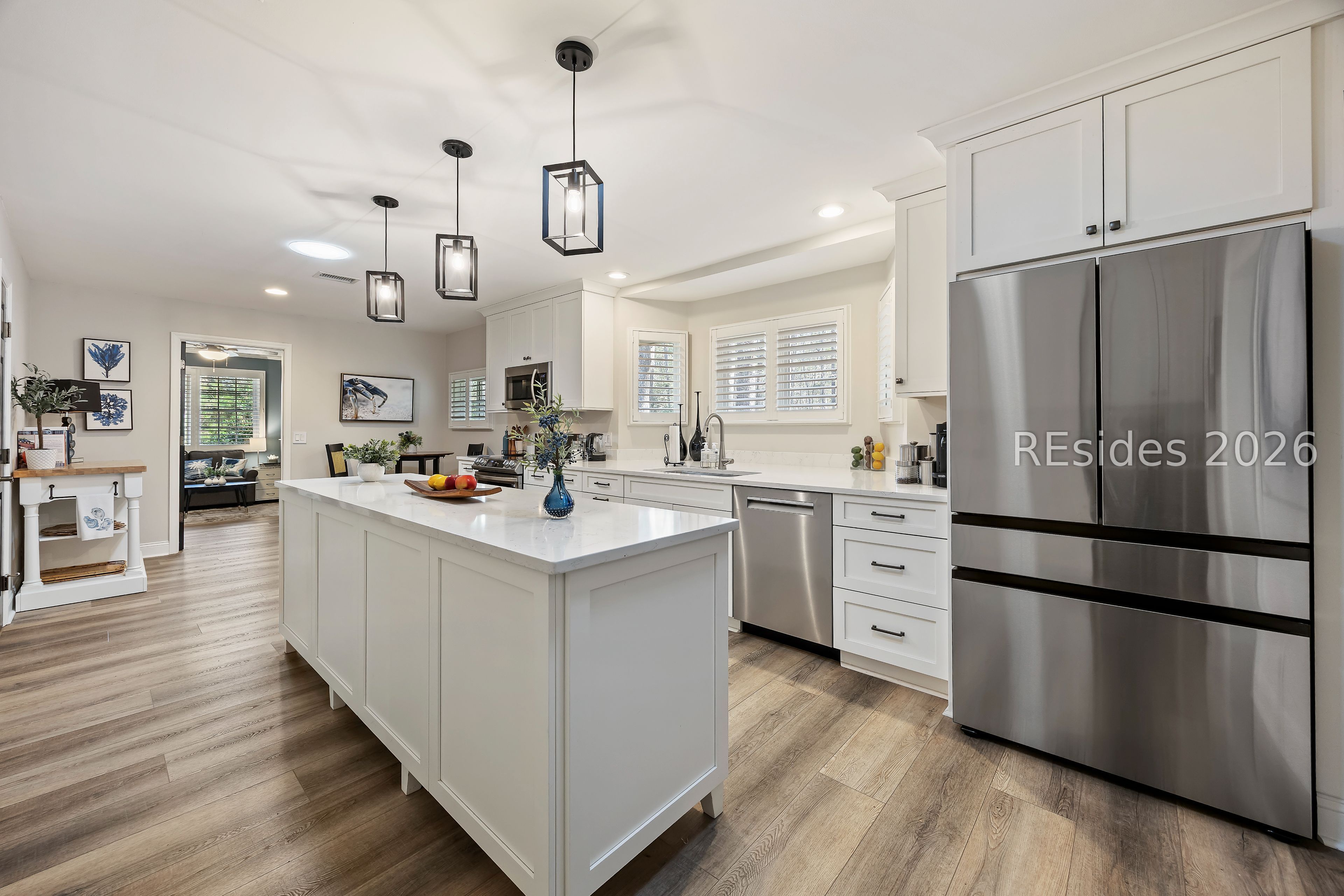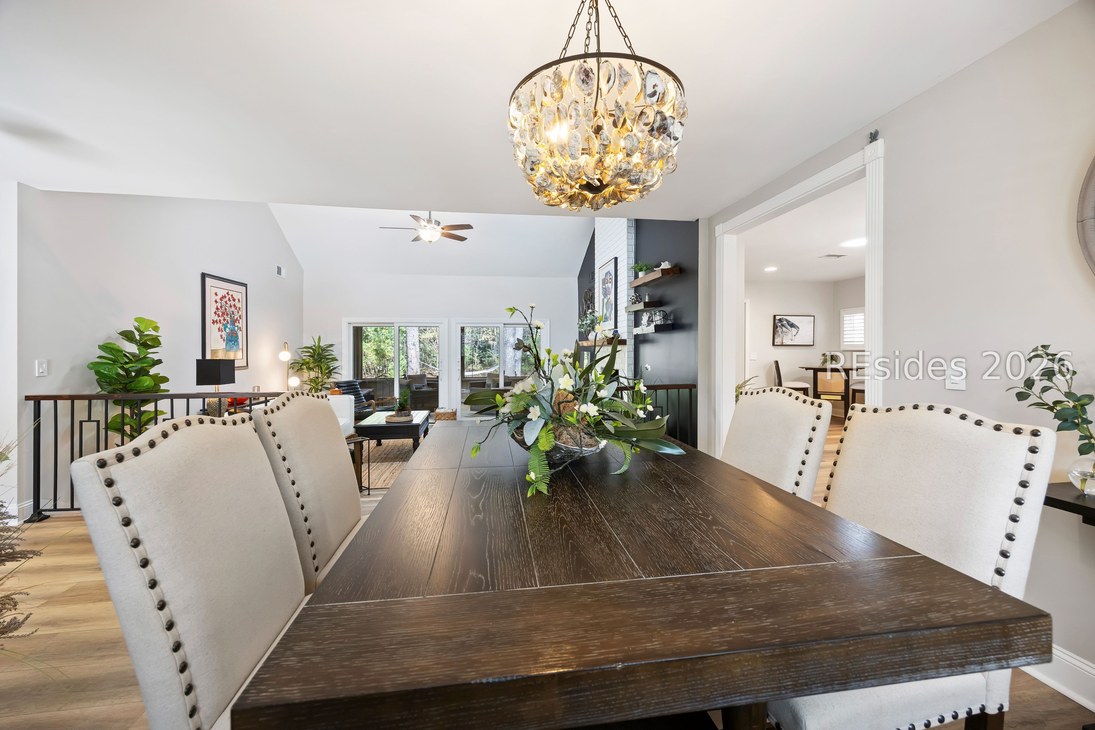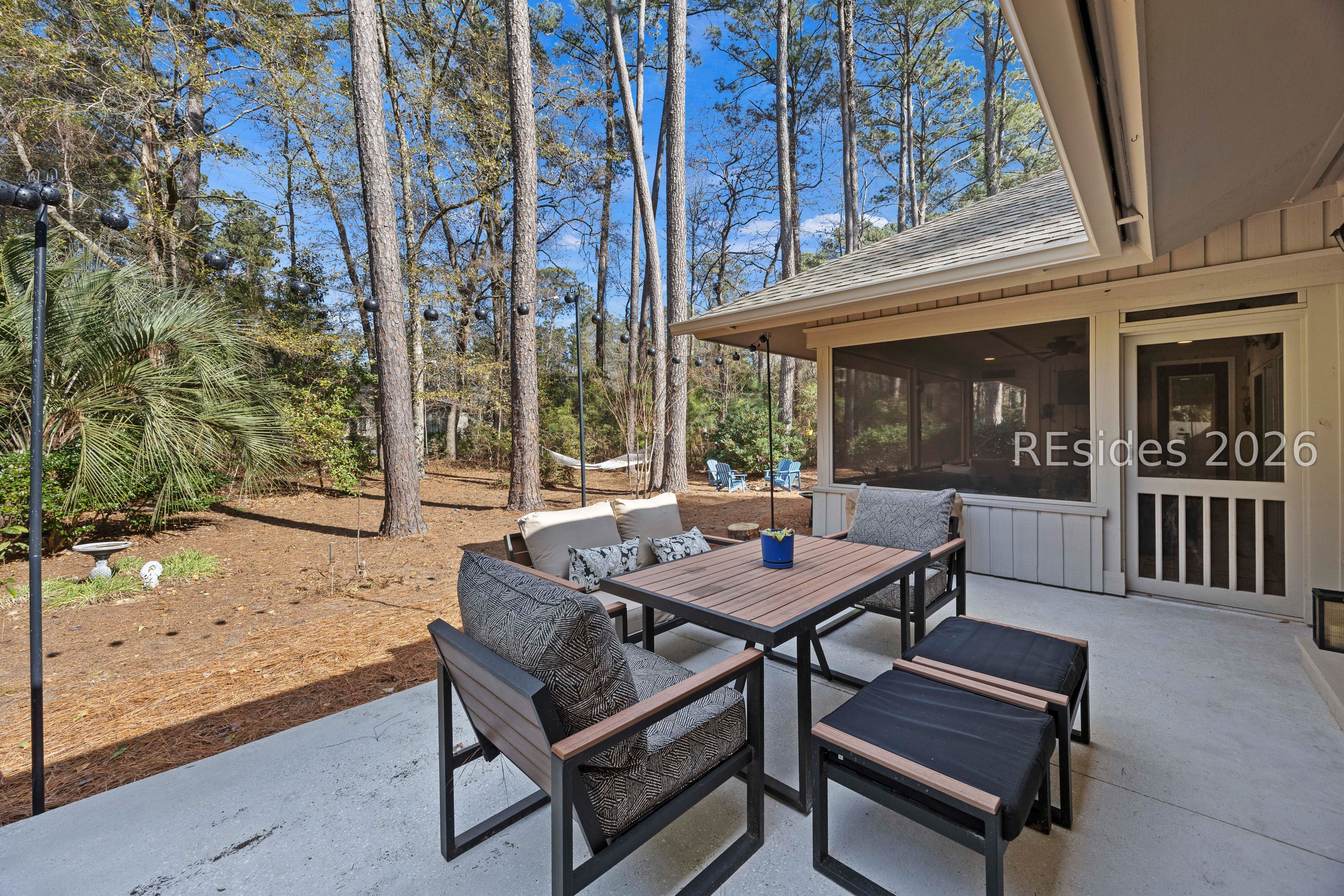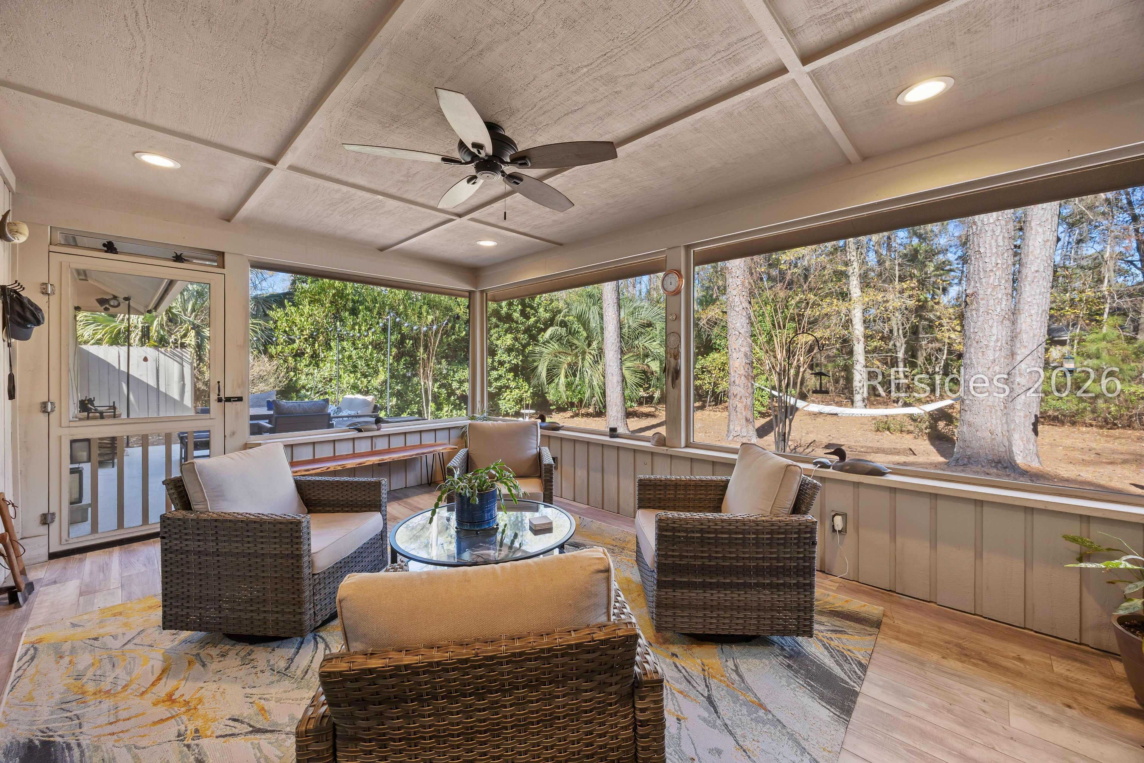 Welcome to 2 Fish Hawk! This eclectic, mid-century coastal cottage offers single-level living on an oversized lot with a peaceful wooded view. As you enter the home through the quaint front courtyard, the Mahogany front door opens to the spacious living area with cathedral ceilings and a wood burning fireplace. The updated kitchen features quartz countertops, newer cabinets, an extended island, coffee/wine bar and new appliances (refrigerator, convection oven/induction range and dishwasher). The designer inspired primary suite boasts a luxurious tiled shower, walk-in closet and a slider door that opens to its own private patio. The adjacent guest bedroom is spacious and opens to the updated 2nd bathroom. The 3rd bedroom (currently used as an office) is off of the kitchen with a private door to the large screened porch that looks out over the private natural setting. The .446 acre lot provides ample room for expansion and plenty of space for a pool. Additional recent upgrades include a 3-ton variable speed HVAC system, new 200 amp electrical panel, new lighting fixtures, solar tubes, interior paint, plantation shutters, a whole house water purifier/softener, and epoxy flooring in the oversized 1-car garage. Centrally located in amenity rich Hilton Head Plantation, within close proximity to both Spring Lake and Dolphin Head, this beautiful home is a "box checker", indeed. Most furnishings are available/negotiable. Hurry, don't wait on this one.