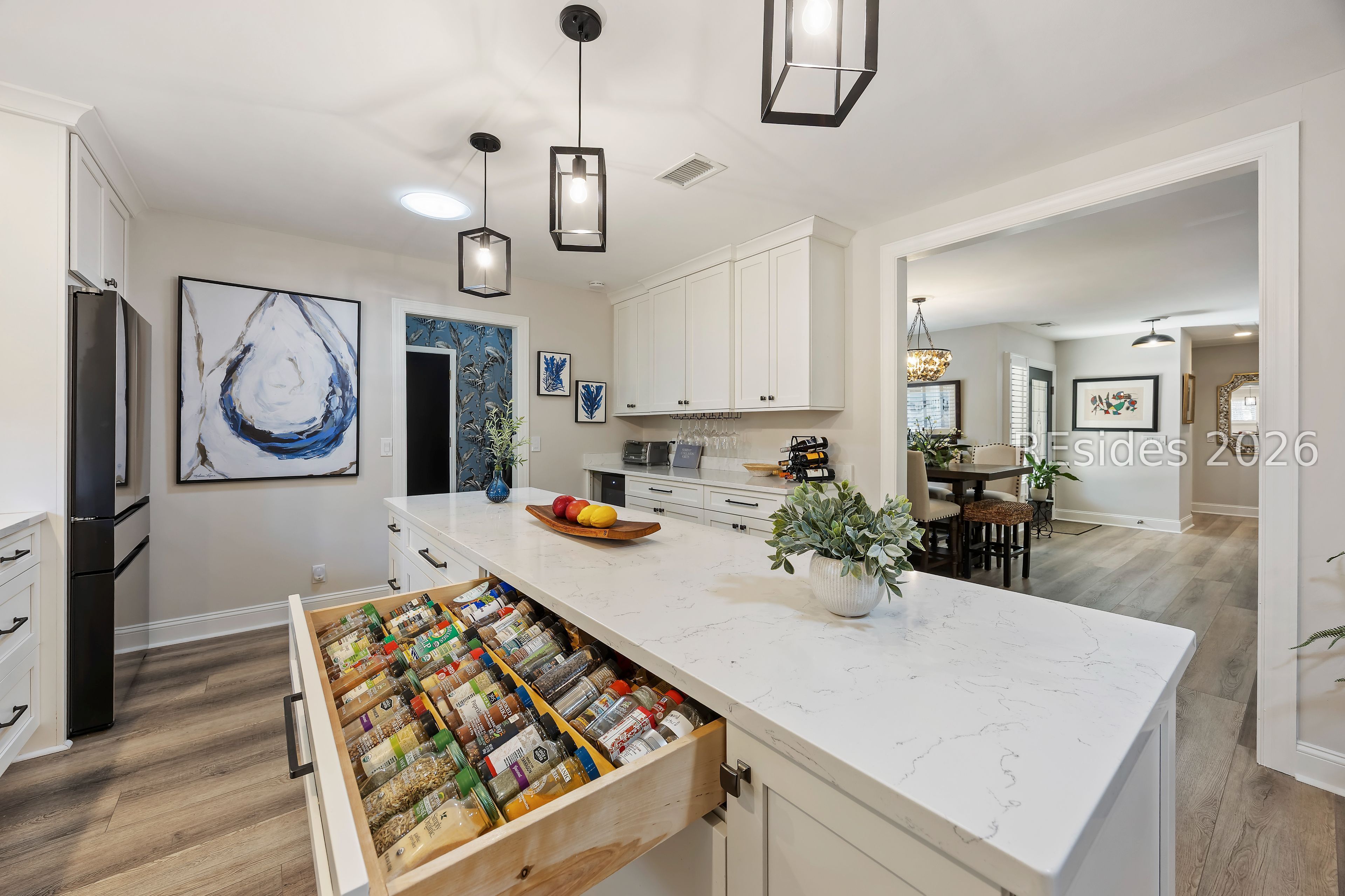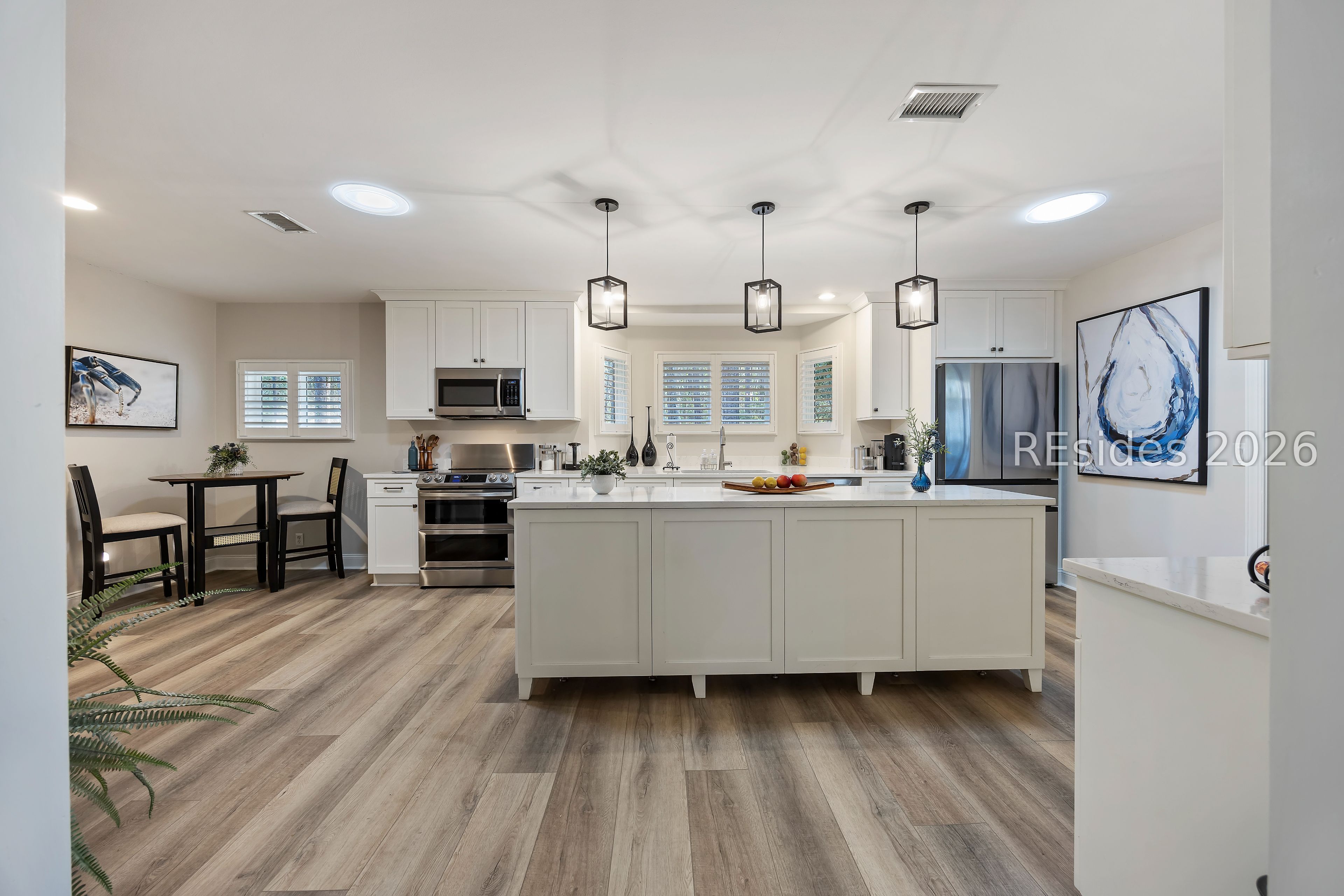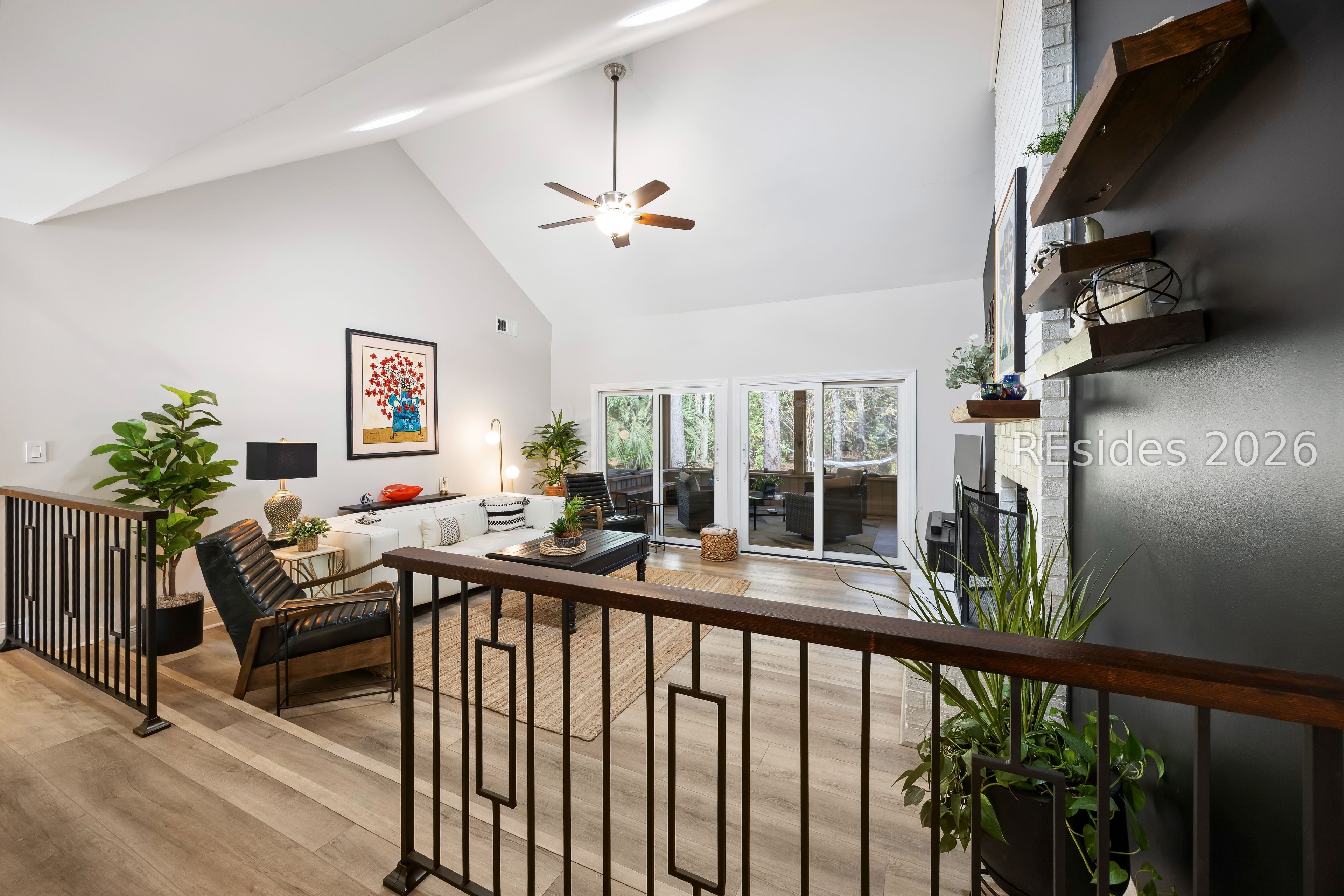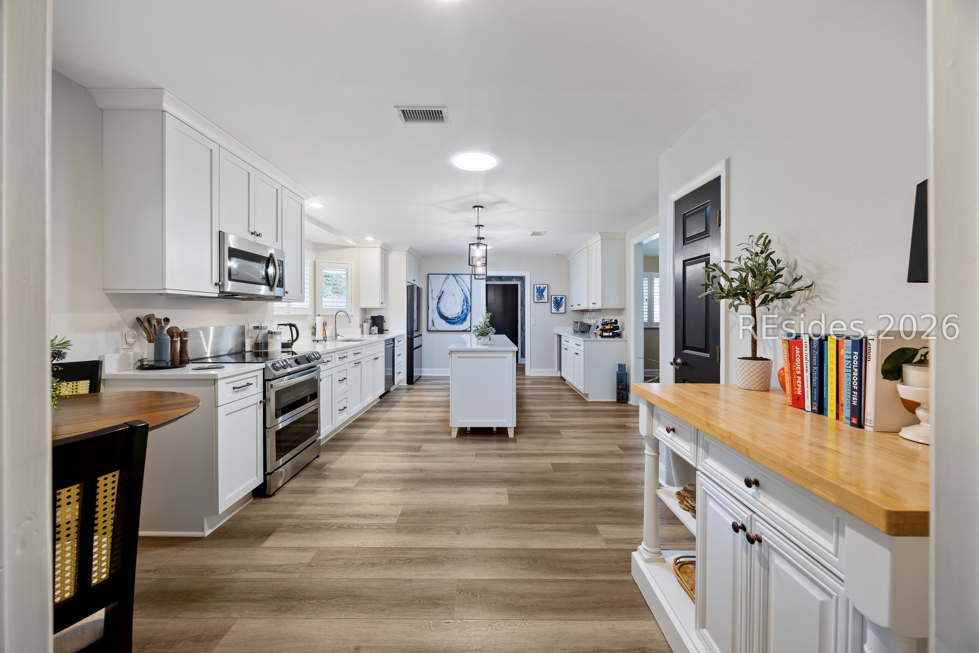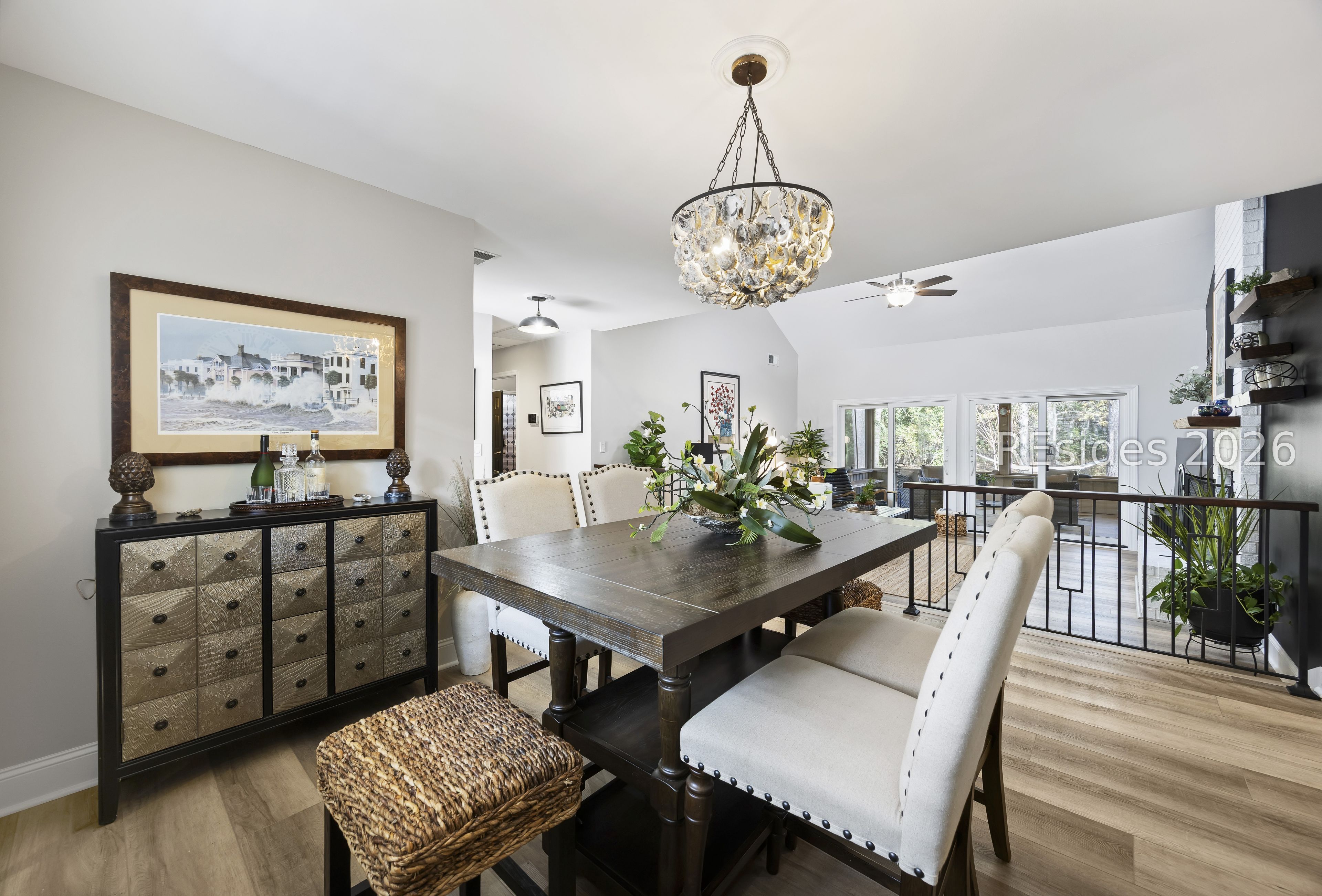 Welcome to 2 Fish Hawk! This eclectic, mid-century coastal cottage offers single-level living on an oversized lot with a peaceful wooded view. As you enter the home through the quaint front courtyard, the Mahogany front door opens to the spacious living area with cathedral ceilings and a wood burning fireplace. The updated kitchen features quartz countertops, newer cabinets, an extended island, coffee/wine bar and new appliances (refrigerator, convection oven/induction range and dishwasher). The designer inspired primary suite boasts a luxurious tiled shower, walk-in closet and a slider door that opens to its own private patio. The adjacent guest bedroom is spacious and opens to the updated 2nd bathroom. The 3rd bedroom (currently used as an office) is off of the kitchen with a private door to the large screened porch that looks out over the private natural setting. The .446 acre lot provides ample room for expansion and plenty of space for a pool. Additional recent upgrades include a 3-ton variable speed HVAC system, new 200 amp electrical panel, new lighting fixtures, solar tubes, interior paint, plantation shutters, a whole house water purifier/softener, and epoxy flooring in the oversized 1-car garage. Centrally located in amenity rich Hilton Head Plantation, within close proximity to both Spring Lake and Dolphin Head, this beautiful home is a "box checker", indeed. Most furnishings are available/negotiable. Hurry, don't wait on this one.