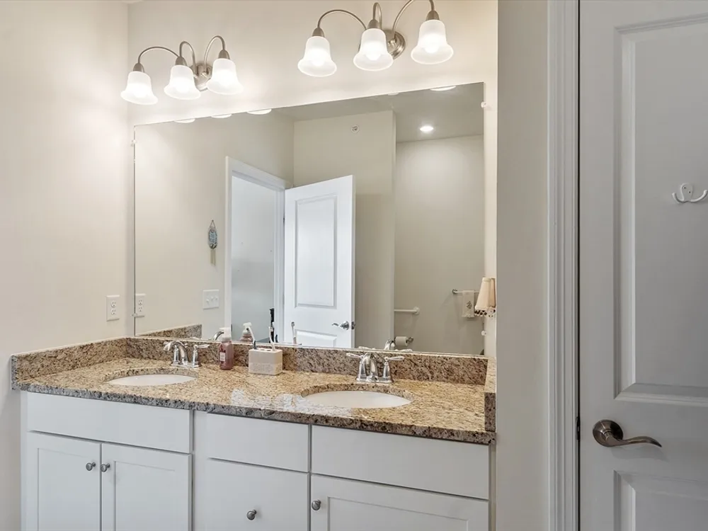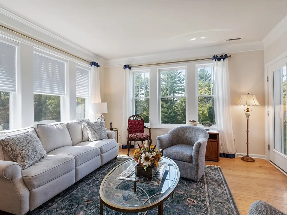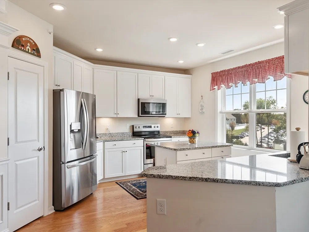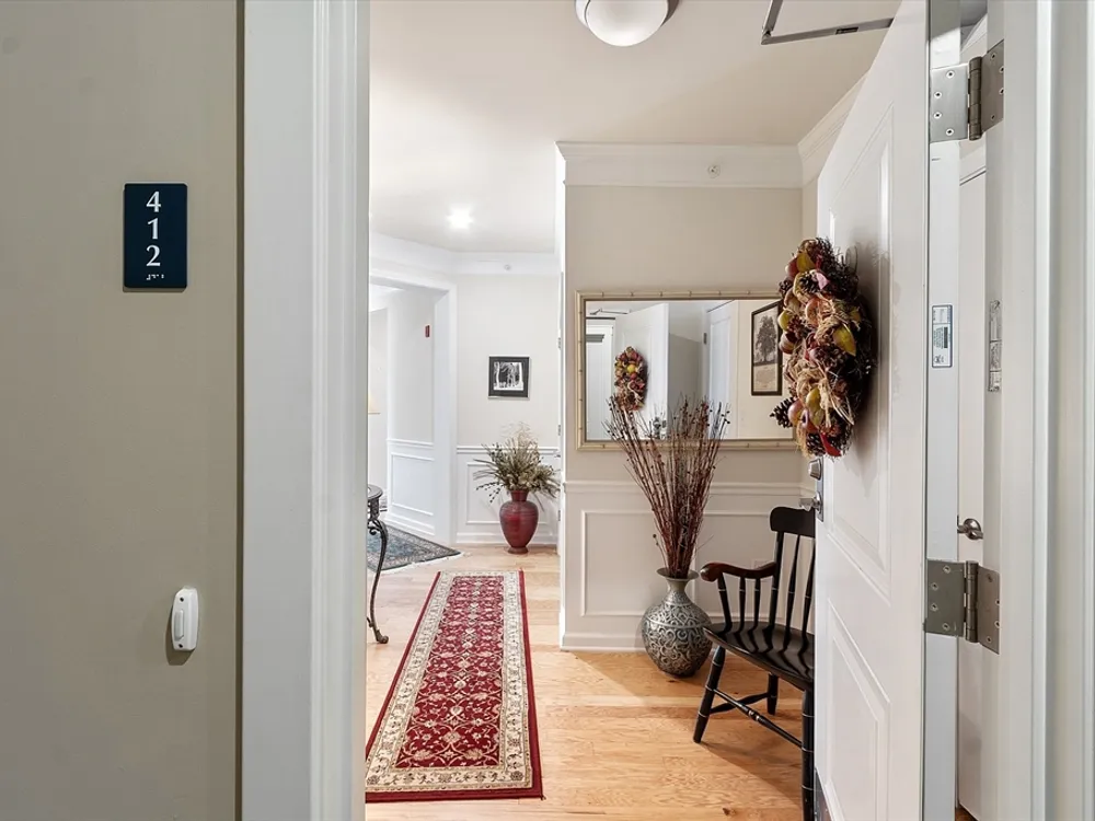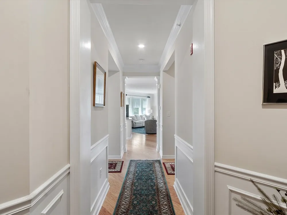 Welcome to Riverside Woods, a desirable 62+ community! This top-floor unit is filled with natural light from numerous windows and includes garage parking (#11) for your convenience. Offering 5 rooms, 2 bedrooms, and 2 full baths, this home has been meticulously maintained and feels like new. The open kitchen boasts granite counters, center island for casual meals, and stainless steel appliances. The sun filled living room with crown molding opens to a private balcony overlooking woodlands, perfect for morning coffee and quiet relaxation. The dining room is accented with wainscoting and crown molding, adding beauty and elegance. The spacious primary suite features a walk-in closet and full bath with double vanity. A second bedroom, full bath, and laundry complete the layout. Nine-foot ceilings, wood flooring, and detailed moldings and wainscoting add timeless style. Enjoy the clubhouse with fitness center, outdoor patio with grills, and scenic walking trails.