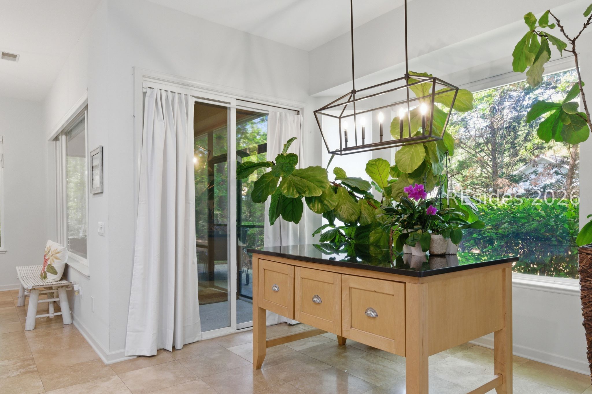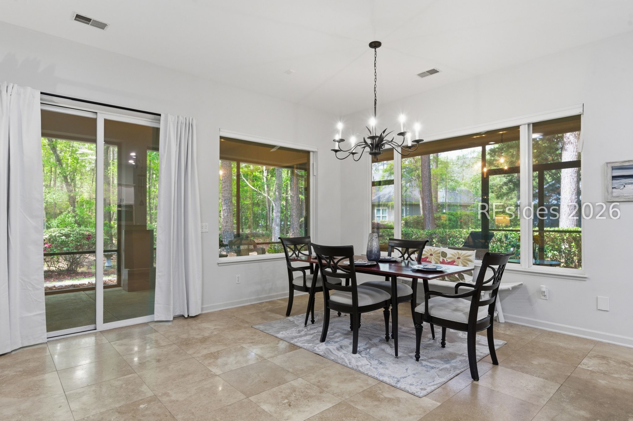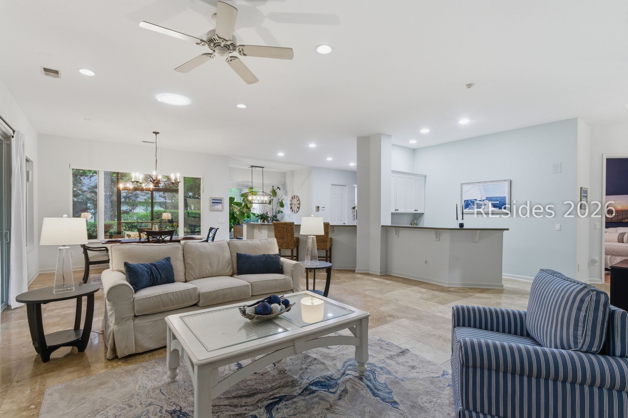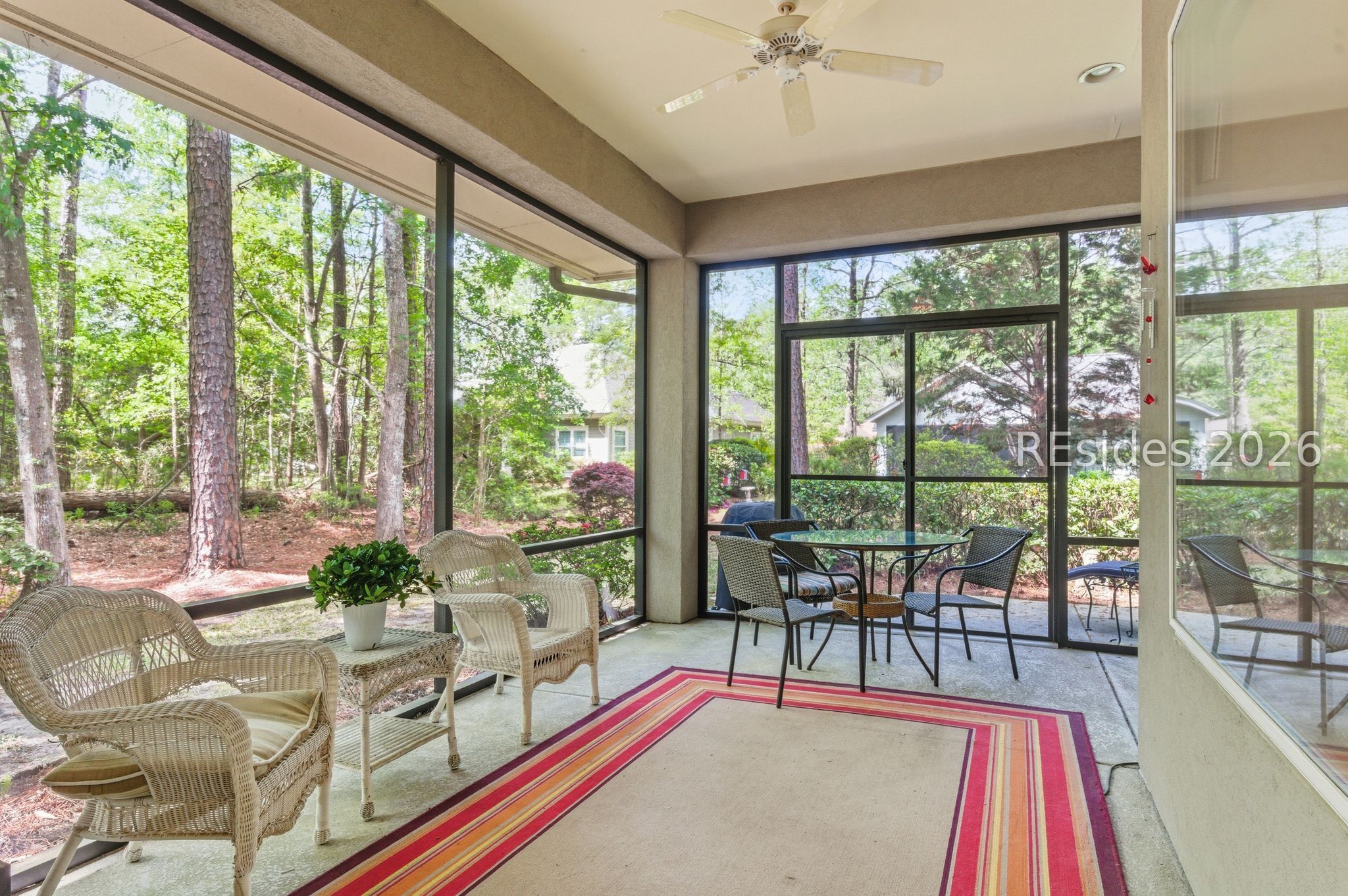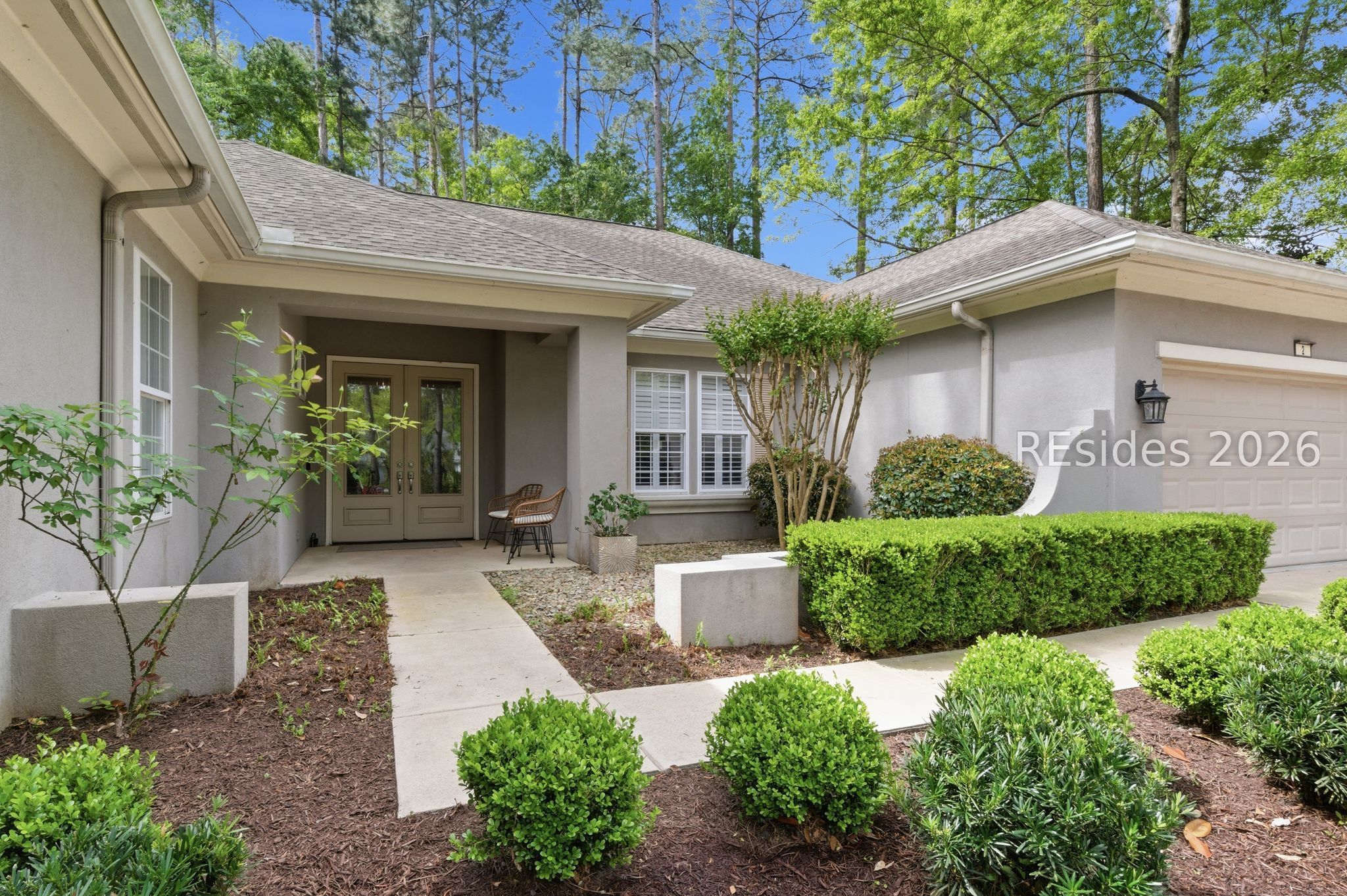 Tucked away on a quiet cul-de-sac in the highly sought-after Riverbend community of Sun City, this 2500 sqft home offers the perfect blend of natural privacy and effortless Lowcountry living! Beautiful curb appeal with welcoming courtyard entry. The spacious floor plan offers a seamless flow between living, dining, and kitchen areas to create a warm, connected feel that is perfect for entertaining. Eat in kitchen boasts stainless steel appliances, gas cooktop and double ovens. Plantation shutters, 10 foot ceilings and timeless travertine flooring enhance the beauty of this home. Primary suite has wood floors and totally remodeled bathroom ($80,000 remodel ADA compliant). Ensuite Guest room with wood floors. Large den/office or 3rd bedroom with wood floors, closet and doors offers additional flex space. Relax on the wrap around screened porch while overlooking nature preserve. Spacious 2 car garage plus golf cart bay enhance this property's appeal. Excellent value in Riverbend!!!
