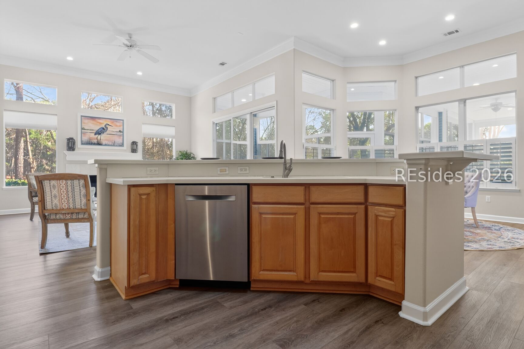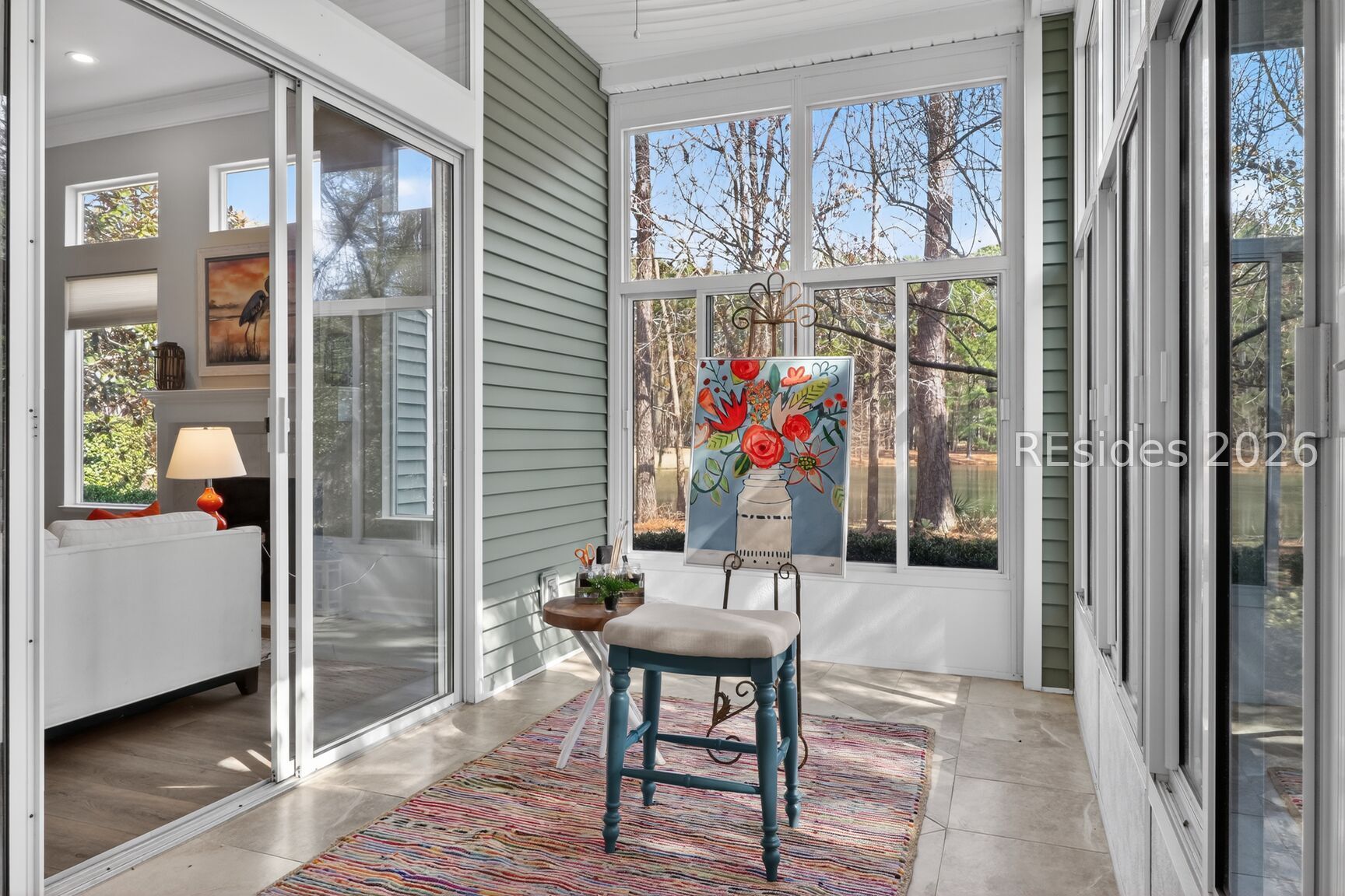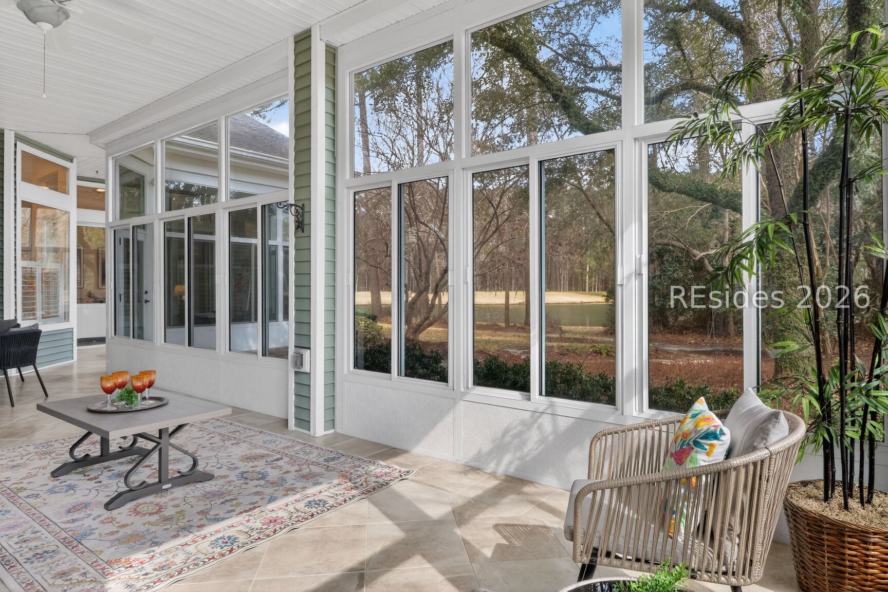 Welcome to the sought after Monroe Rutledge model in Sun City Hilton Head, a beautifully updated Del Webb estate home offering refined Lowcountry living with spectacular lagoon and golf course views. This elegant residence features soaring 12-foot ceilings and a thoughtfully designed layout perfect for both entertaining and everyday comfort. A formal living room and dining area greet you upon entry, creating an impressive space for hosting gatherings. Just off the kitchen, a more relaxed gathering room with a cozy fireplace provides the perfect setting to unwind while enjoying serene views of the lagoon and golf course. Freshly painted throughout, the home showcases brand-new luxury vinyl plank flooring and updated hardware, delivering a modern, move-in-ready feel. Natural light fills the living spaces, highlighting the home's open flow and stunning backyard vistas. Step outside to the expansive screened porch, where you can enjoy morning coffee or evening time overlooking one of the best views in Sun City. The corner lot location on a quiet cul-de-sac street offers both privacy and curb appeal. The spacious primary suite serves as a private retreat, complete with a large bedroom and ensuite bath. A comfortable guest bedroom and full bath provide accommodation for visitors, while a dedicated private office is ideal for working from home or pursuing hobbies. An additional powder room adds convenience for guests. The indoor laundry room offers everyday practicality. Car enthusiasts and golf lovers alike will appreciate the extended two-car garage plus an attached golf cart garage. Ideally located close to multiple gates and the many amenities that make Sun City Hilton Head one of the region's most sought-after active adult communities, this exceptional home combines space, style, and breathtaking views in a premier setting. Don't miss this one, this is a rare opportunity to own one of the most sought-after floor plans and locations Sun City has to offer. Sun City Hilton Head is currently undergoing a $50 million expansion. This new phase features a state-of-the-art amenity center, & a 41,000-42,000+ sq ft Clubhouse. A Two-Story Fitness Center has 15,000+ sq. ft. facility with an indoor walking track & a multi-sports court. There is a15,000 sq. ft. pool, featuring a lazy river, swim-up bar, Baja sun deck, & poolside cabanas + Indoor four-lane lap pool12 outdoor & 4 indoor pickleball courts, 3 outdoor & 2 indoor tennis courts and so much more!