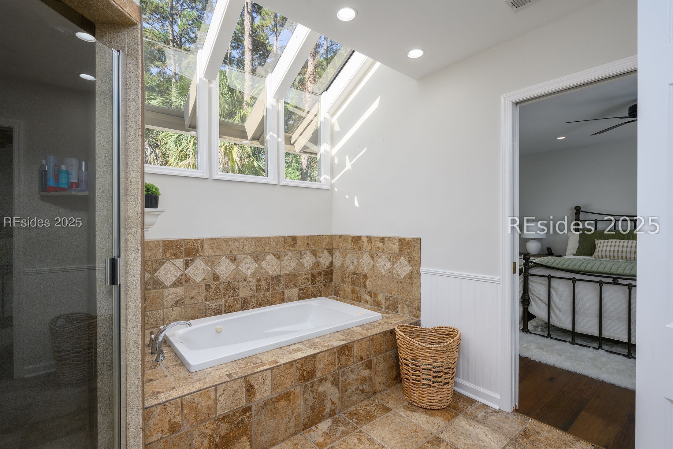 - Attic Access, Ceiling Fan(s), Fireplace, Jetted Tub, Main Level Primary, Pull Down Attic Stairs, Smooth Ceilings, Separate Shower, Cable TV, Window Treatments, Entrance Foyer, Eat-in Kitchen, Pantry