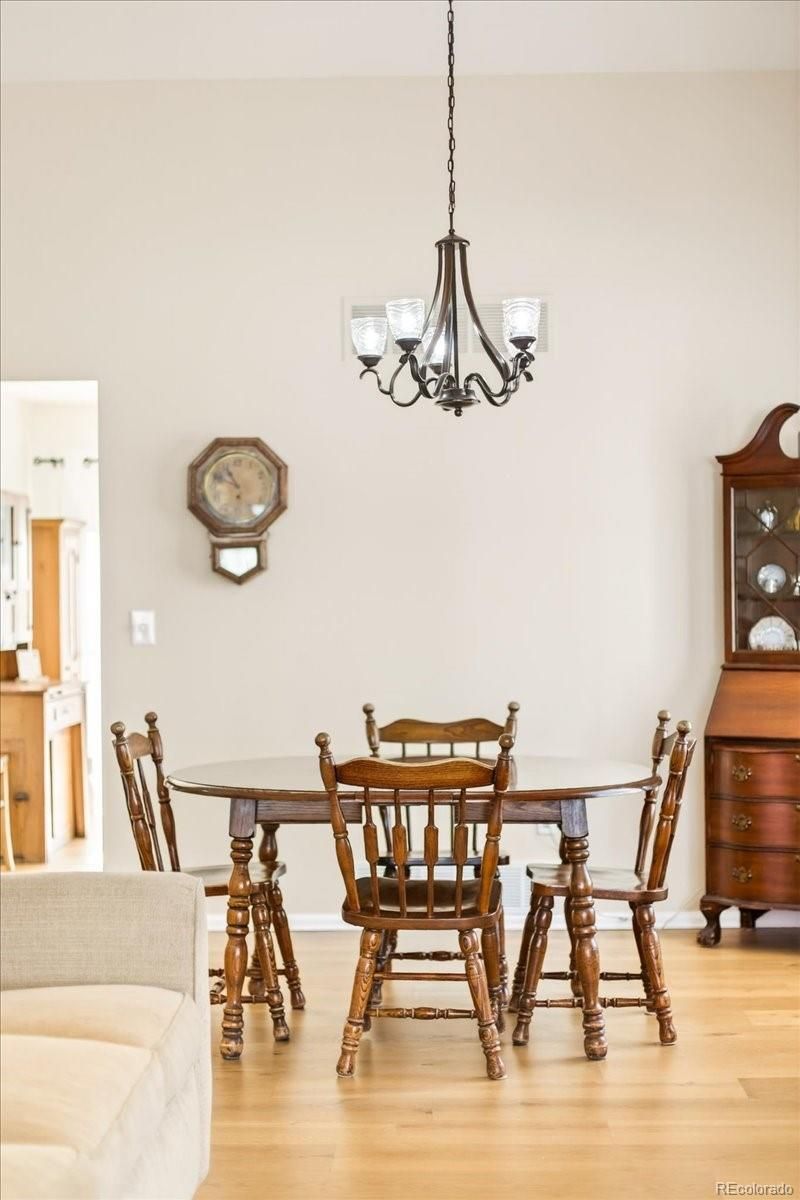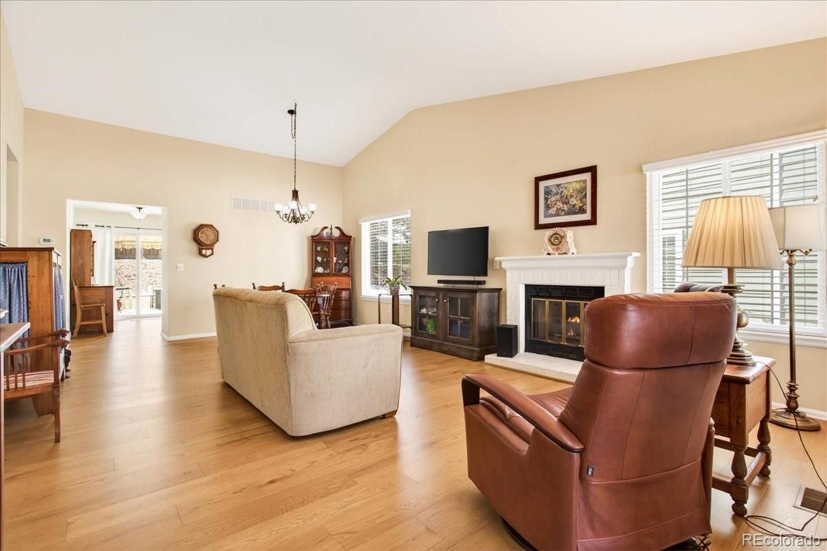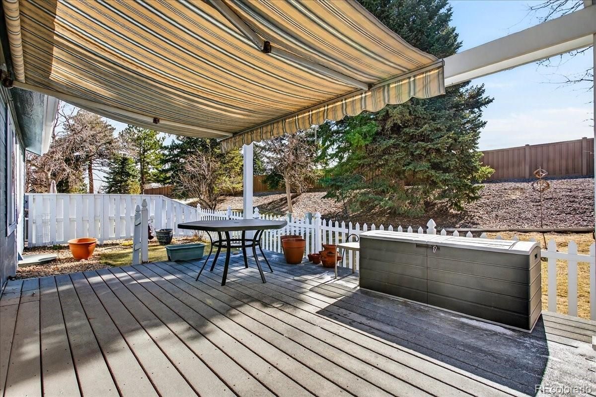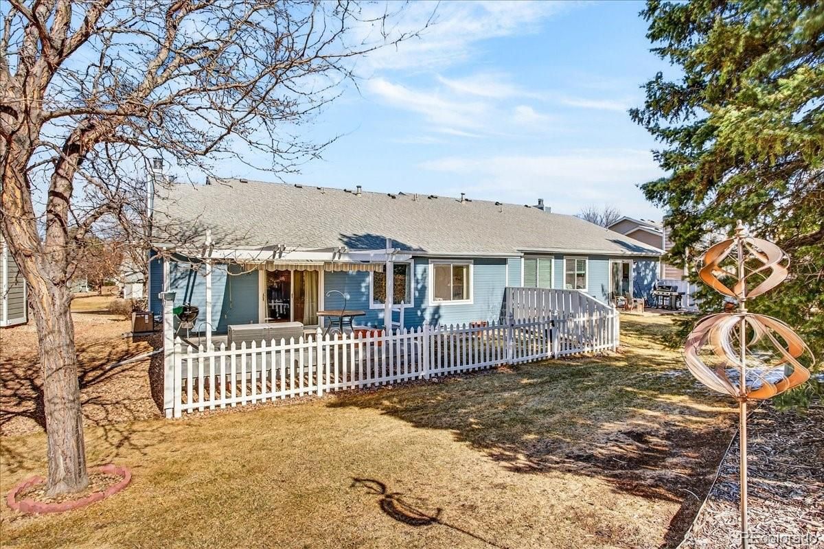 Welcome to this beautifully maintained duplex in Gleneagles Village, a gated 55+ active adult community in Highlands Ranch! A quiet location with a fully fenced private backyard, this one-level home features an open & efficient floor plan allowing for easy flow between the living areas. Step inside to find an office/den leading to the vaulted living room featuring an inviting gas fireplace surrounded by windows. Very sunny & bright! Adjacent is the formal dining area. The eat-in kitchen is fitted with white cabinetry/pantry paired with black Granite counters. From here step out to the TREX deck to enjoy dinners al fresco, in view of a white picket fence and occasional passing deer. The motorized awning will keep you cool as the sun sets. Retire to the sunny Primary suite with 4-piece bath--stone vanity with dual porcelain sinks, walk-in cedar closet & built-in storage. There is a guest bedroom on the main with full bath featuring a jetted soaking tub & stone vanity w/ porcelain sink, tiled stone floor. All very well appointed. Laundry closet on the main. The basement has a workshop and plenty of storage. Gleneagles Village offers an active lifestyle with use of the community clubhouse & pool, park, and a variety of community activities, along with access to all 4 HRCA rec centers. Enjoy low-maintenance living with the HOA taking care of landscaping (lawn mowing/shrub & tree care/sprinkler repair), exterior maintenance/painting with roof, and snow removal. You have a convenient location close to shopping, restaurants, and Highlands Ranch amenities. This property lives like a single-family home yet you have easy living with built-in opportunities for an active lifestyle. Welcome to your new chapter!