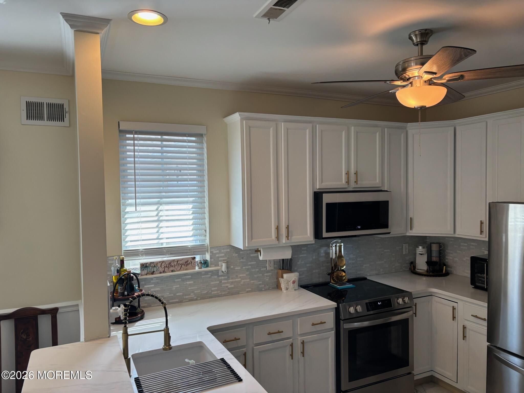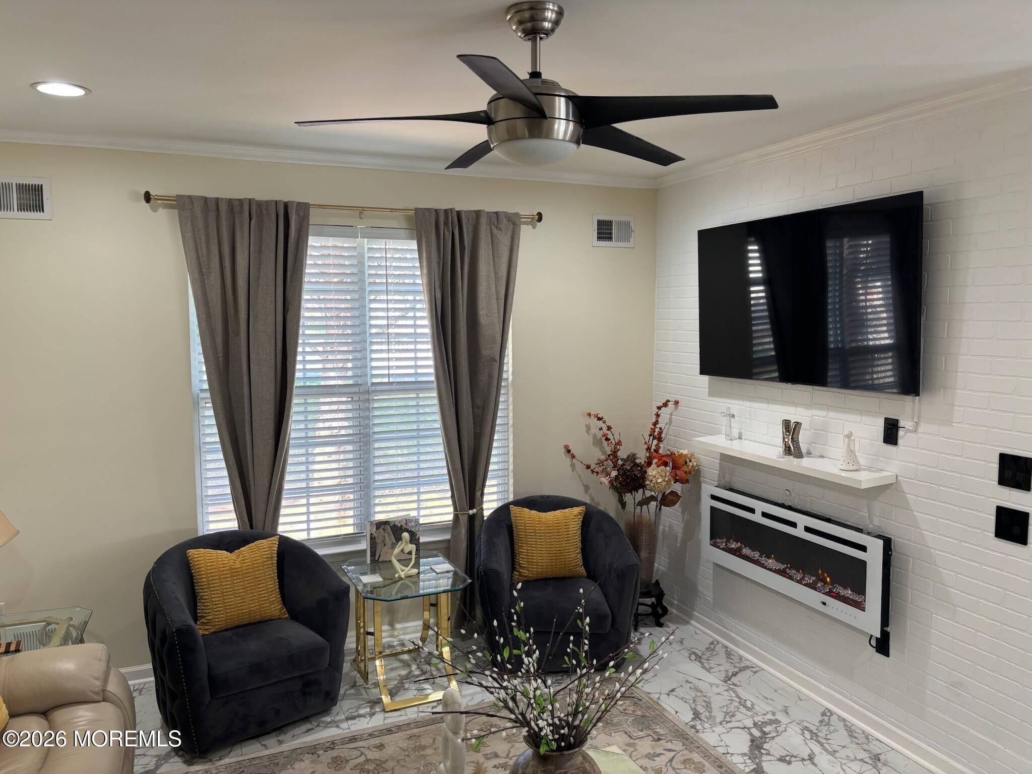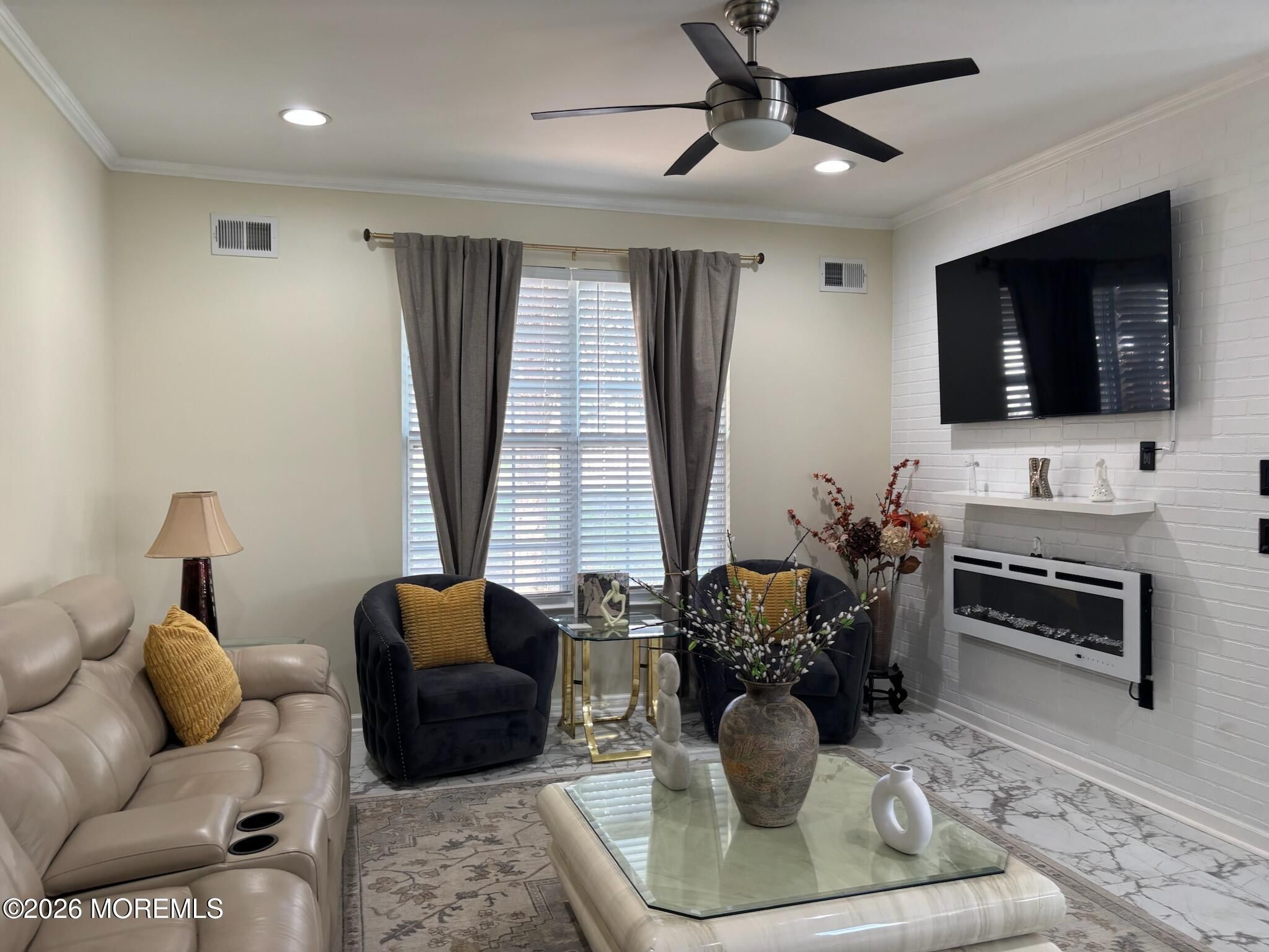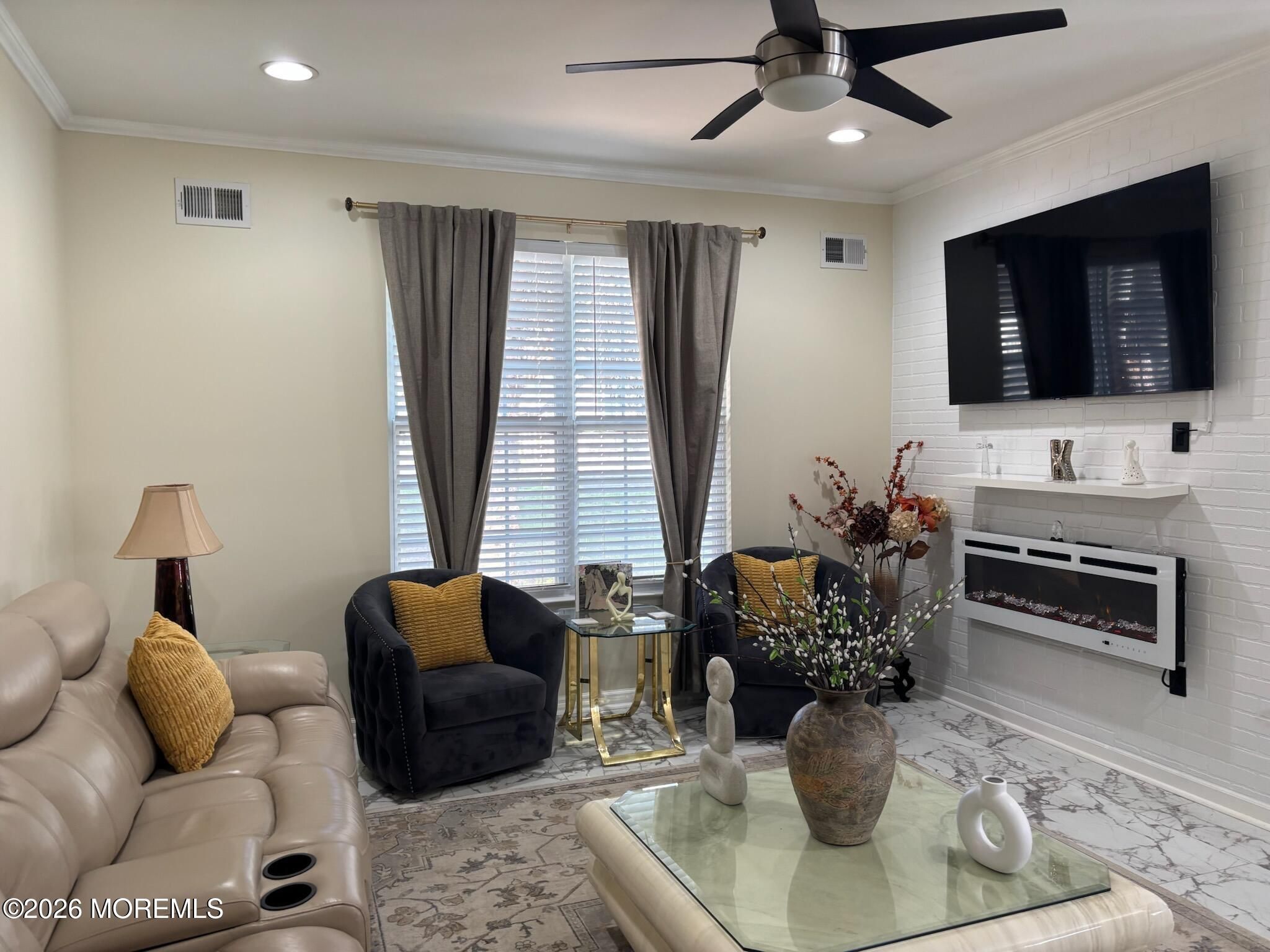 Simply unpack an start enjoying comfortable, easy living today. Welcome to Country Walk 55+ community. This beautifully upgraded Devon model is truly move-in ready with nothing left to do. Enjoy a large side patio complete with patio furniture and barbecue, plus a Bella storm door entry. Inside, you'll find upgraded flooring throughout, crown molding, recessed lighting, and ceiling fans. Both bathrooms have been fully remodeled, including a primary bath with a walk-in shower. The kitchen shines with updated cabinets, new countertop, hardware, and brand-new appliances, including a D/W slide in conventional oven, microwave, W/D. The living room features a wall-mounted electric fireplace to enjoy. All wood blinds, custom shades, and window treatments are included. Furniture is also included for an easy transition. This private back unit offers peaceful living while still enjoying the community's active clubhouse, outdoor pool, tennis court, and numerous activities. Conveniently located near major shopping, with Jersey Shore beaches just 30 mins away. Stop by today you will. not be disappointed.