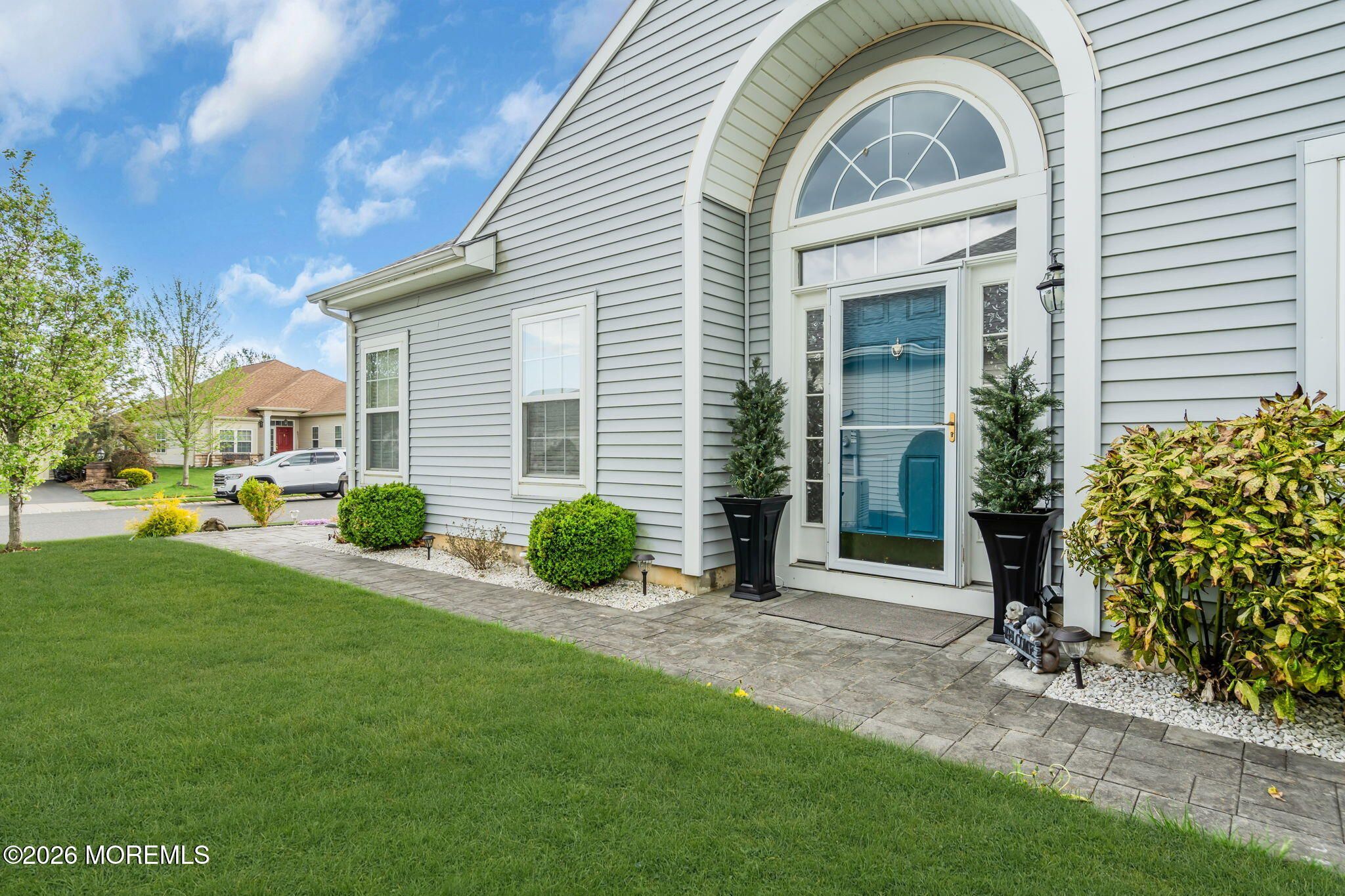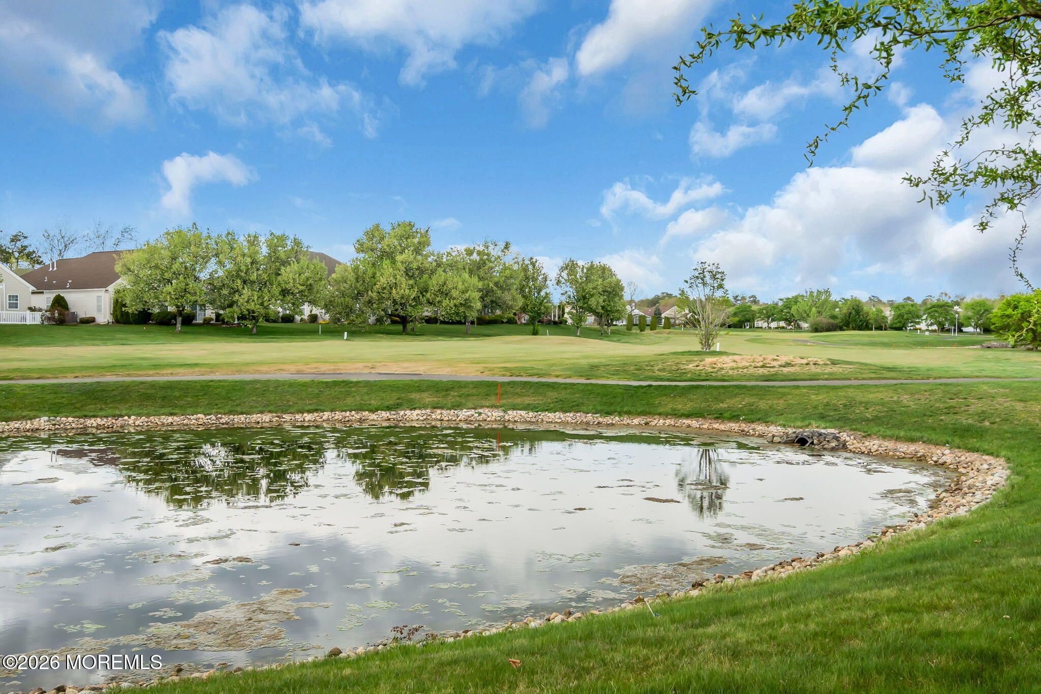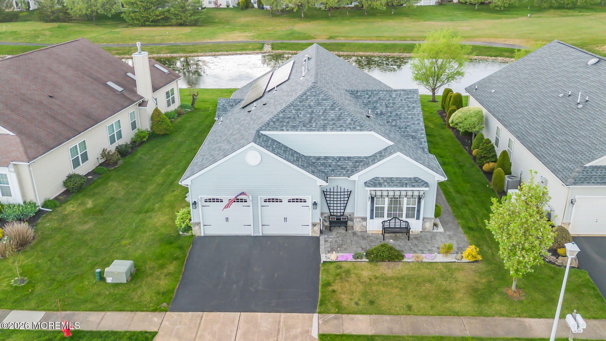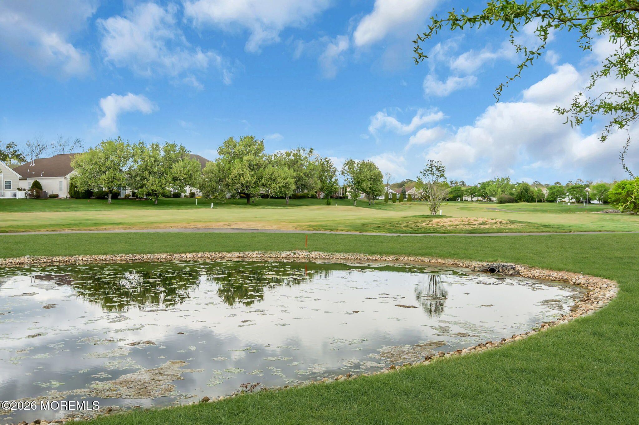 Waterfront living at its finest! Don't miss this exceptional 2-bedroom, 2-bath Extended Byron, perfectly positioned on the water across from the 13th hole, complete with a 2-car garage. A grand arched transom entry welcomes you into a home featuring rich hardwood floors, elegant crown molding, and stunning sightlines that draw your eye straight to the water. The beautifully updated kitchen showcases high-end granite countertops, stainless steel appliances, and raised-panel cabinetry accented by subway tile that extends to the ceiling for a striking finish. Sliding doors lead to an expansive paver patio, complete with lush landscaping and a pergola--perfect for relaxing, entertaining, and enjoying peaceful water views while watching golfers pass by. This home offers added value with a newer HVAC system, a new roof, and solar panels with a low $45/month lease, helping keep energy costs down. The sunroom provides a serene retreat with picturesque water views--ideal for morning coffee or unwinding with a good book. The spacious primary suite features hardwood flooring and a unique architectural 5-foot bump-out, adding depth and a touch of luxury. A versatile sitting room offers flexibility as a home office or additional living space. Immaculately maintained and truly move-in ready, this home is located in a highly desirable 55+ community offering resort-style amenities, including golf, indoor and outdoor pools, bocce, pickleball, and tennis. The clubhouse features a library, ballroom, deli, dining options, billiards, card rooms, and a state-of-the-art fitness center--everything you need for an active and vibrant lifestyle.