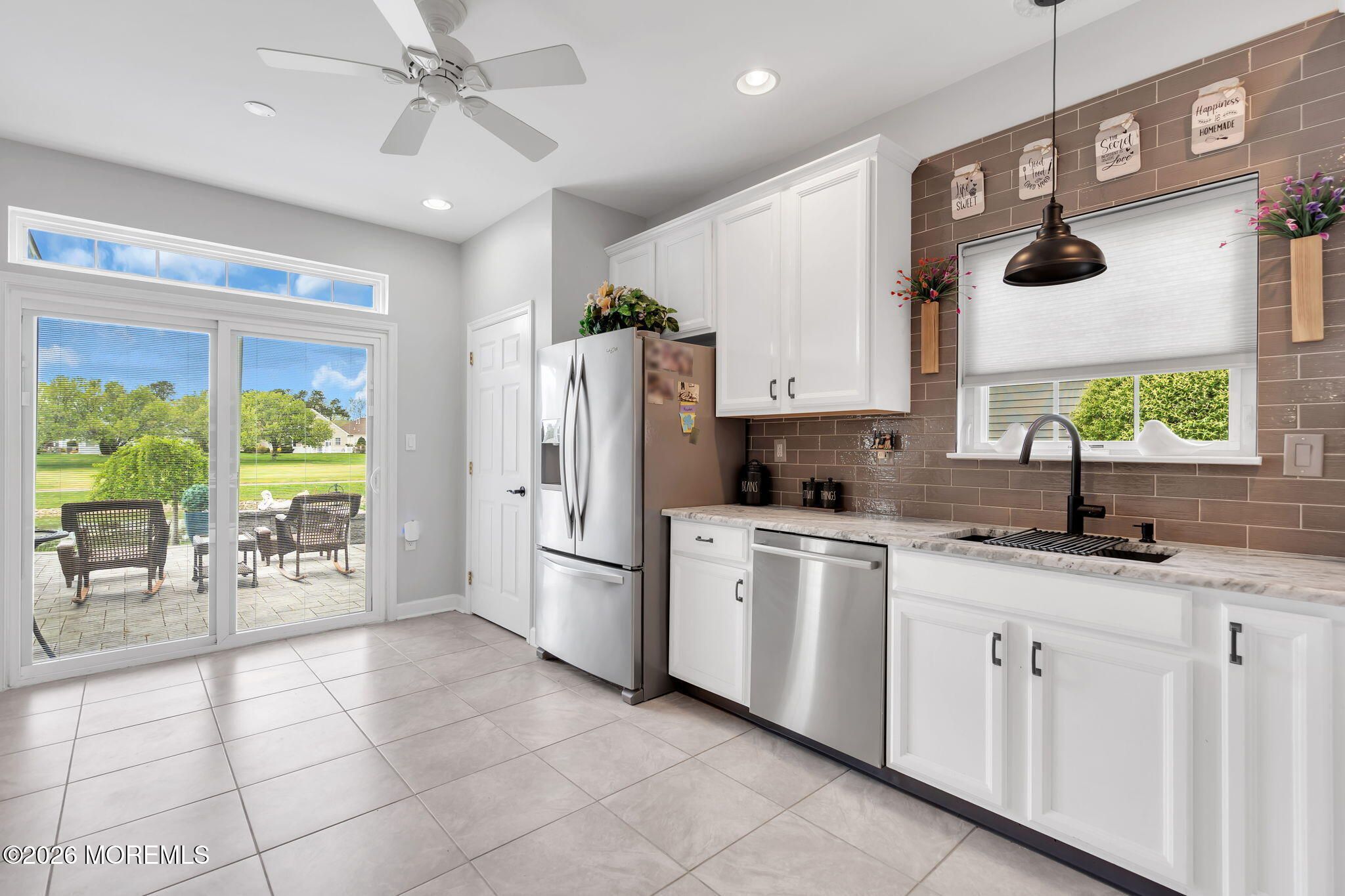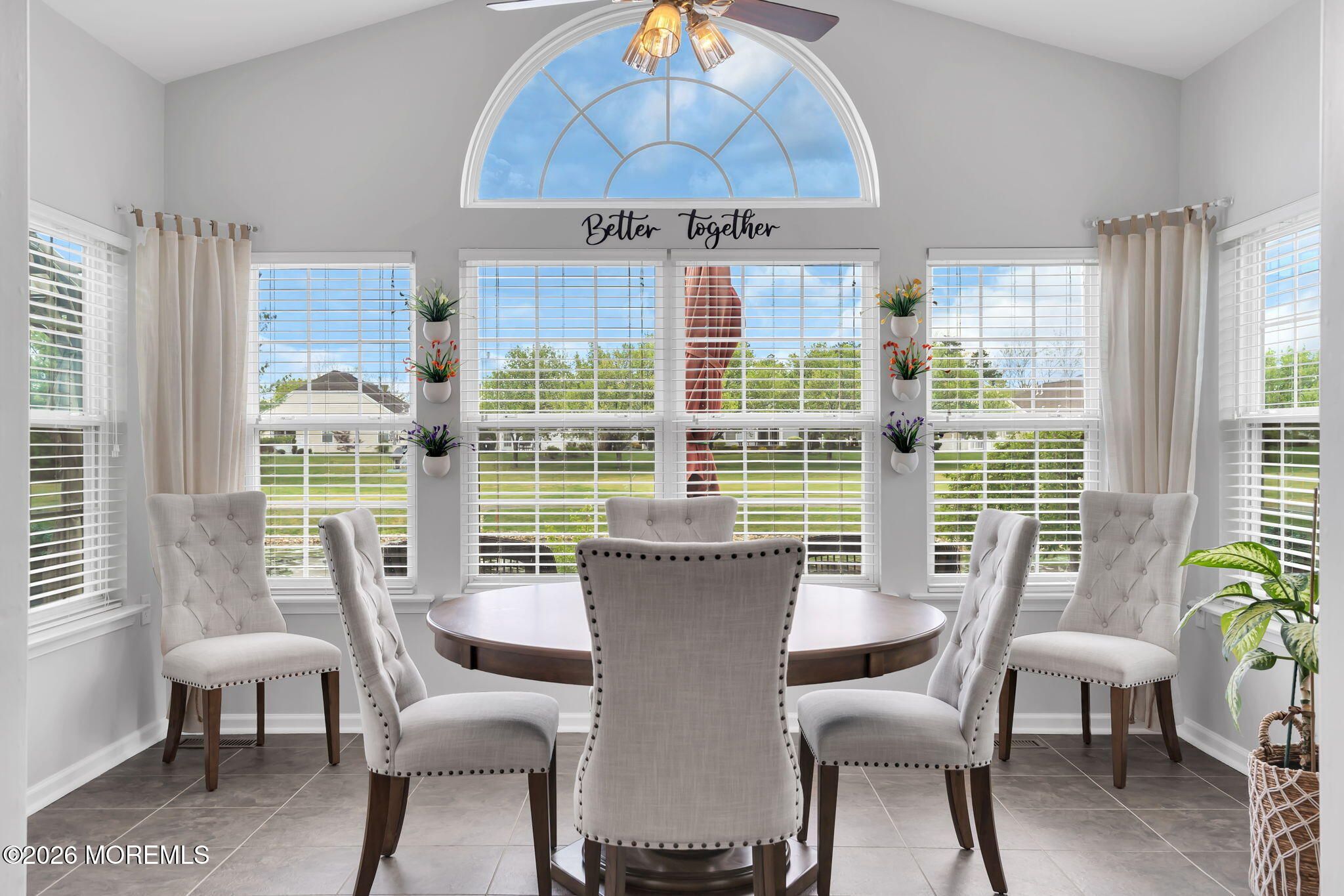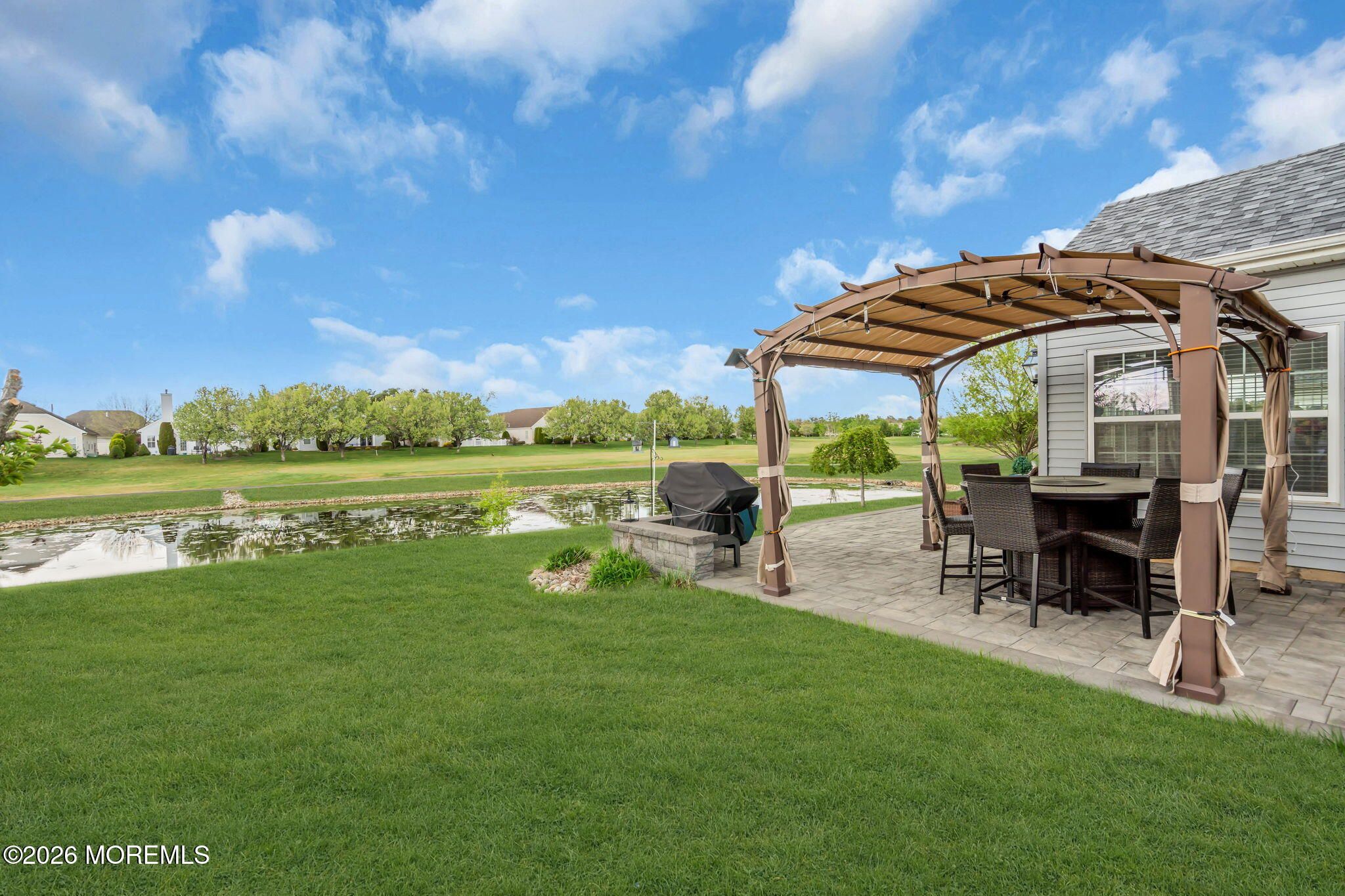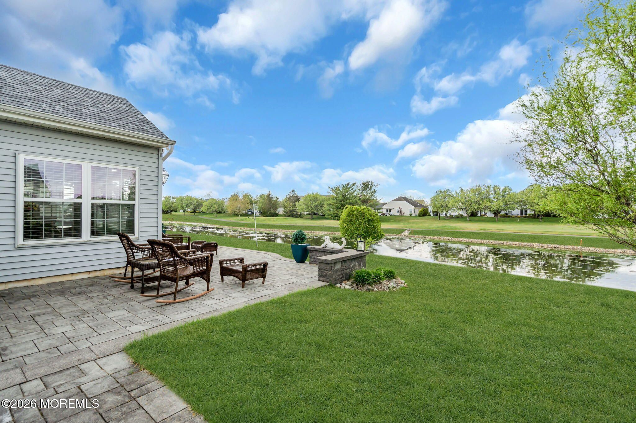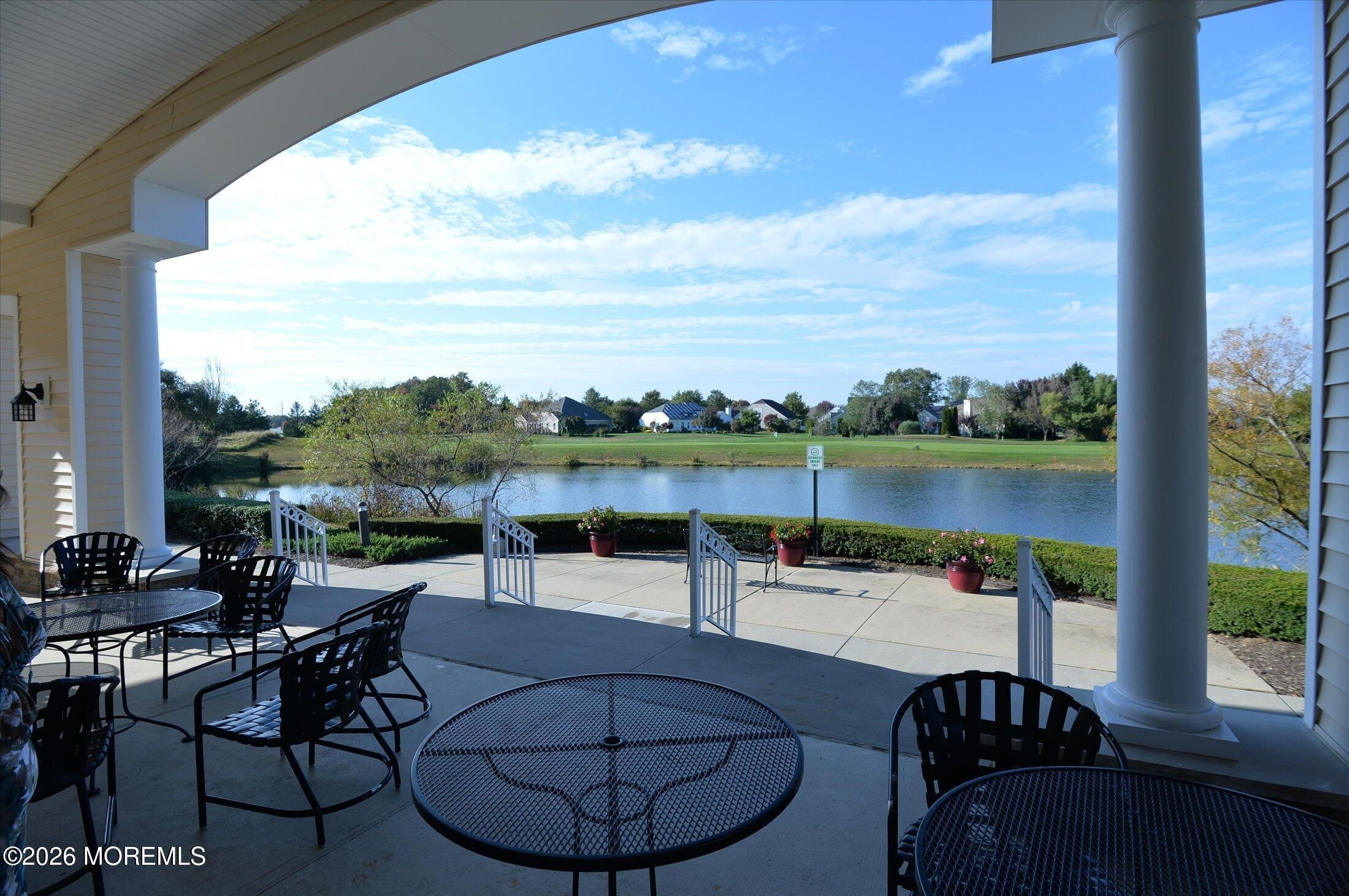 Waterfront living at its finest! Don't miss this exceptional 2-bedroom, 2-bath Extended Byron, perfectly positioned on the water across from the 13th hole, complete with a 2-car garage. A grand arched transom entry welcomes you into a home featuring rich hardwood floors, elegant crown molding, and stunning sightlines that draw your eye straight to the water. The beautifully updated kitchen showcases high-end granite countertops, stainless steel appliances, and raised-panel cabinetry accented by subway tile that extends to the ceiling for a striking finish. Sliding doors lead to an expansive paver patio, complete with lush landscaping and a pergola--perfect for relaxing, entertaining, and enjoying peaceful water views while watching golfers pass by. This home offers added value with a newer HVAC system, a new roof, and solar panels with a low $45/month lease, helping keep energy costs down. The sunroom provides a serene retreat with picturesque water views--ideal for morning coffee or unwinding with a good book. The spacious primary suite features hardwood flooring and a unique architectural 5-foot bump-out, adding depth and a touch of luxury. A versatile sitting room offers flexibility as a home office or additional living space. Immaculately maintained and truly move-in ready, this home is located in a highly desirable 55+ community offering resort-style amenities, including golf, indoor and outdoor pools, bocce, pickleball, and tennis. The clubhouse features a library, ballroom, deli, dining options, billiards, card rooms, and a state-of-the-art fitness center--everything you need for an active and vibrant lifestyle.