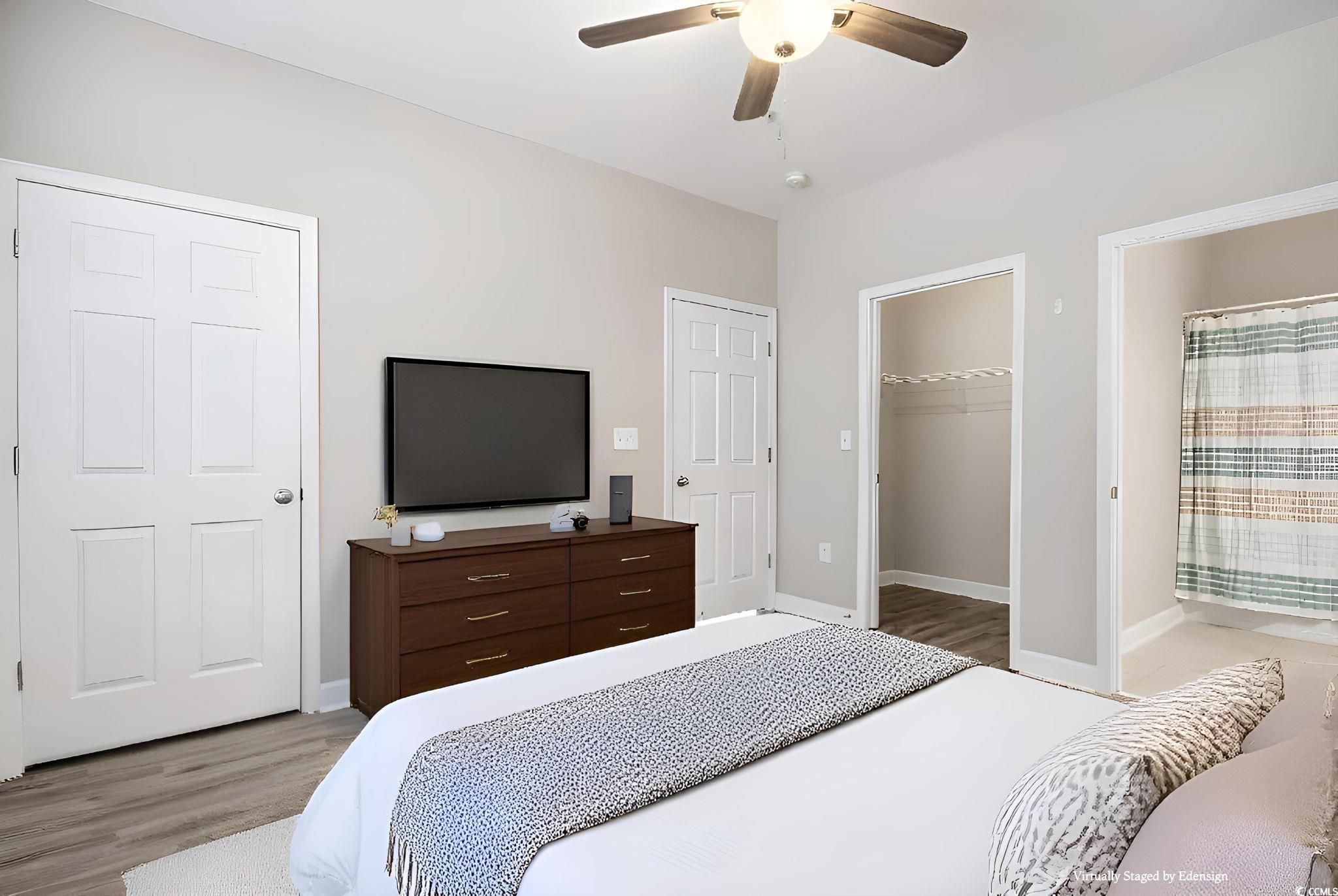 - Ceiling Fan(s), Entrance Foyer, Main Level Primary, Split Bedrooms, Tub Shower, Walk-In Closet(s), Window Treatments, Breakfast Bar, Solid Surface Counters