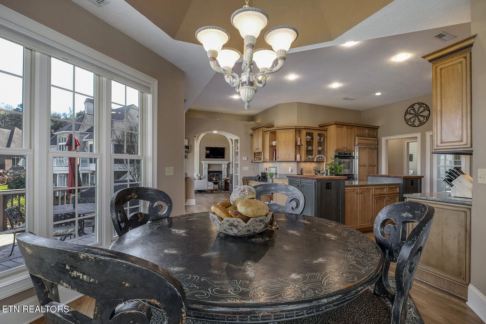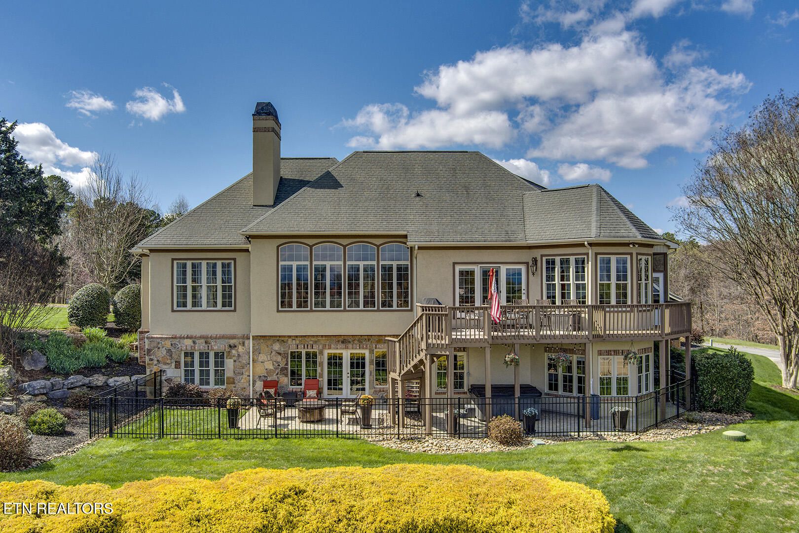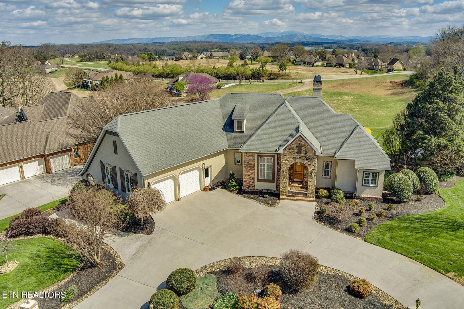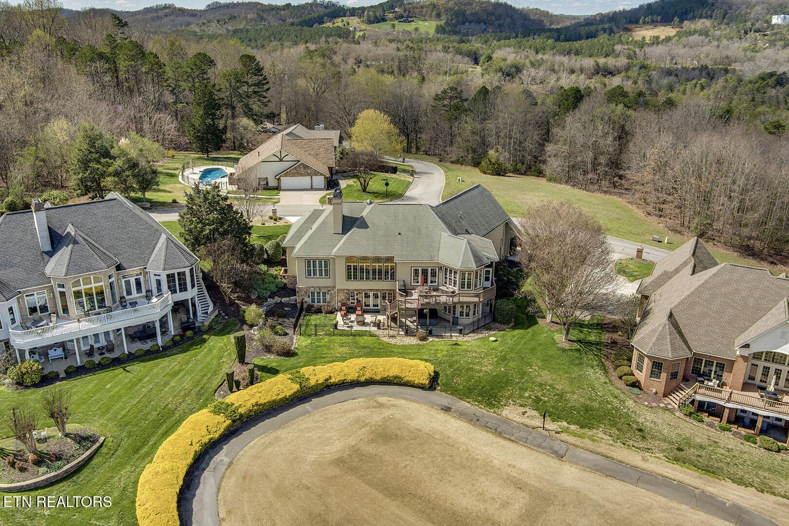 Custom Luxury Golf Course Home with Stunning 180° Mountain Views with an optional membership to the country club. Experience exceptional craftsmanship and timeless elegance in this custom-built, high-end home perfectly positioned on the golf course, offering breathtaking 180-degree mountain views. The main level features a thoughtfully designed layout including the primary suite and spa-like bath, great room, formal dining room, kitchen, sitting room, bar, and breakfast room. Enjoy outdoor living with both a screened-in deck and open deck, plus a spacious 2.5-car garage. Interior highlights include finished-in-place hardwood floors, soaring coffered ceilings, extensive crown molding, timber beam accents, and large windows that capture the incredible views. The gourmet kitchen is equipped with GE Monogram appliances, granite countertops throughout, and custom cutting board surfaces. The primary suite offers generous his-and-hers walk-in closets and abundant built-ins. Additional features include 2x6 exterior walls for enhanced efficiency, a main-level HVAC system (2016), and a roof replaced in 2012. The lower level expands your living space with two large bedrooms, a full bath, family room, wine room, study, card room with kitchenette, golf cart garage, and ample storage. This one-of-a-kind property combines luxury, comfort, and unbeatable views--a must see!