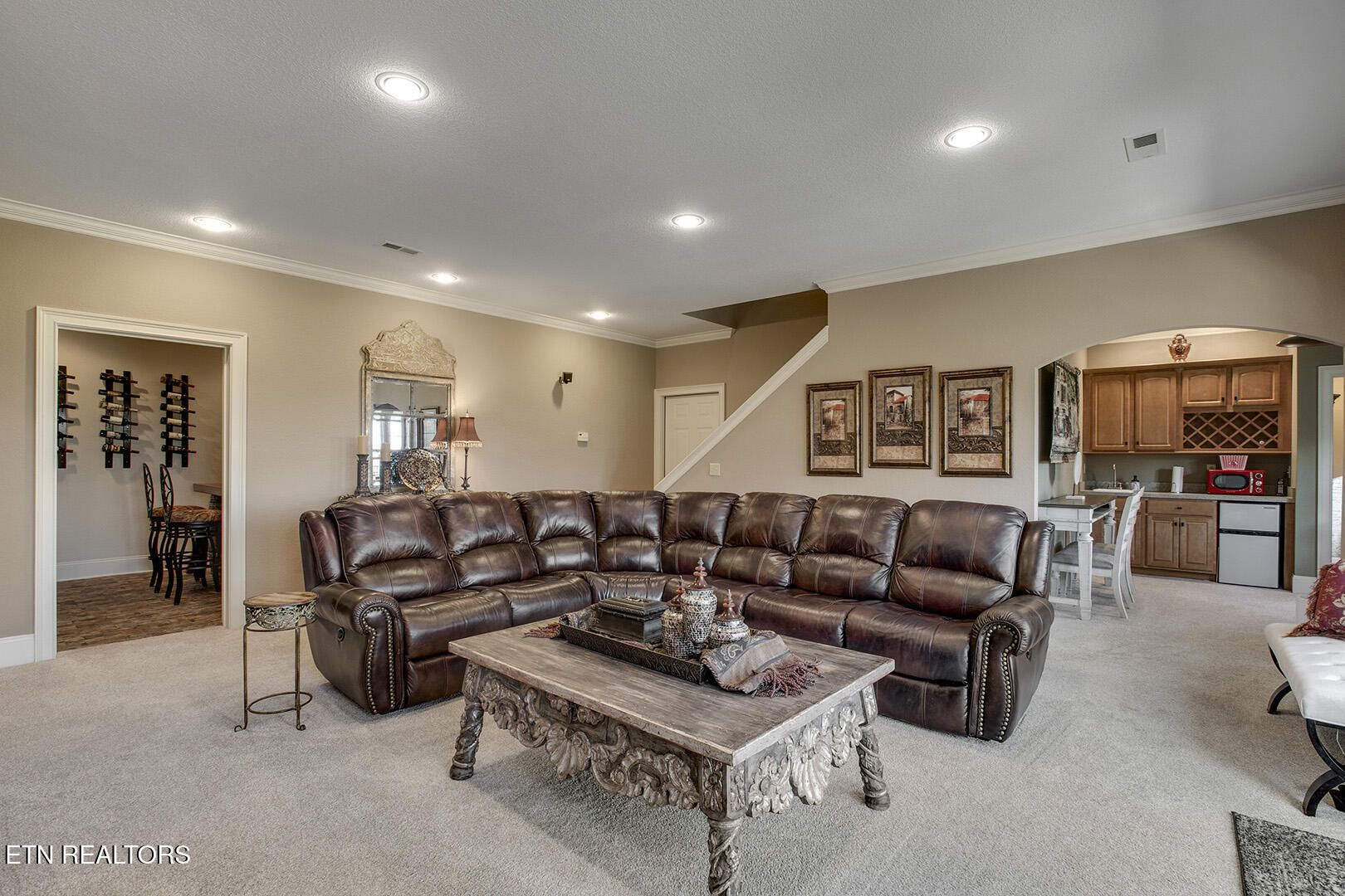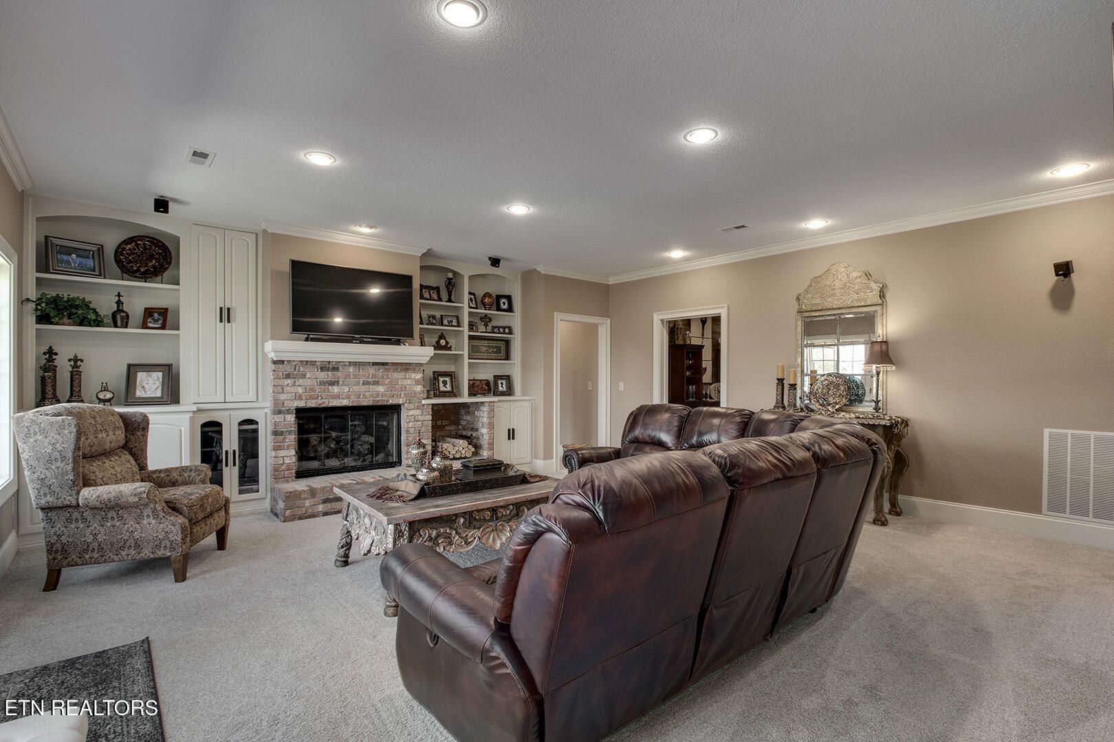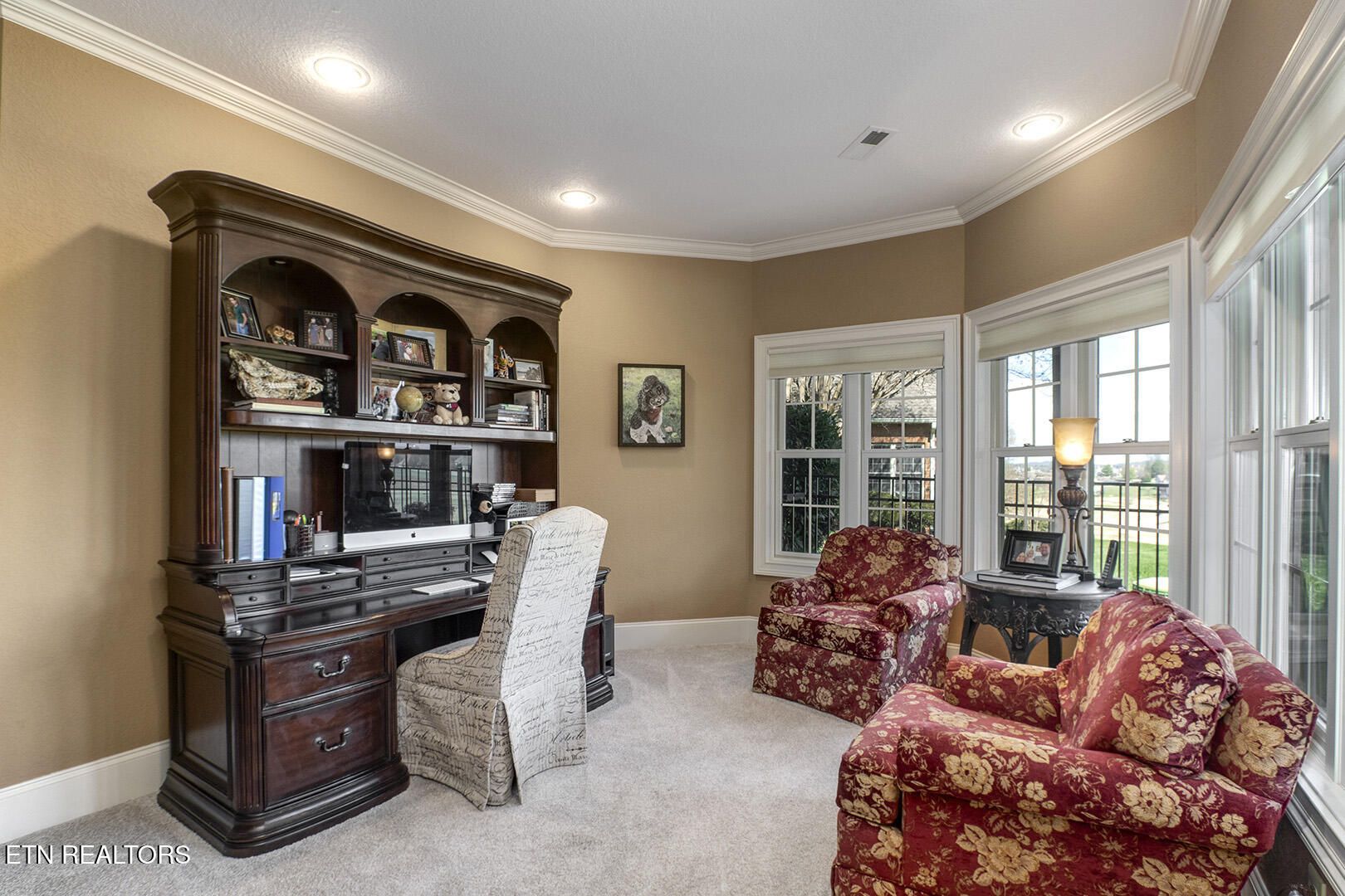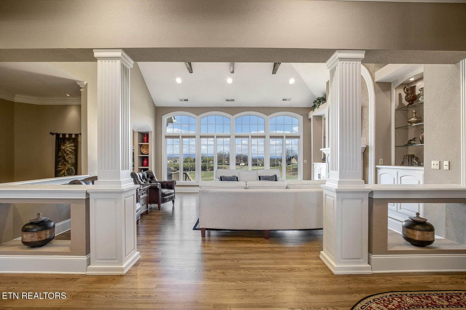Custom Luxury Golf Course Home with Stunning 180° Mountain Views with an optional membership to the country club. Experience exceptional craftsmanship and timeless elegance in this custom-built, high-end home perfectly positioned on the golf course, offering breathtaking 180-degree mountain views. The main level features a thoughtfully designed layout including the primary suite and spa-like bath, great room, formal dining room, kitchen, sitting room, bar, and breakfast room. Enjoy outdoor living with both a screened-in deck and open deck, plus a spacious 2.5-car garage. Interior highlights include finished-in-place hardwood floors, soaring coffered ceilings, extensive crown molding, timber beam accents, and large windows that capture the incredible views. The gourmet kitchen is equipped with GE Monogram appliances, granite countertops throughout, and custom cutting board surfaces. The primary suite offers generous his-and-hers walk-in closets and abundant built-ins. Additional features include 2x6 exterior walls for enhanced efficiency, a main-level HVAC system (2016), and a roof replaced in 2012. The lower level expands your living space with two large bedrooms, a full bath, family room, wine room, study, card room with kitchenette, golf cart garage, and ample storage. This one-of-a-kind property combines luxury, comfort, and unbeatable views--a must see!