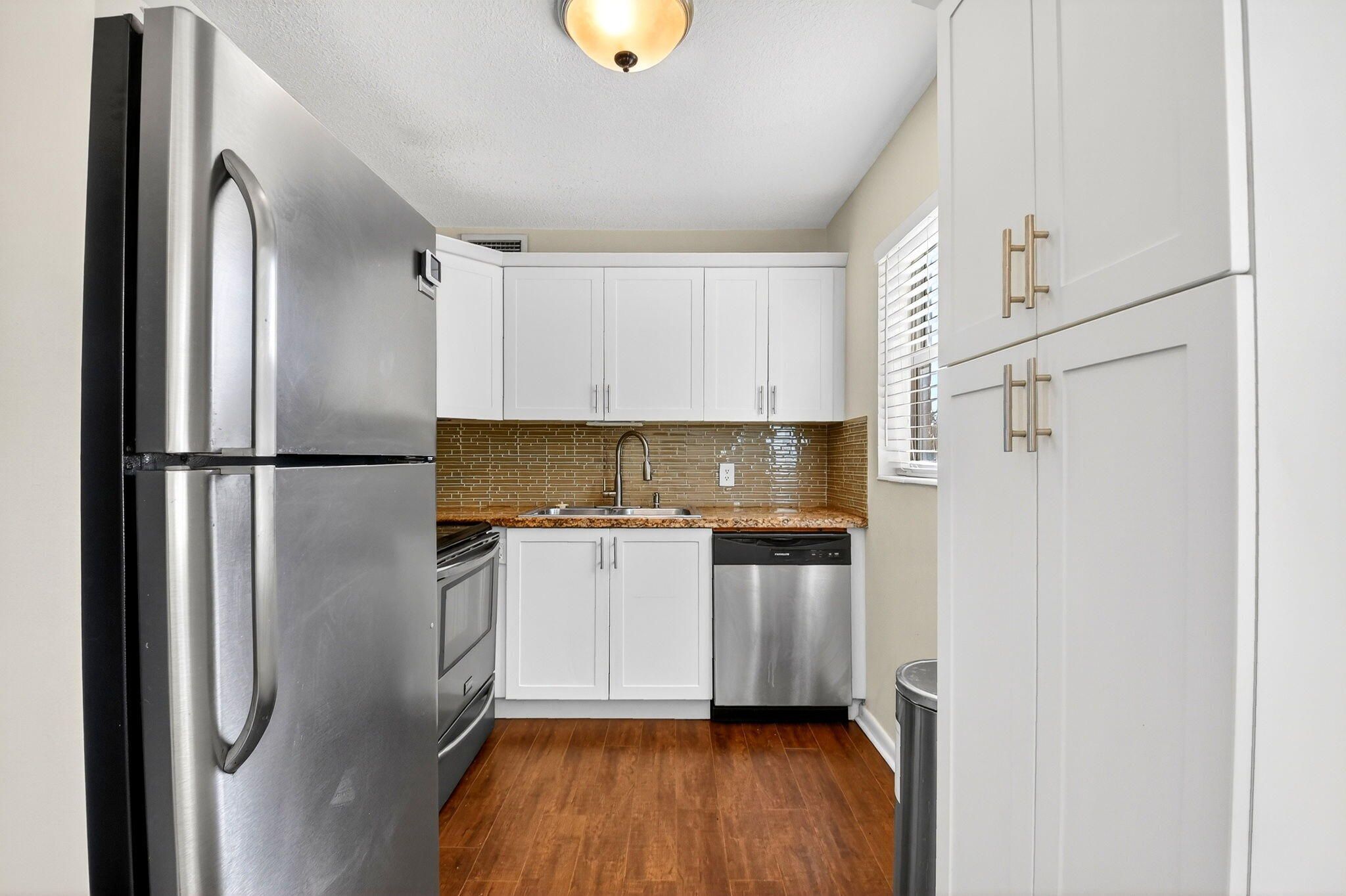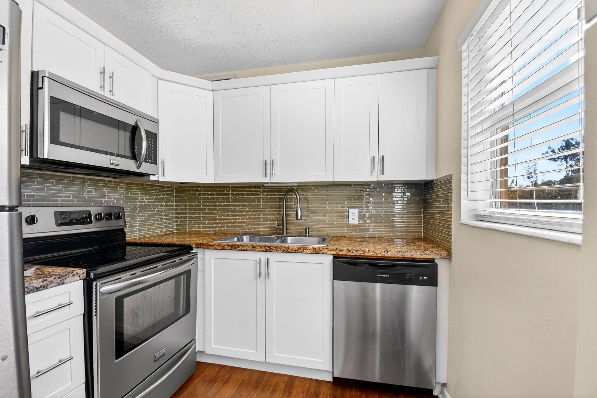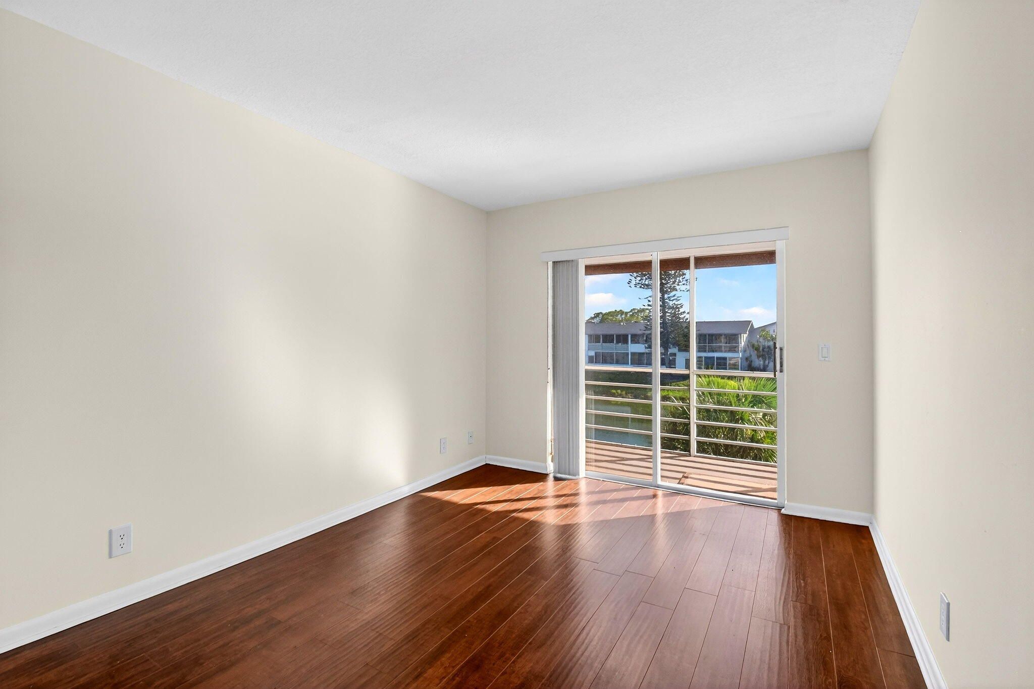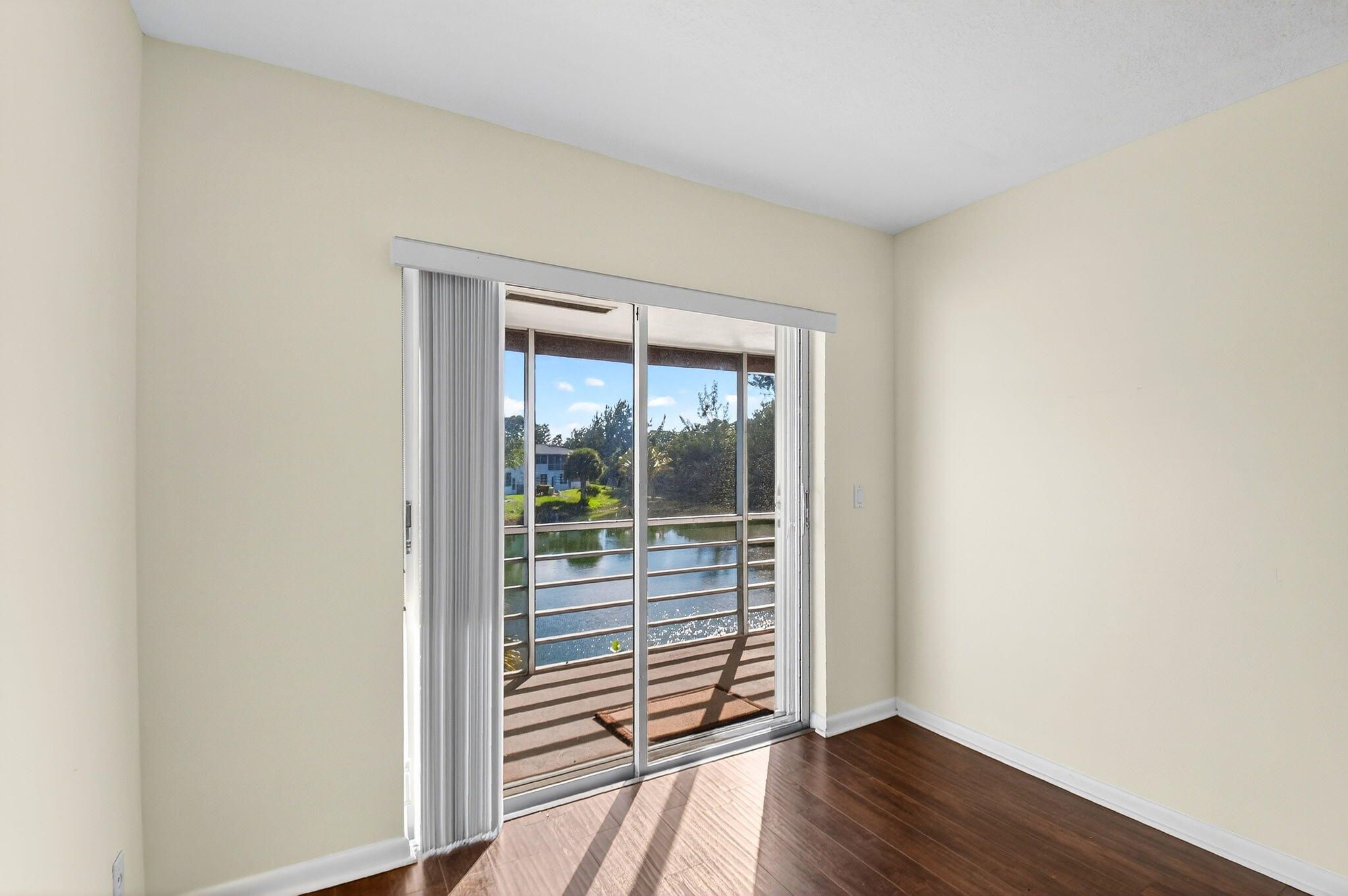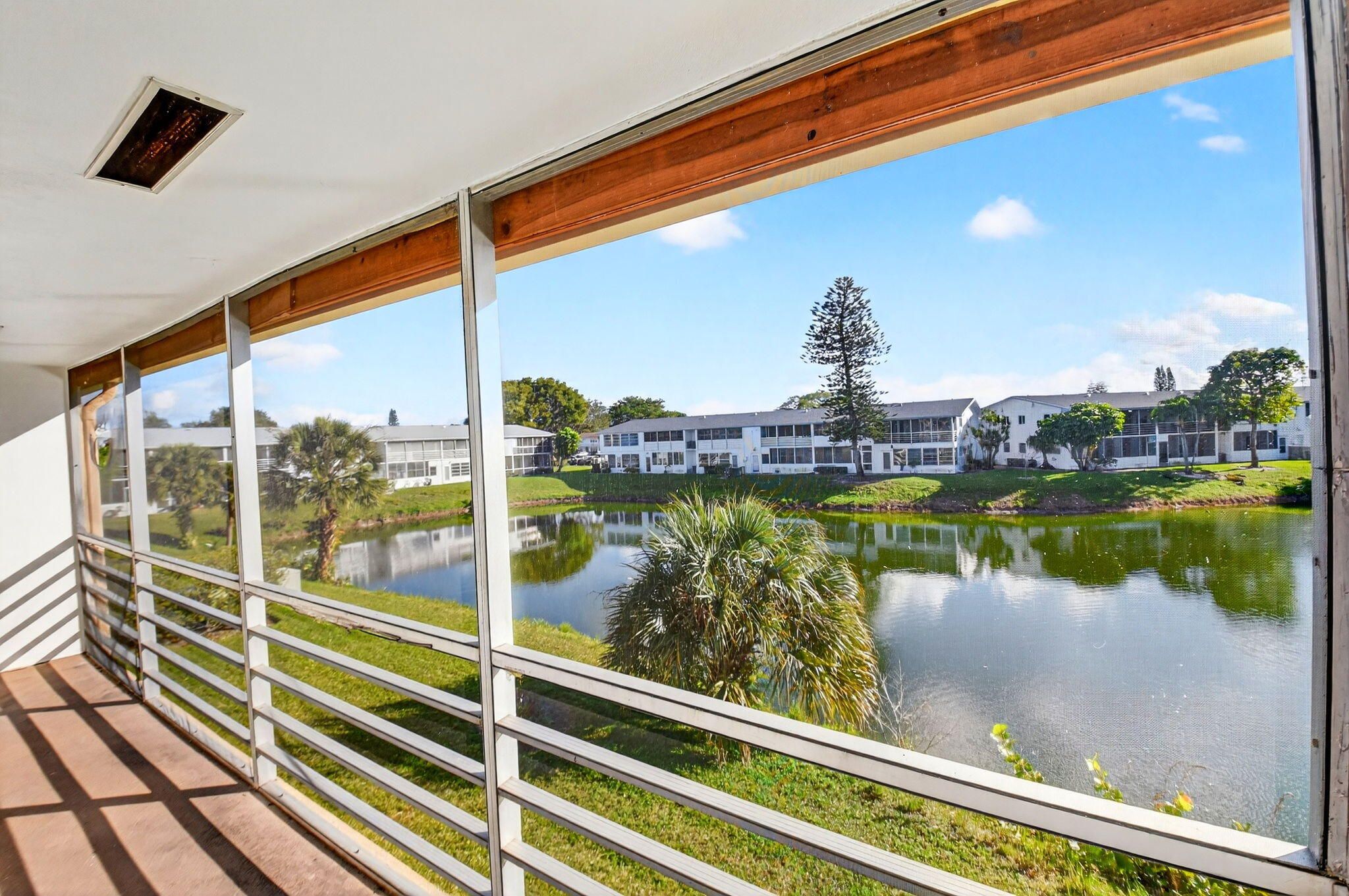Beautifully updated corner residence with serene water views in Century Village in West Palm Beach. This spacious 2-bedroom, 1.5-bath corner unit offers a bright, refreshed kitchen with crisp white shaker style cabinetry, granite countertops, and stainless steel appliances. Rich, wood-style flooring extends throughout the home, adding warmth and continuity. Sliding glass doors lead out to a private, screened-in balcony with tranquil lake views. Hurricane-impact windows provide peace of mind. The well-kept building recently received a new roof in 2022. Century Village is an active, resort-inspired 55+ community ideally situated in central Palm Beach County. Residents enjoy an impressive array of amenities, including live entertainment, movie screenings, social clubs, multiple swimming pools, transportation service, and on-site security. The expansive clubhouse offers a theater, indoor pool, card and billiards rooms, event space, and courts for shuffleboard, tennis, pickleball, and bocce. Additional highlights include numerous heated outdoor pools, a dedicated fitness center with gym, and resistance pool, along with two manned gates and 24-hour security patrols.