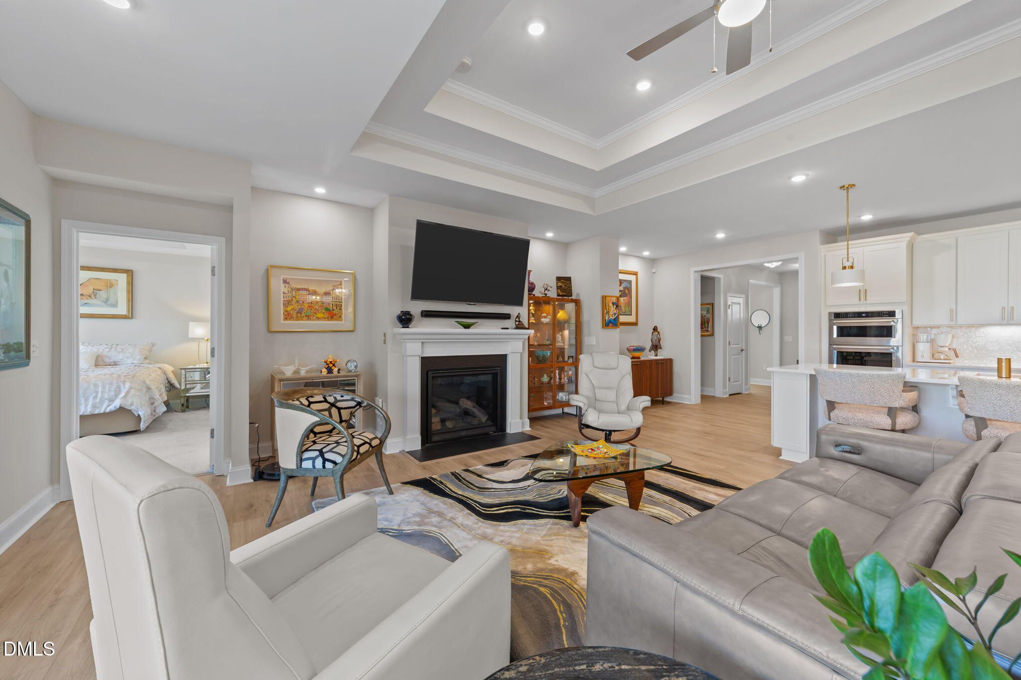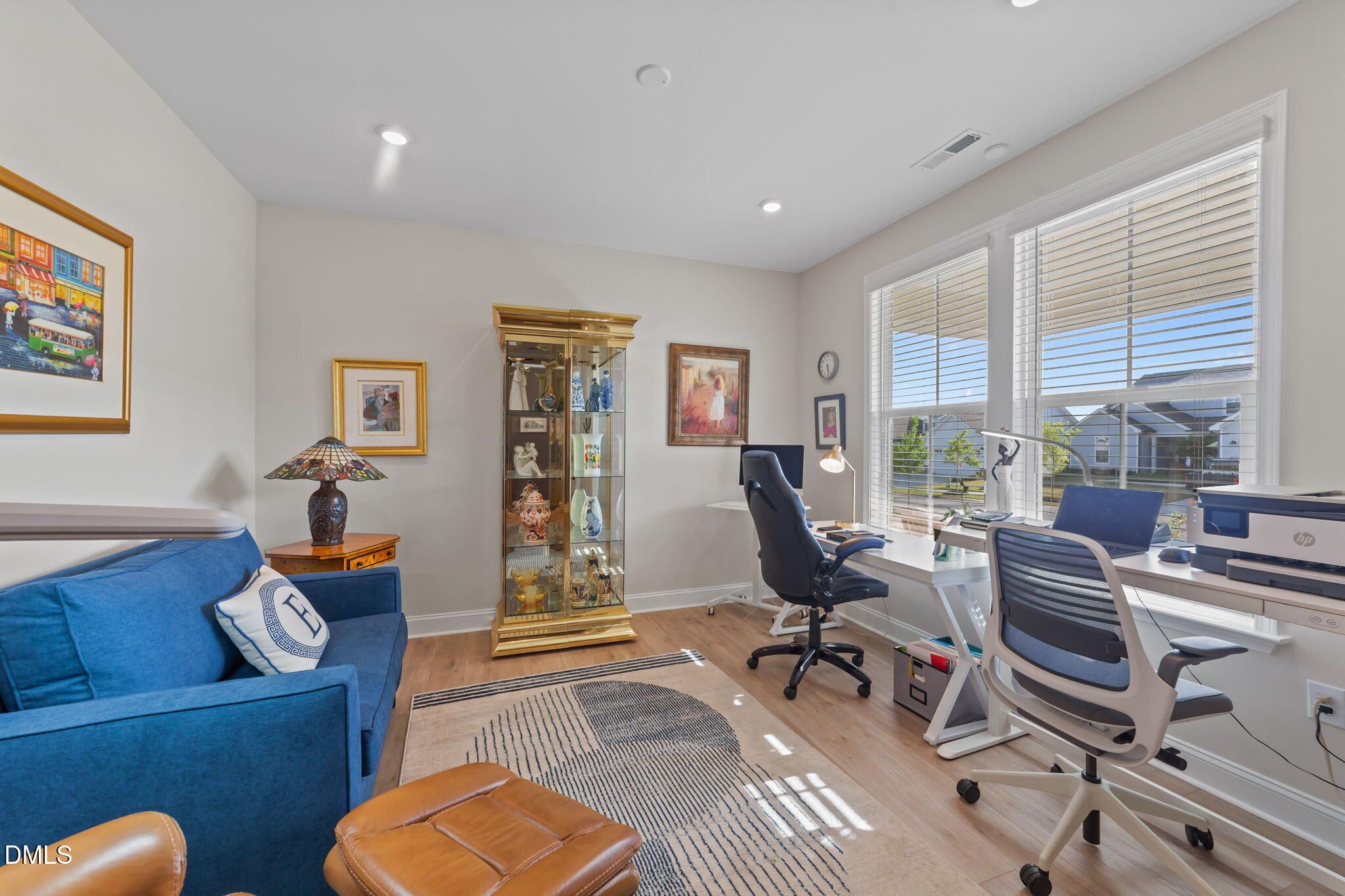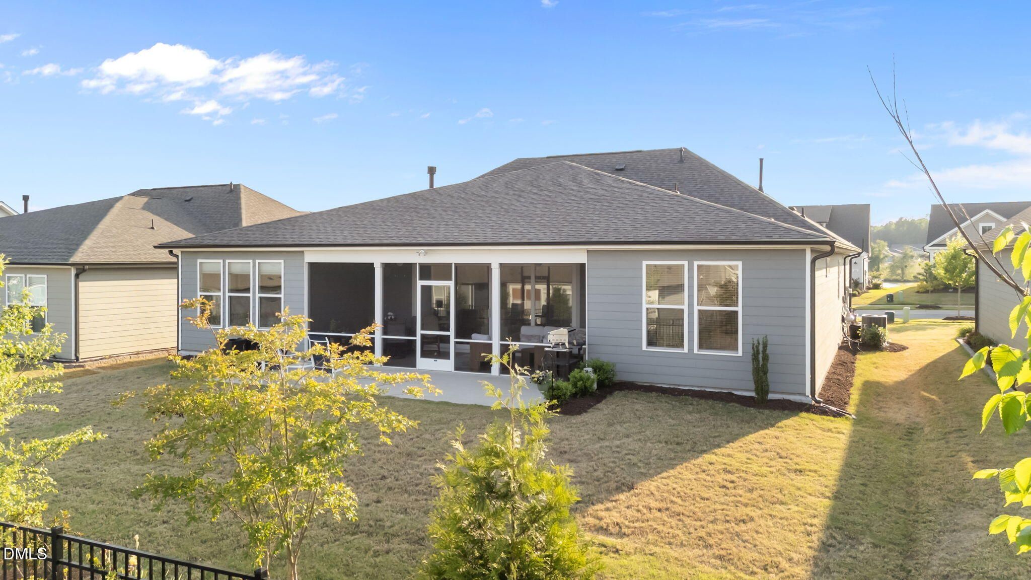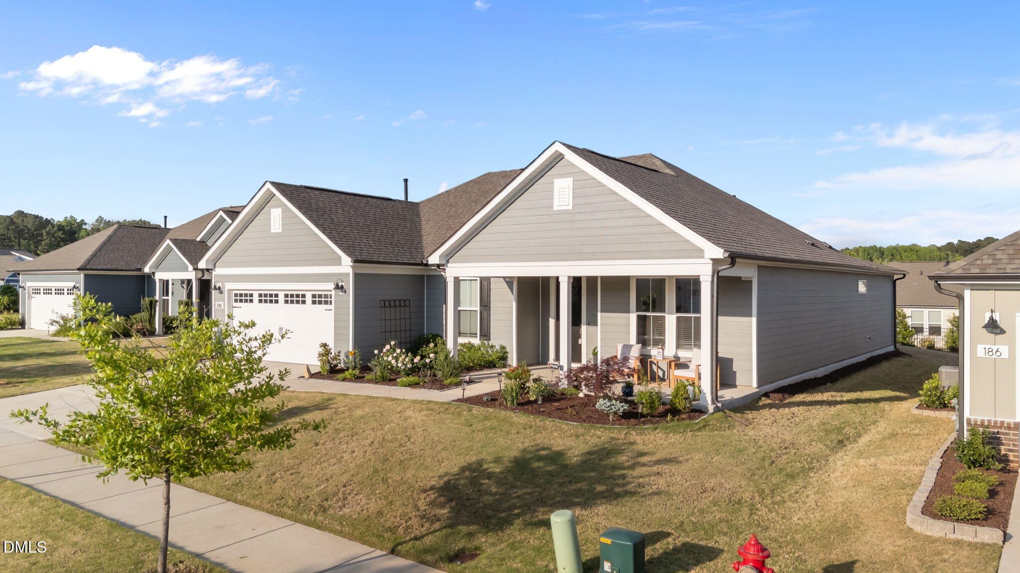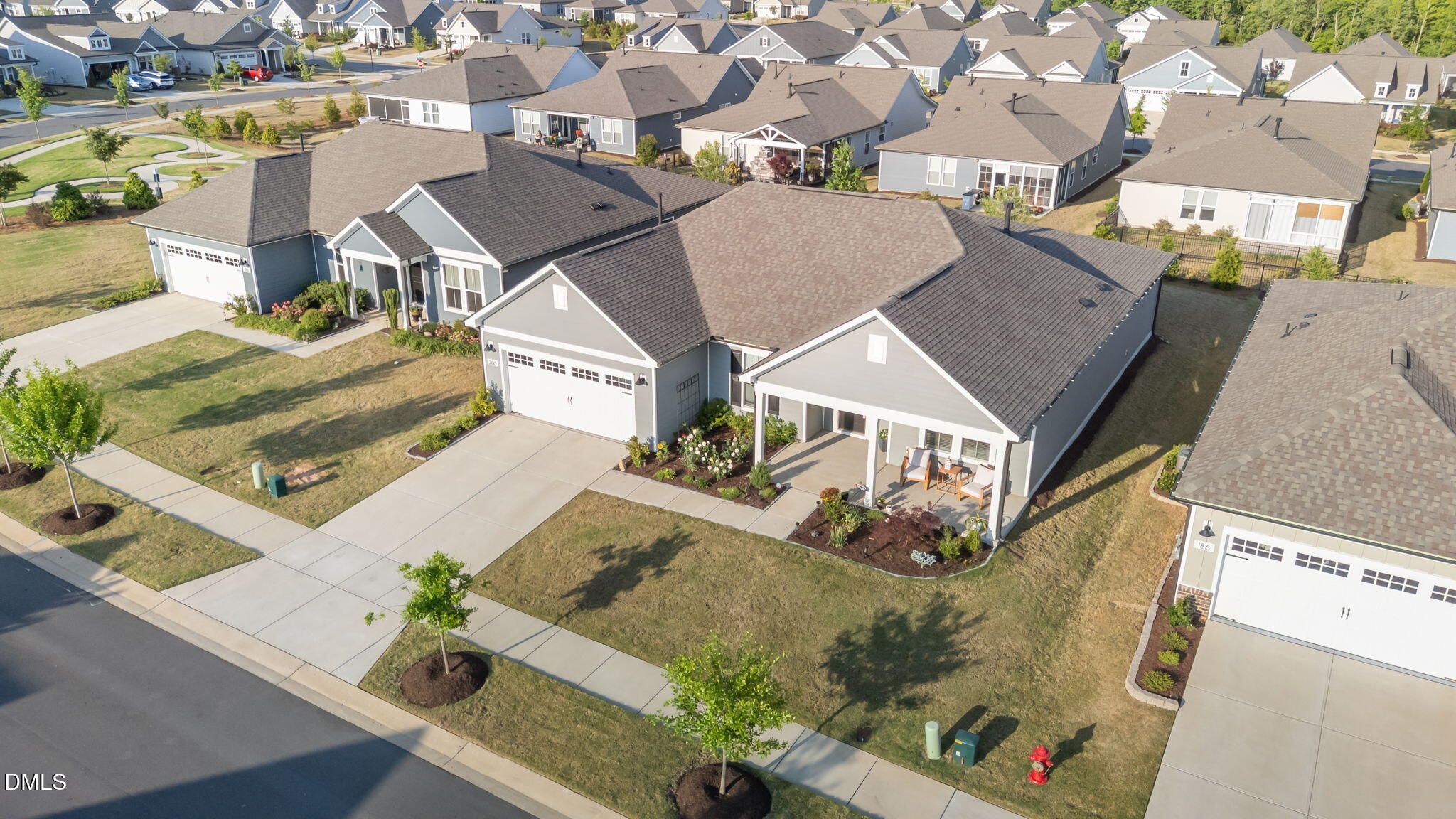 Welcome to the gentle rolling hills of Carolina Overlook, a premier 55+ community offering resort-style living year-round. This beautifully appointed 2-bed, 2.5-bath home includes a dedicated office, an open kitchen overlooking the family and dining areas, a spacious laundry room, and a convenient drop zone off the garage. More than $100,000 in builder upgrades were added during construction, including luxury vinyl plank flooring,upgraded tile in primary bath, quartz countertops, a premium KitchenAid appliance package, under-cabinet lighting, a designer backsplash, upgraded owner's closet shelving, additional recessed lighting, a screened porch, an extended patio, and expanded garage storage. The sellers have further enhanced the home with custom interior paint, designer ceiling fans in the primary suite and living area, upgraded pendant lighting in the kitchen, accent lighting for artwork, added cabinetry and a freestanding sink in the laundry room, epoxy flooring in the screened porch, a bidet toilet in the primary bath and bidet seat in the guest bath, grab bars in both bathrooms, custom lighting in the entry hall, custom blinds in primary and living area, an EV charging outlet in the garage, and a full alarm system. Carolina Overlook is one of Del Webb's most impressive communities, offering an indoor and outdoor pool, hot tub, gym, game rooms, walking trails, and a wide variety of classes and activities. The location is ideal--close to shopping, dining, and just a short drive to downtown Raleigh for entertainment and cultural events. This home is a standout opportunity you won't want to miss and don't to click on the video!