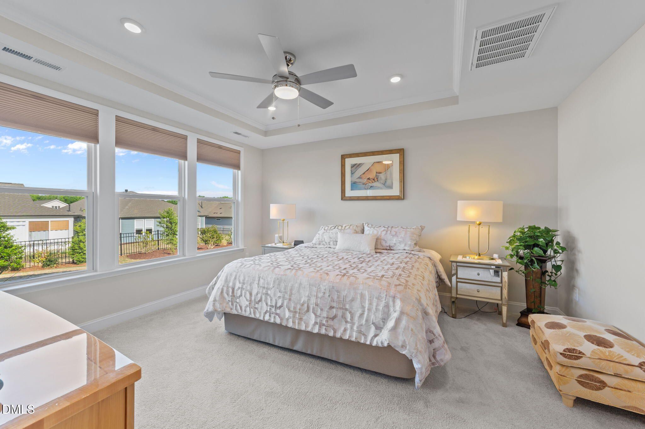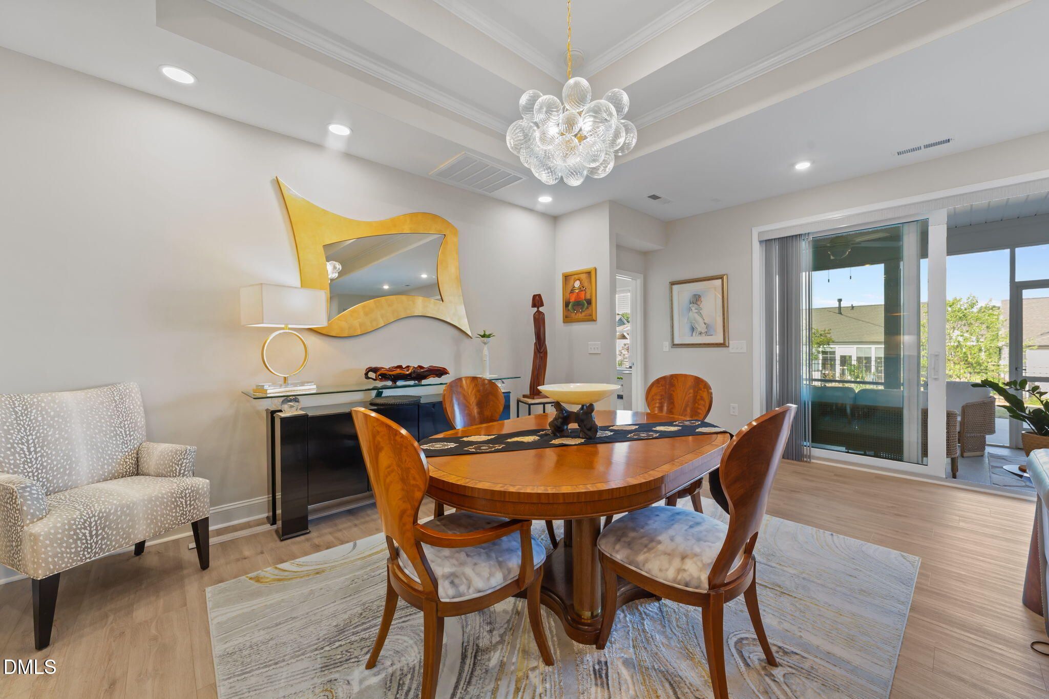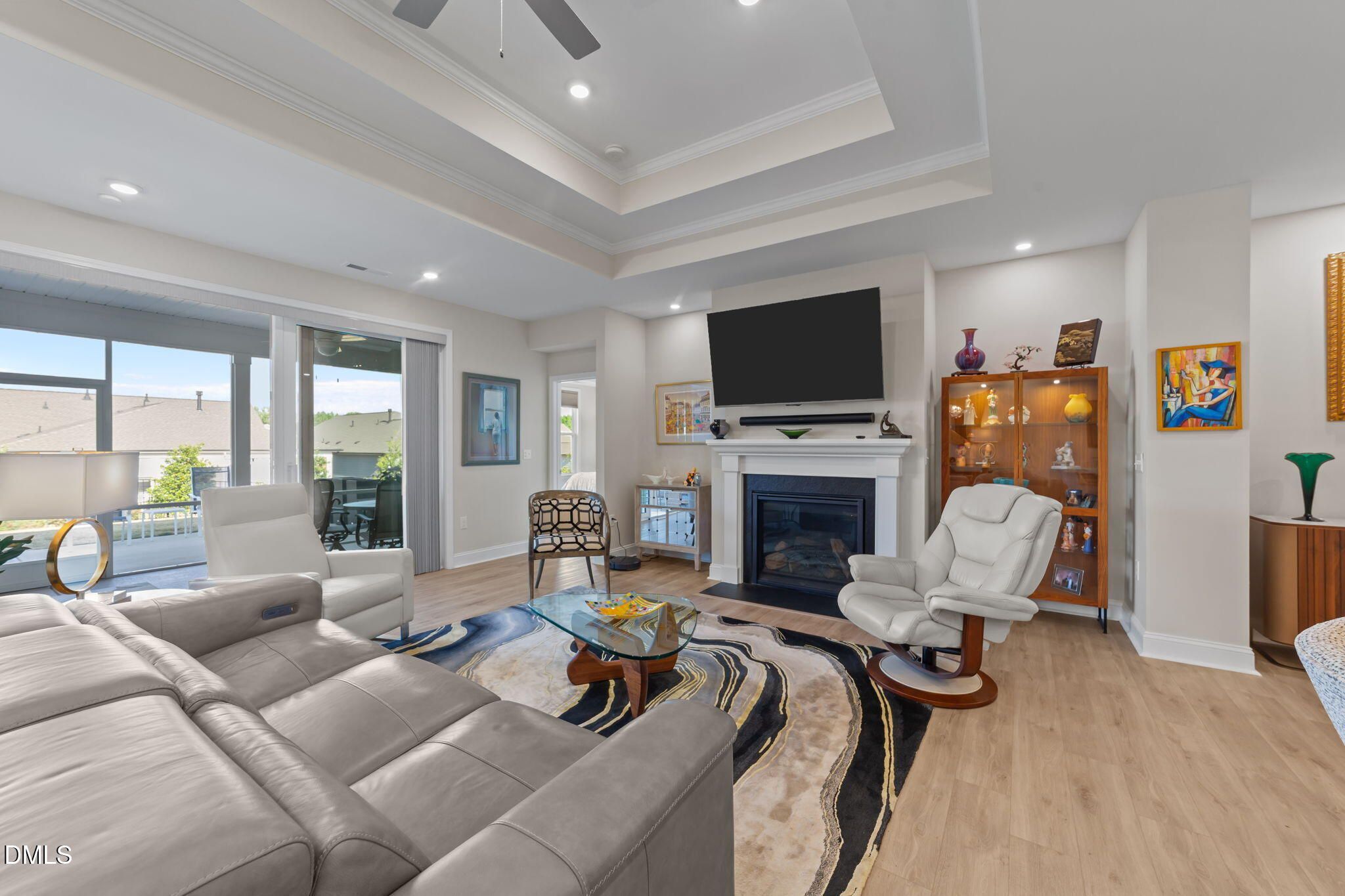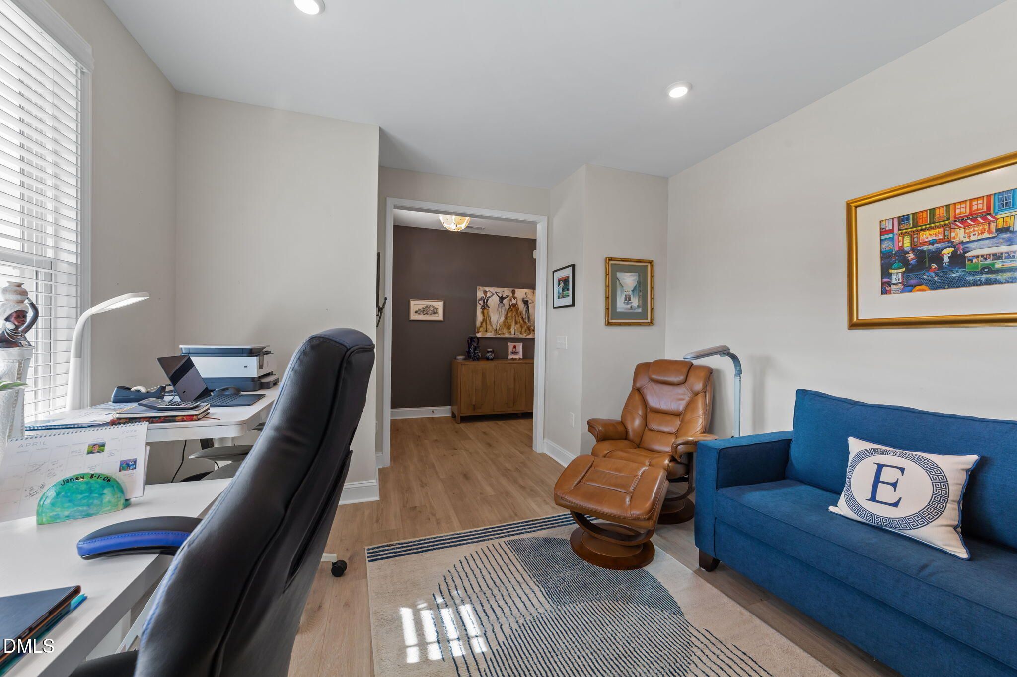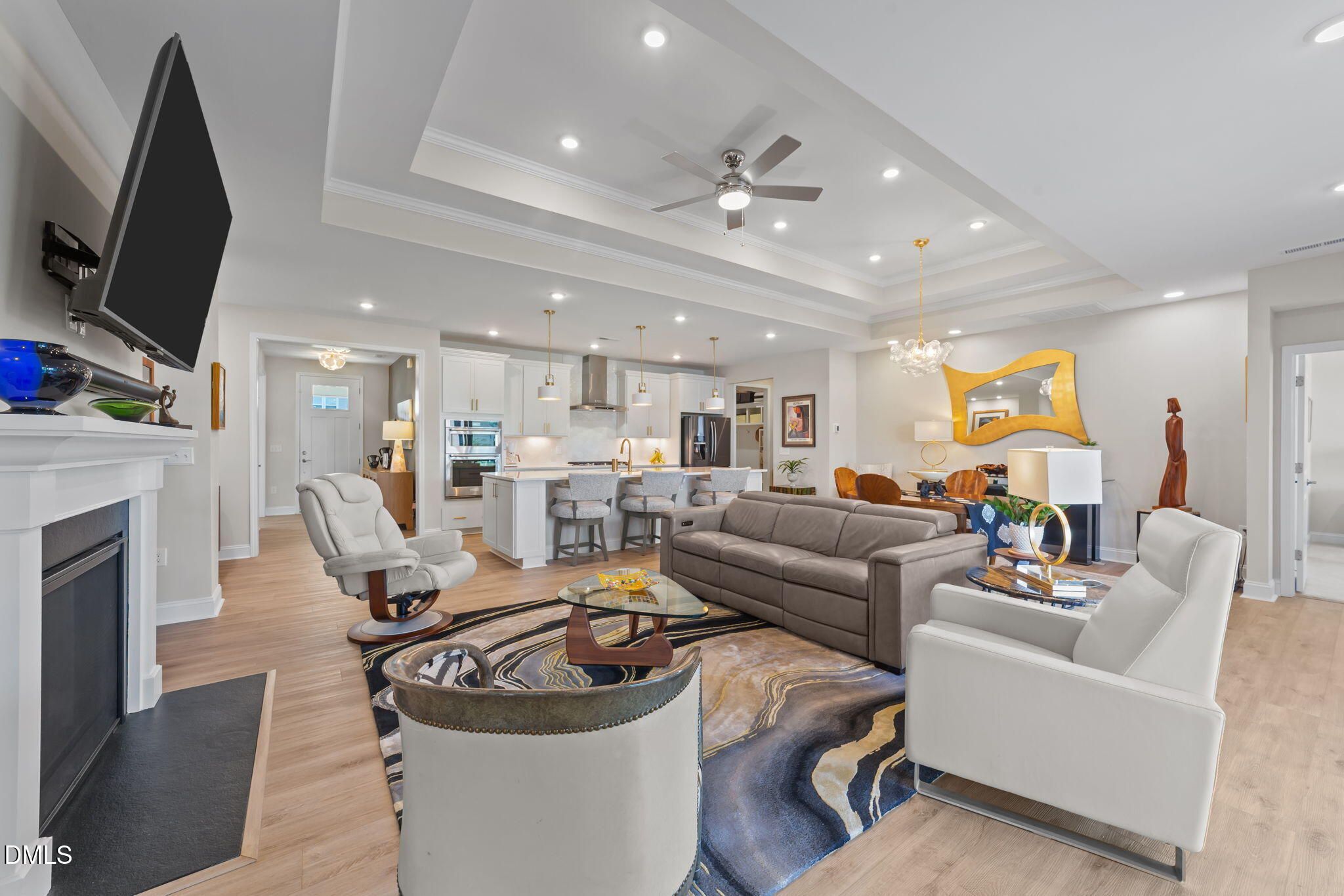 Welcome to the gentle rolling hills of Carolina Overlook, a premier 55+ community offering resort-style living year-round. This beautifully appointed 2-bed, 2.5-bath home includes a dedicated office, an open kitchen overlooking the family and dining areas, a spacious laundry room, and a convenient drop zone off the garage. More than $100,000 in builder upgrades were added during construction, including luxury vinyl plank flooring,upgraded tile in primary bath, quartz countertops, a premium KitchenAid appliance package, under-cabinet lighting, a designer backsplash, upgraded owner's closet shelving, additional recessed lighting, a screened porch, an extended patio, and expanded garage storage. The sellers have further enhanced the home with custom interior paint, designer ceiling fans in the primary suite and living area, upgraded pendant lighting in the kitchen, accent lighting for artwork, added cabinetry and a freestanding sink in the laundry room, epoxy flooring in the screened porch, a bidet toilet in the primary bath and bidet seat in the guest bath, grab bars in both bathrooms, custom lighting in the entry hall, custom blinds in primary and living area, an EV charging outlet in the garage, and a full alarm system. Carolina Overlook is one of Del Webb's most impressive communities, offering an indoor and outdoor pool, hot tub, gym, game rooms, walking trails, and a wide variety of classes and activities. The location is ideal--close to shopping, dining, and just a short drive to downtown Raleigh for entertainment and cultural events. This home is a standout opportunity you won't want to miss and don't to click on the video!