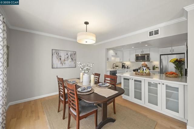 Charming unit located in the 55+ community of Rossmoor. The Sonoma style model is "move in ready" and offers many fabulous updates. The remodeled kitchen has stainless steel appliances, a large white quartz island with custom built-in cabinets and recessed lighting just perfect for entertaining guests. The crown moulding, newer interior doors, window coverings and beautiful hardwood floors bring elegance to the space. Gorgeous views of mountains and redwood trees make this a serene place to relax. There is an in-house laundry within an updated bathroom which provides everyday convenience. The community has a golf course, pools, gyms, club houses and endless activities! The security gate provides safety for all of the residents. This condominium won't be on the market long, so come tour it today!