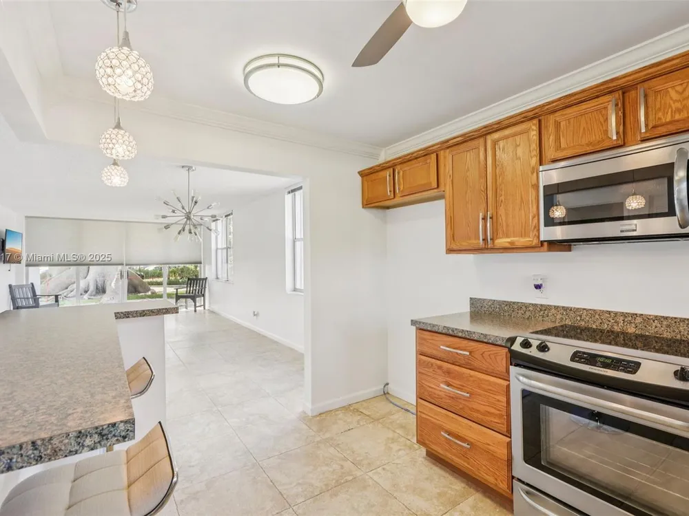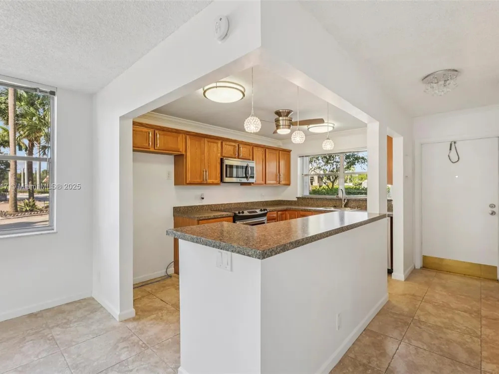 Welcome to this beautifully updated first-floor corner unit, 2 bedroom/2 bath condo, where pride in ownership is evident throughout. Extra windows for more light! Immaculately renovated, this home features an open kitchen with oak cabinetry and updated appliances, creating a perfect space for both cooking and entertaining. The oversized kitchen island offers ample storage and seating, making it ideal for gatherings. Both bathrooms have been thoughtfully updated, and large neutral tile flooring flows seamlessly throughout the home. Accordion shutters provide added storm protection for peace of mind.Located in a vibrant 55+ age-restricted community.