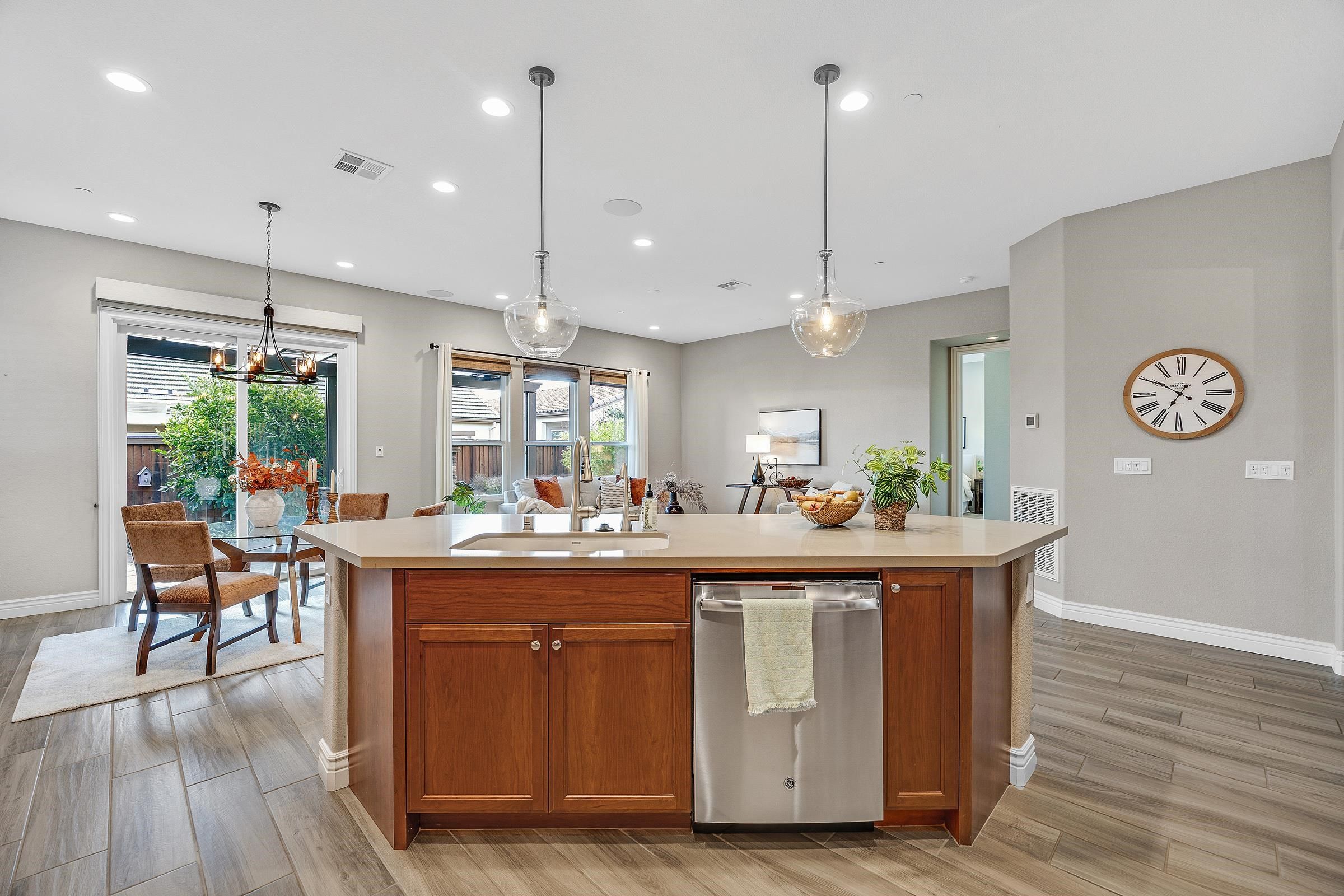 This beautiful Vineyard Cottage–style Ravello corner plan in Trilogy at The Vineyards, Brentwood’s premier 55+ resort-style community, offers the perfect blend of comfort, charm, and elegance. Designed for easy living and entertaining, the open and spacious kitchen and family room flow seamlessly to both the front courtyard and the private backyard—professionally landscaped with a cozy outdoor fireplace. The home is tastefully upgraded throughout with cherry cabinetry, quartz countertops, LED lighting, and wood-look tile flooring. The primary bathroom features Kohler fixtures and a custom tile shower with a 3/8” frameless glass enclosure. Additional highlights include pre-wiring for 5.1 surround sound, an upgraded WiFi network, reverse osmosis water filtration, and prepaid solar for energy efficiency. Residents enjoy full access to Club Los Meganos, featuring an indoor heated pool, outdoor resort pool and spa, state-of-the-art fitness center, pickleball and tennis courts, billiards, and over 60 clubs, as well as year-round concerts, comedy nights, karaoke, and more. Trilogy offers an active, social lifestyle with something for everyone—this home truly delivers resort living at its best.