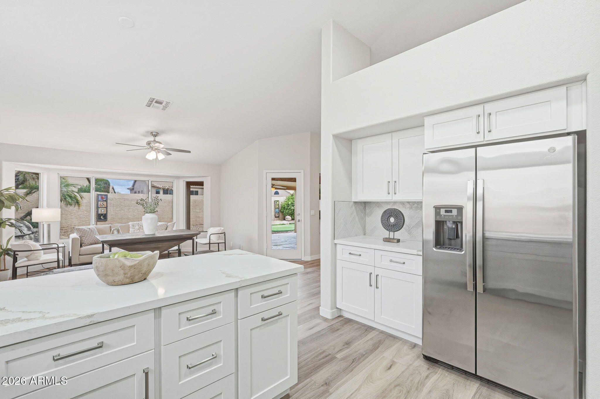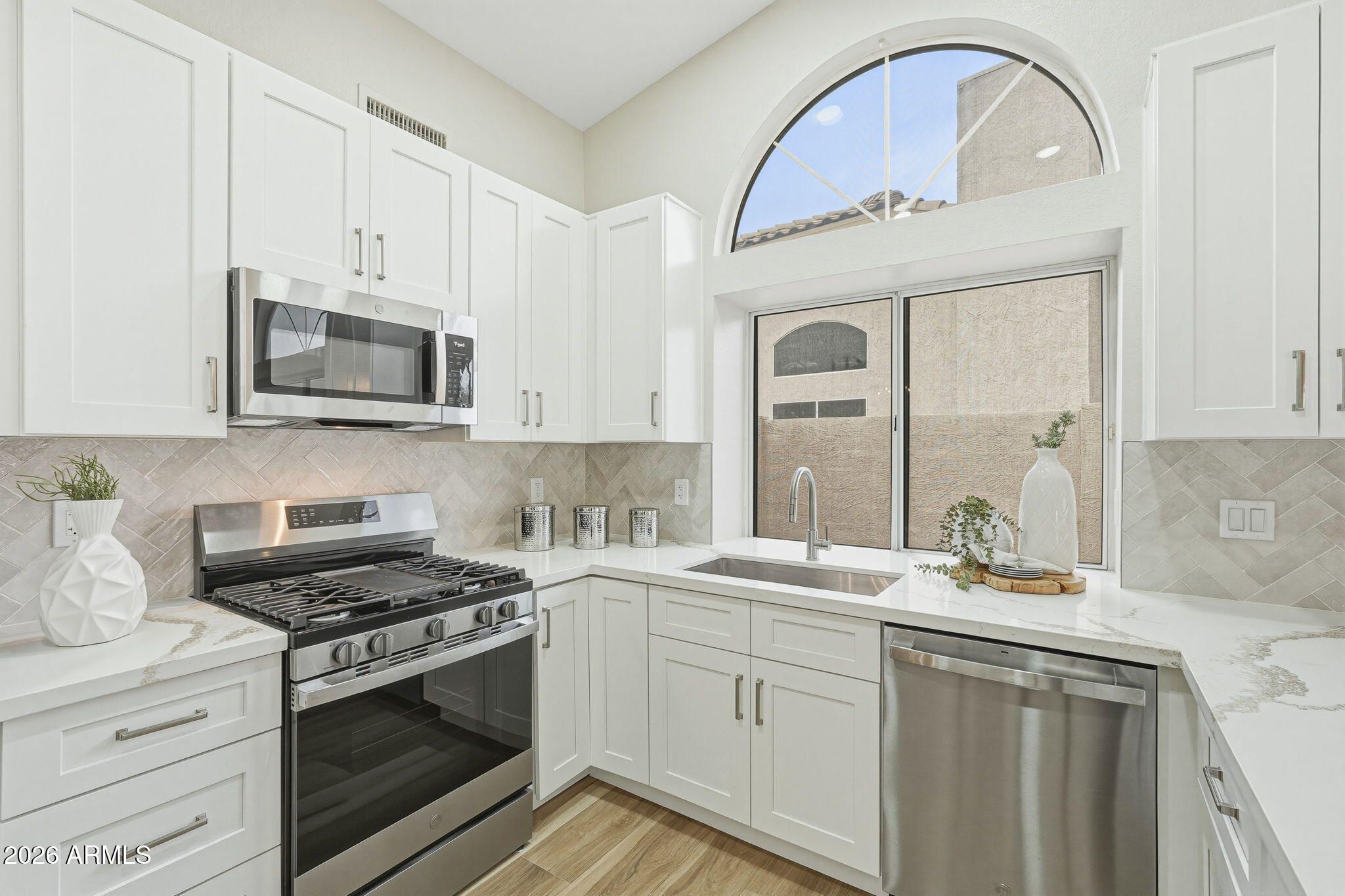 Stunning fully remodeled 2-bedroom/2-bath home complete with 3-car garage and a private lot backing to wash! Popular Camelback model with vaulted ceilings, newly painted interior with luxury vinyl plank flooring offers two living areas ideal for entertaining and everyday living. The chef's kitchen features new white shaker cabinetry stainless steel built-in appliances including gas range, quartz counters with herringbone tiled backsplash and a breakfast bar. Check out the primary bedroom with access to patio plus double closets and a private bathroom with dual sinks, quartz counters and walk in shower. The backyard includes a covered patio, built-in BBQ and putting green perfect for unwinding or hosting lively weekend gatherings. Don't let this amazing house in Westbrook Village slip by!