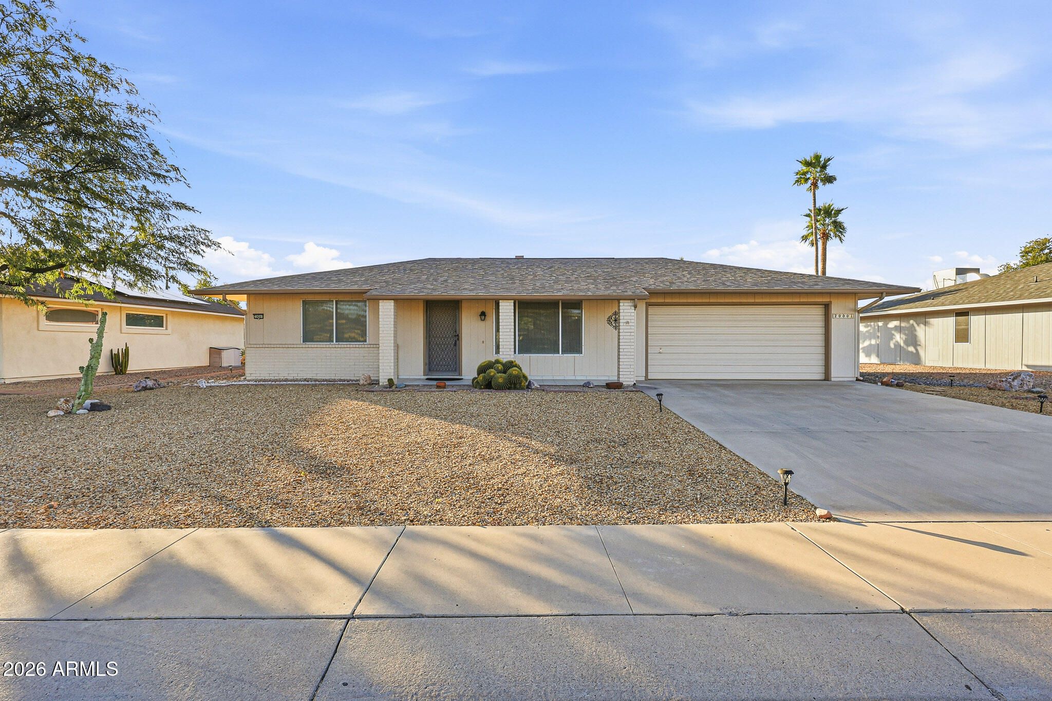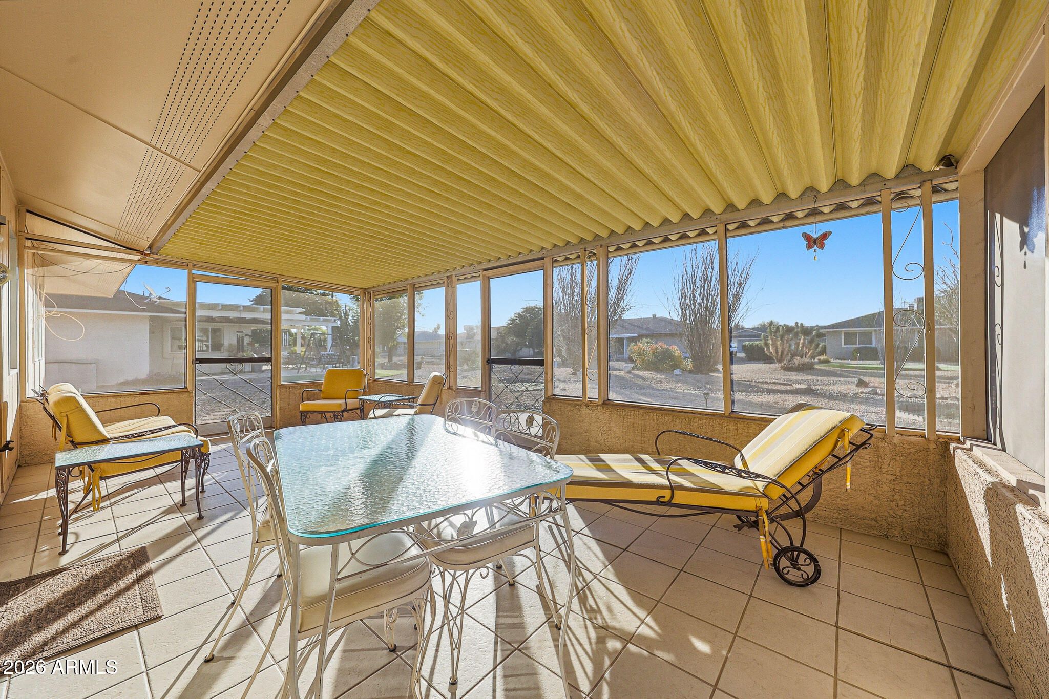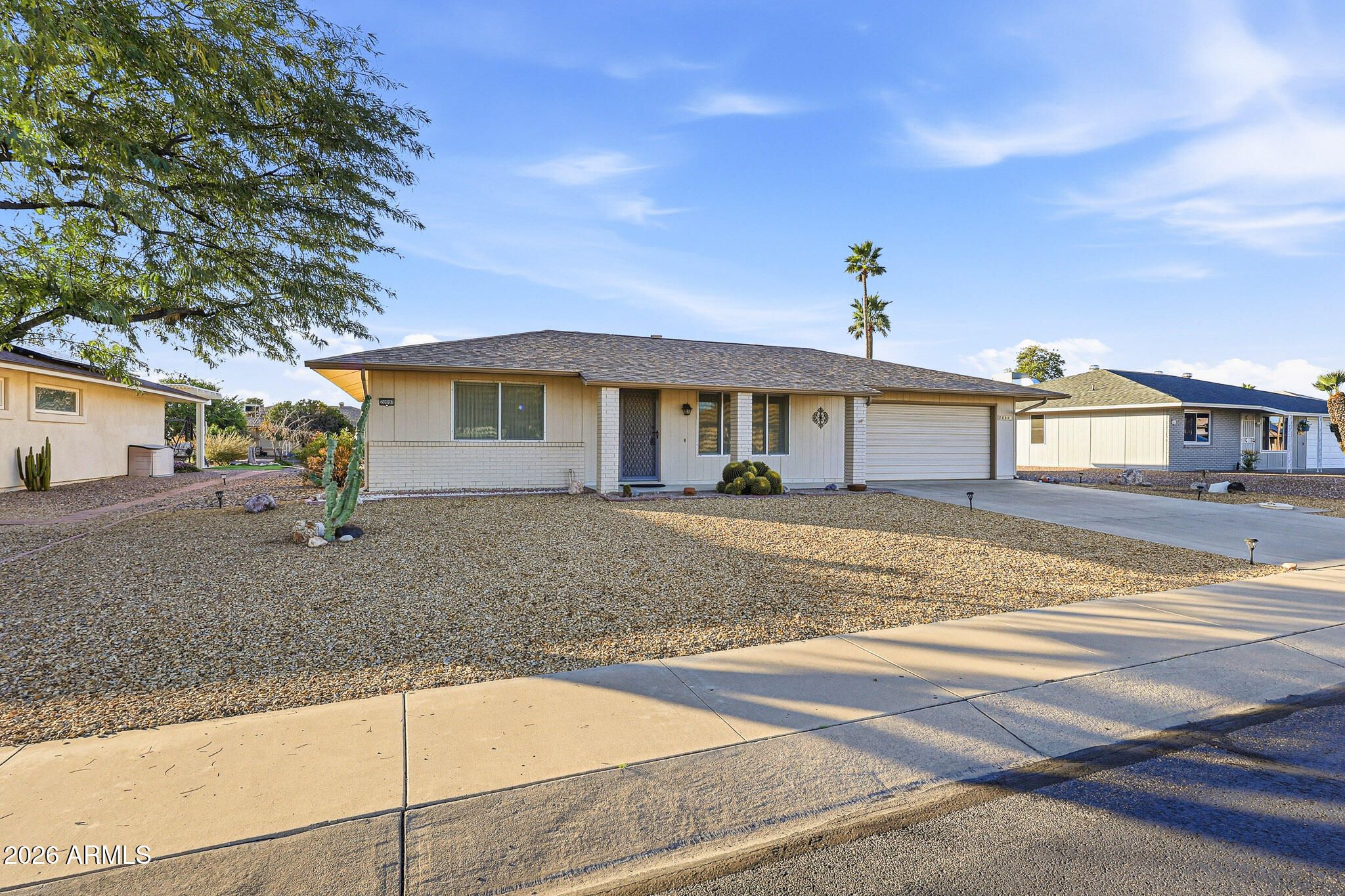 Welcome To This Charming Yankee Model Home In Sun City! Proudly Owned By The Same Family For 23 Years, This Well-Cared-For Property Has Been Gently Lived In As A Seasonal Winter Retreat. Situated On A Large Lot With An Oversized Two-Car Garage, This 918-Square-Foot Home Makes Excellent Use Of Space. The Comfortable Living Room Easily Accommodates A Sofa, Chairs, And Entertainment Setup. Perfect For Relaxing Or Hosting Guests. The Kitchen Offers Ample Cabinet Storage And Generous Prep Space For Cooking, With A Delightful Screened Patio Just Off The Kitchen, Creating An Ideal Spot To Enjoy Arizona's Beautiful Weather. Both Bedrooms Feature Walk-In Closets, Adding Valuable Storage And Convenience. This Home Combines Efficient Design, Pride Of Ownership, And A Great Lot. A True Sun City Gem!