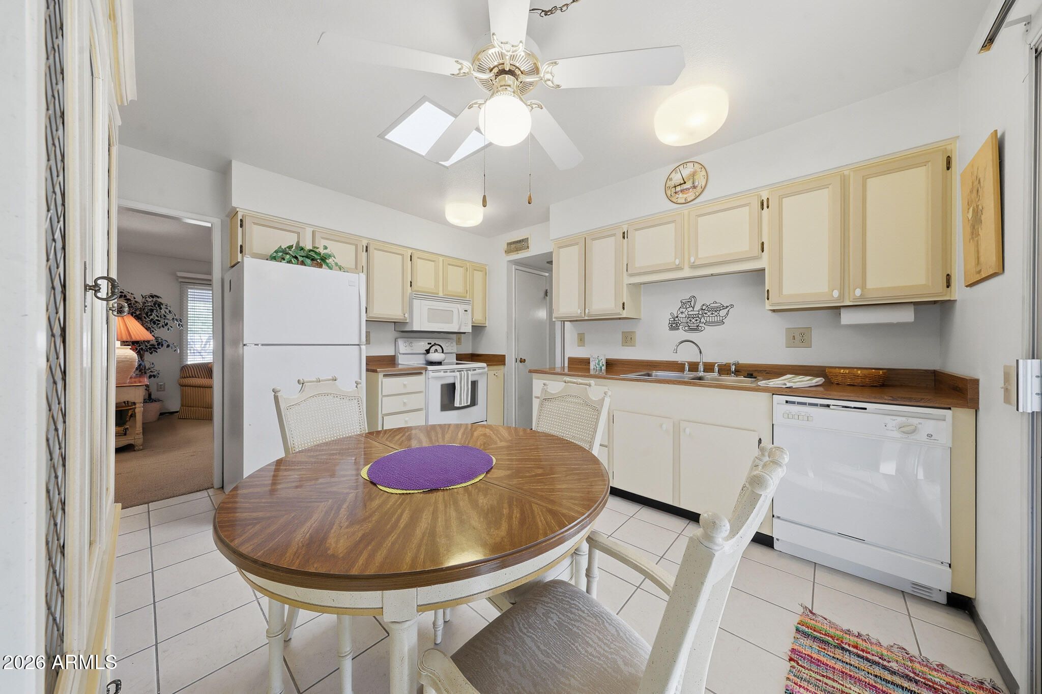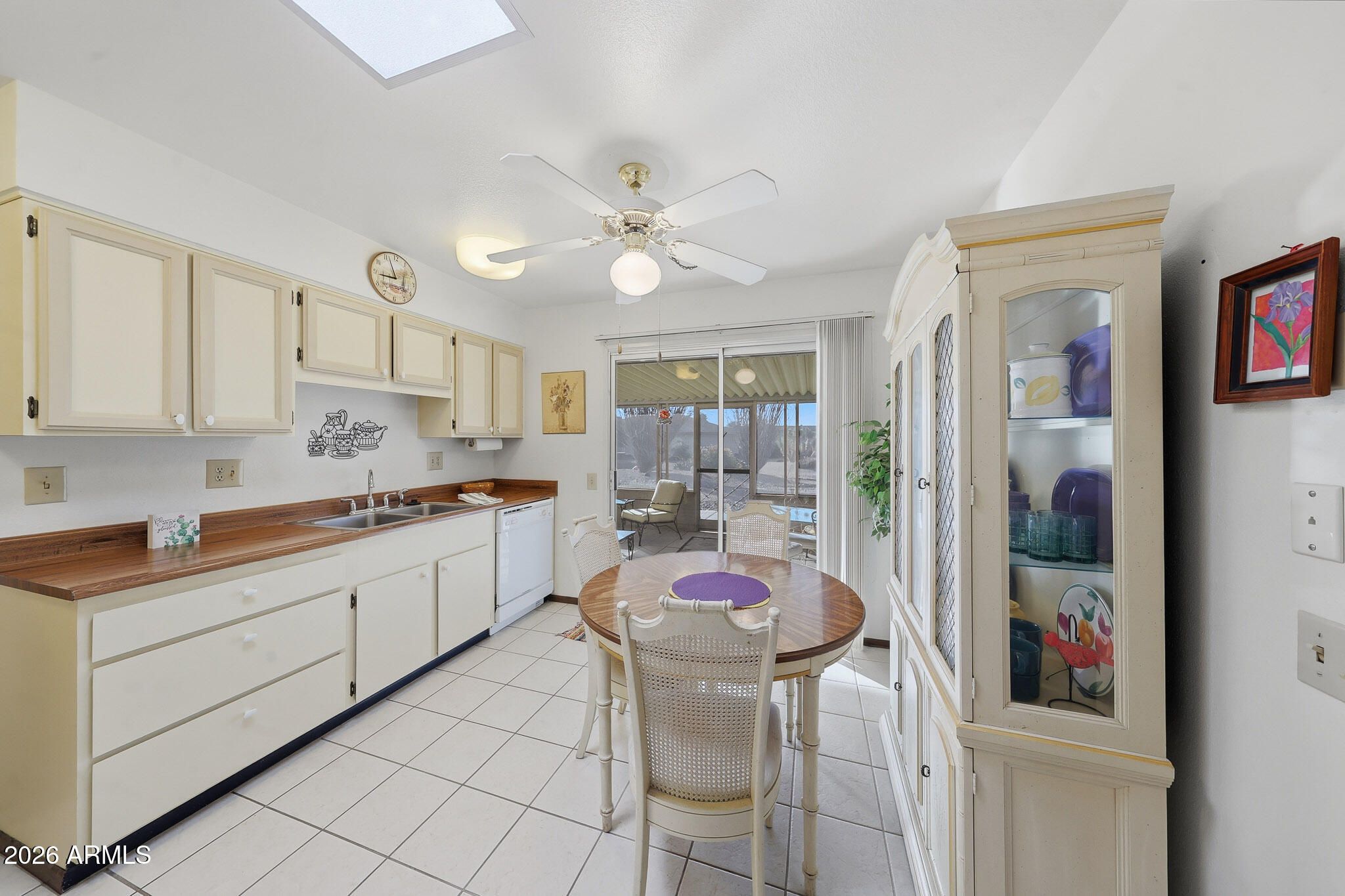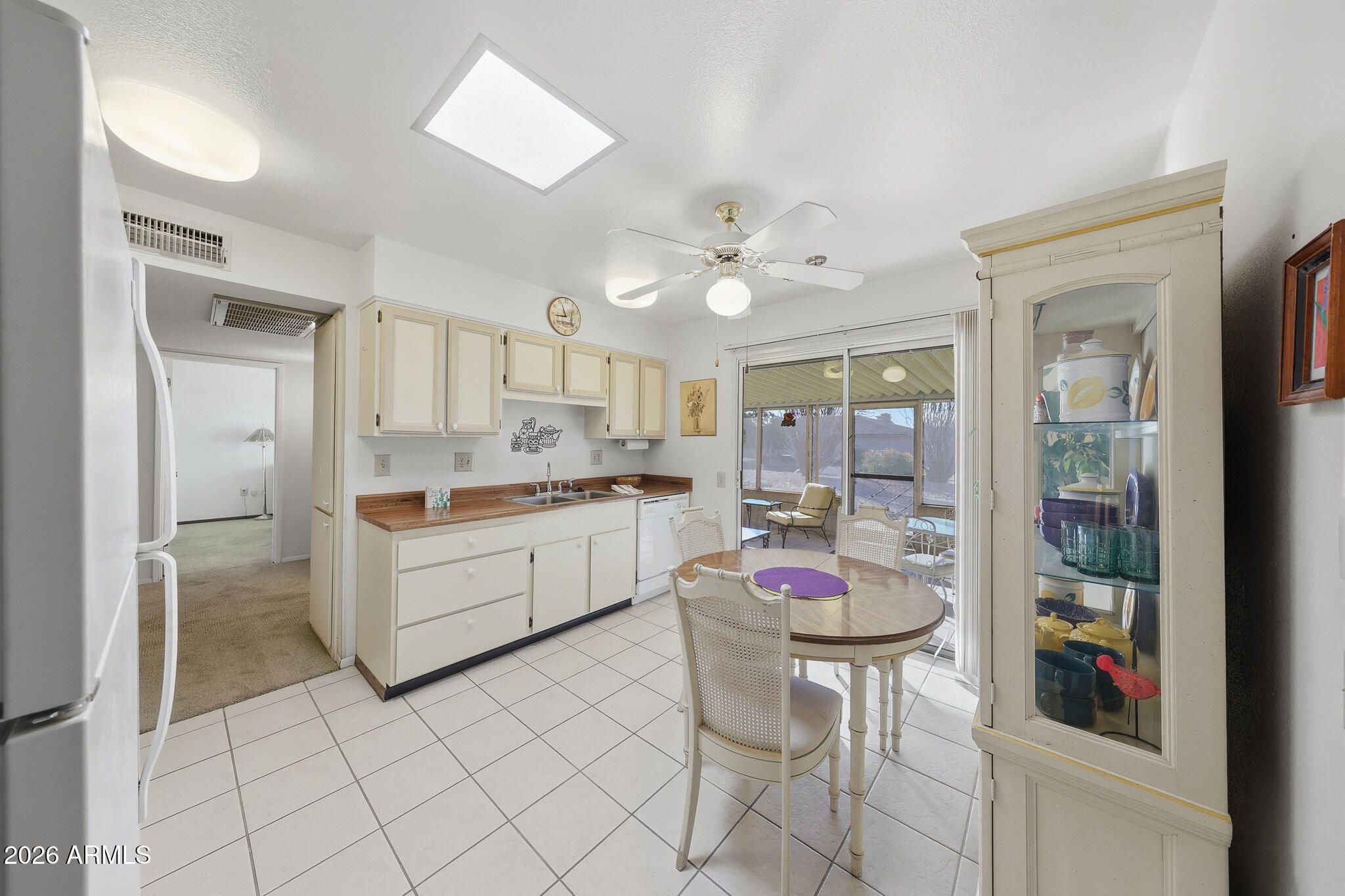 Welcome To This Charming Yankee Model Home In Sun City! Proudly Owned By The Same Family For 23 Years, This Well-Cared-For Property Has Been Gently Lived In As A Seasonal Winter Retreat. Situated On A Large Lot With An Oversized Two-Car Garage, This 918-Square-Foot Home Makes Excellent Use Of Space. The Comfortable Living Room Easily Accommodates A Sofa, Chairs, And Entertainment Setup. Perfect For Relaxing Or Hosting Guests. The Kitchen Offers Ample Cabinet Storage And Generous Prep Space For Cooking, With A Delightful Screened Patio Just Off The Kitchen, Creating An Ideal Spot To Enjoy Arizona's Beautiful Weather. Both Bedrooms Feature Walk-In Closets, Adding Valuable Storage And Convenience. This Home Combines Efficient Design, Pride Of Ownership, And A Great Lot. A True Sun City Gem!