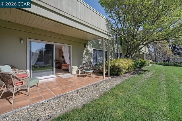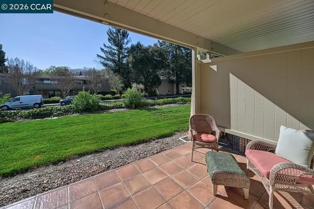 Charming two bedroom one bathroom delight featuring two wonderful patios one in the front with lots of space and a patio off of the living room with grassy views and morning sun. Wonderful location to walk to the fitness center or to the Farmer's Market. Updated paint throughout, gorgeous Engineered wood flooring throughout and decorative subway tile flooring in the bathroom. Kitchen was remodeled in 2020 with gorgeous Quartzite stone with complimentary backsplash, stainless steel appliances, including microwave. Newer electrical panel Levelor Blinds, Roman shades and curtains add extra flare to the property. Smooth ceilings in the living room, dining and entry area. Extra cabinets in the dining area. Second bedroom perfect for home office/TV room and views of the front outdoor living area. Updated bathroom with shower over tub and new easy access tub enclosure, subway tile flooring, Toto toilet and new Quartzite countertop facet and mirror add elegance to the room. Porcelain Tile elevate both patios, perfect for entertaining friends reading a book. Rear patio has grassy expanse which is perfect for a small pet! Laundry facility just steps away
