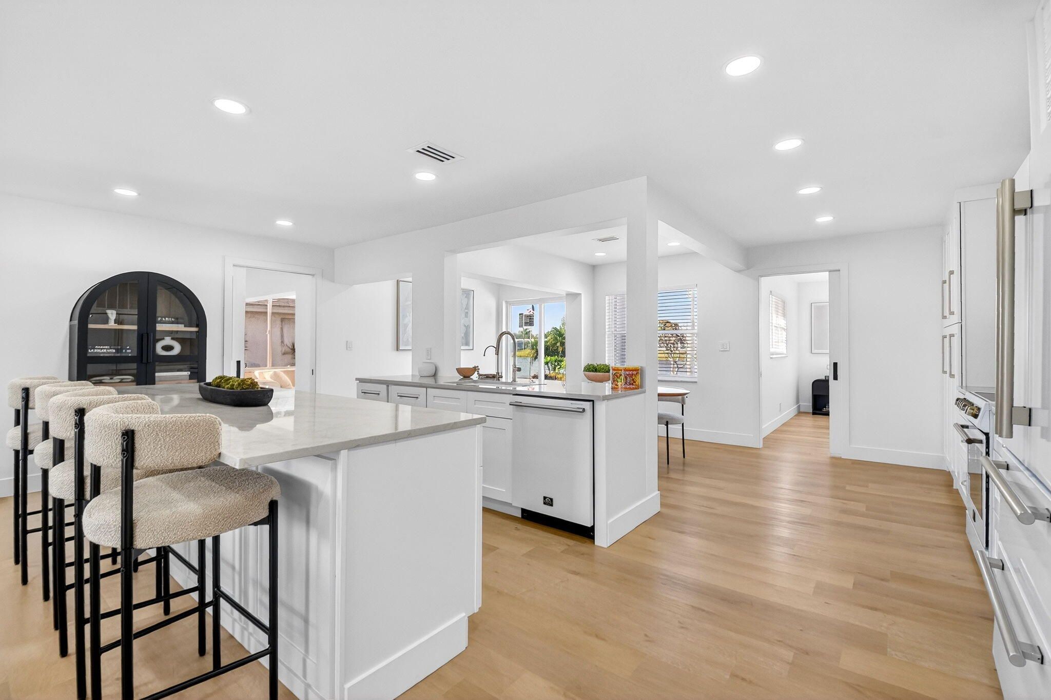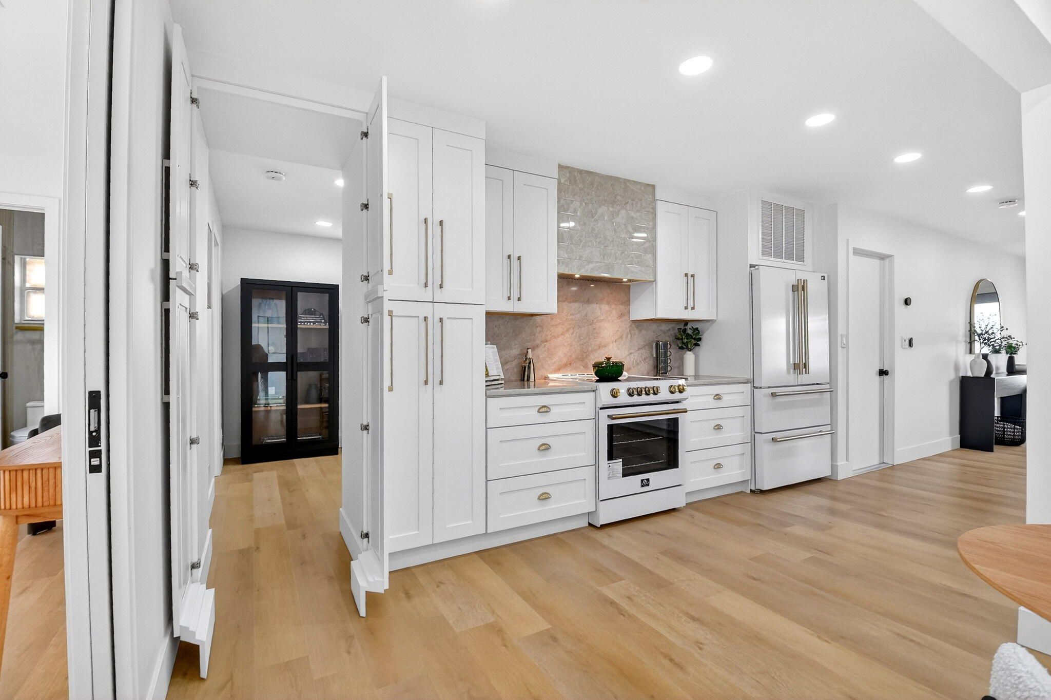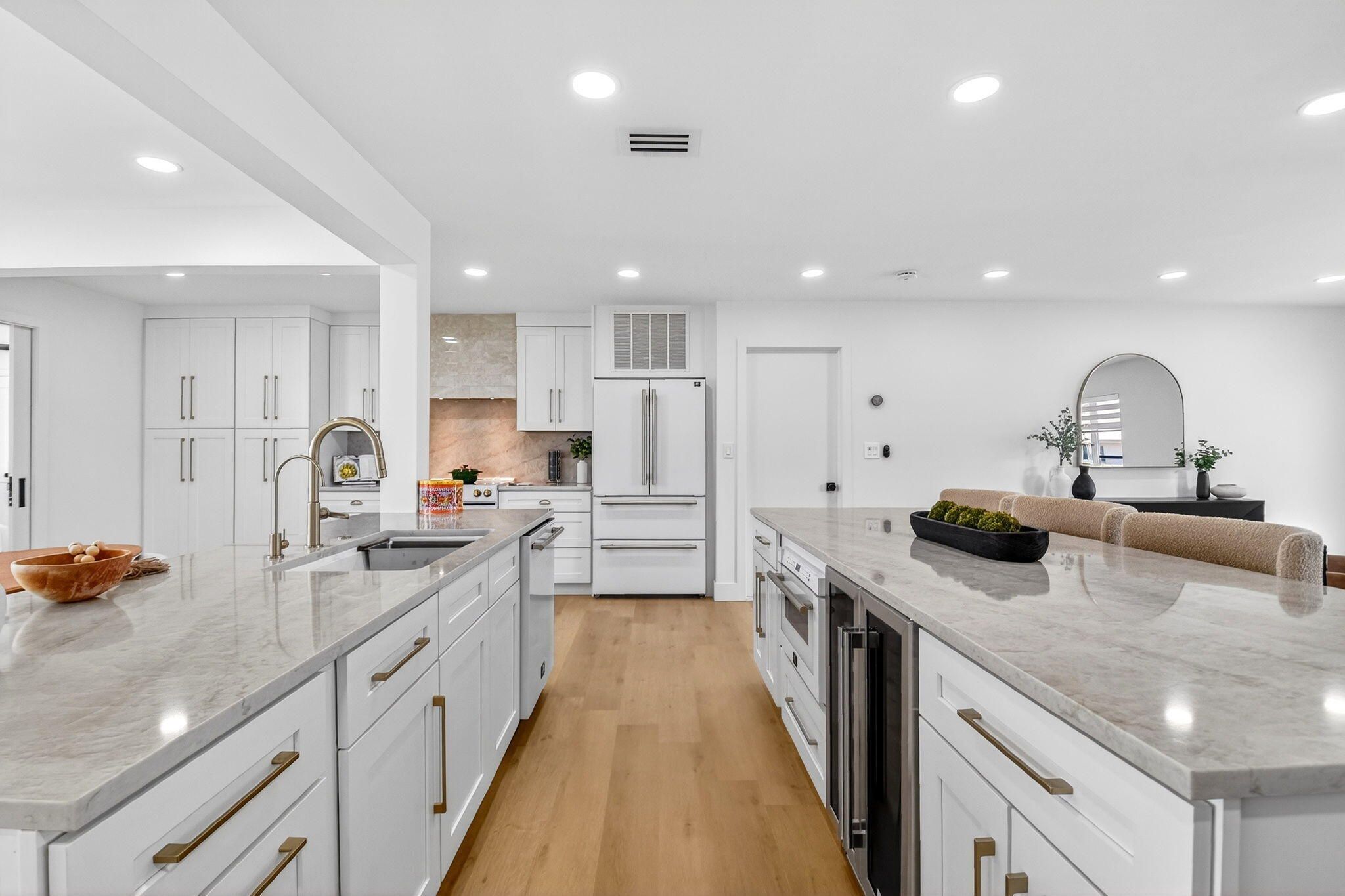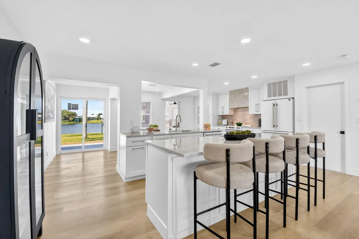 Waterfront at its finest. Set on a picturesque lake, this exceptional home offers 3 bedrooms & 2 baths, with every detail thoughtfully upgraded. This one of a kind designer home will take your breath away. Split floor plan with an open concept design. This 1700SF custom home includes 2 spacious ensuite bedrooms & a 3rd hidden bedroom which you can access through the secret pantry doors in the kitchen. Both the primary bedroom and its sitting area offer gorgeous views of the lake. This massive home features a dream custom kitchen with brand new Italian Forno appliances, Quartz countertops & massive Island with seating & substantial counter space. Kraus Faucet w/separate reverse osmosis water system faucet. Real wood, soft close cabinetry & double pantries with pull outs. 1 of 1. Must see! Custom Hood, Built in 8 Bottle and 56 Can Dual Zone Freestanding/Built-In Wine & Beverage Refrigerator, Spa-like bathrooms feature floor to ceiling tile and added storage space. New Floors/baseboards 5+inch throughout. Brand new stacked LG front load washer/dryer w/butcher block counter top laundry/folding area. Entire interior freshly painted-no popcorn ceilings and smooth walls. All doors, handles, locks, recessed lighting, ceiling fans are new. Entire exterior has been resurfaced stucco'd and painted. New Roof, Fascia & New soffits, New Water Heater. Garage, driveway and porch repainted and sealed. New hedges and rubber mulch and sod added to front and back of home. All new exterior lighting including some solar. 1 of 1. This won't last. Must see!