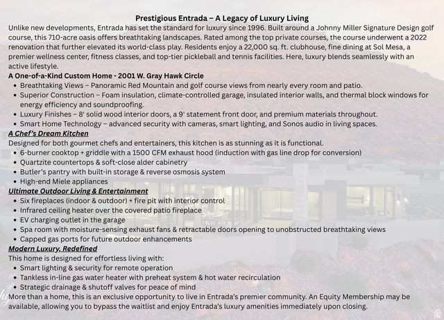 Exquisite, 3bed + office, like-new single-level custom home elevated capturing breathtaking panoramic views of red mountains, golf course, & southern horizon. Nearly every room positioned to frame the view. Enjoy ultra high-end design that seamlessly blends luxury with cutting-edge technology & premium upgrades: professional kitchen w/ Wolf, Sub-Zero, & Miele appliances, quartzite countertops, custom cabinetry, & spacious butler's pantry. Experience seamless indoor-outdoor living with covered patios, 6 fireplaces, infrared heating, & spa room featuring fully retractable glass walls designed to showcase the reason you want to live in Entrada, the VIEW. Smart home automation ensures effortless lock-and-leave living. Shown by appointment only. Taxed at SECOND home. Entrada Club Assoc membership required $220/mo