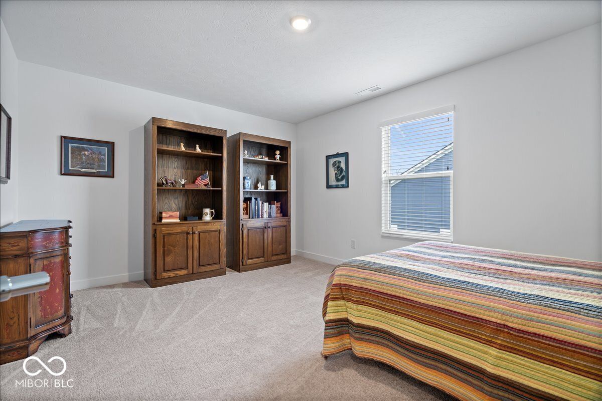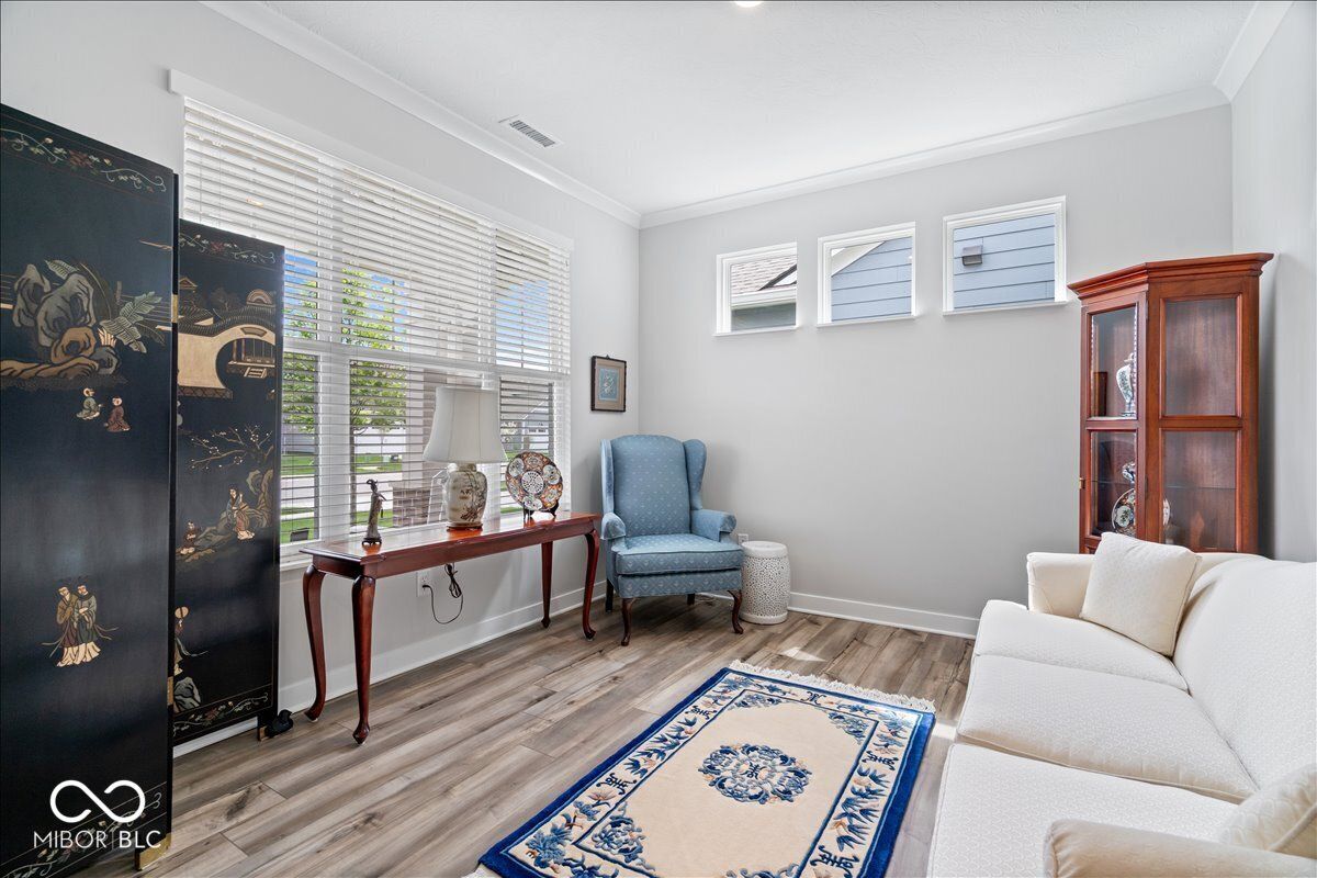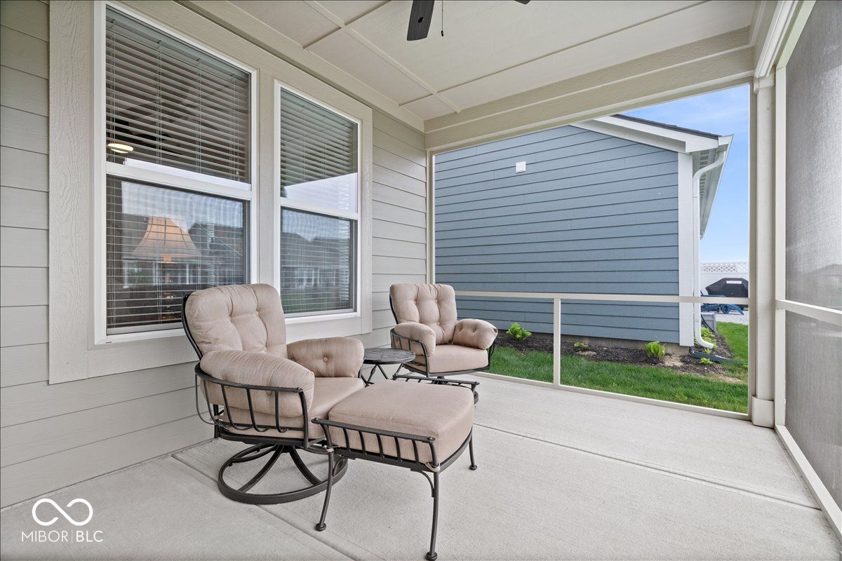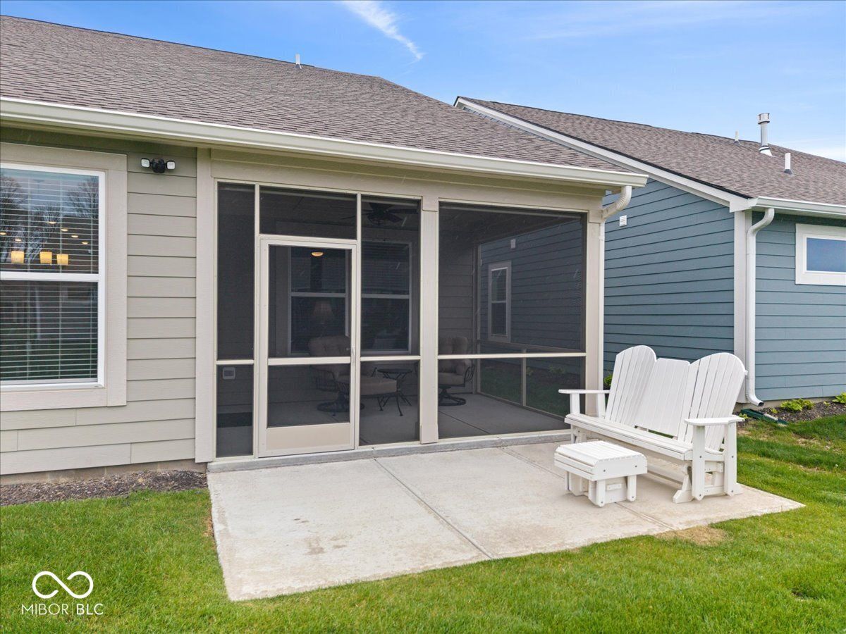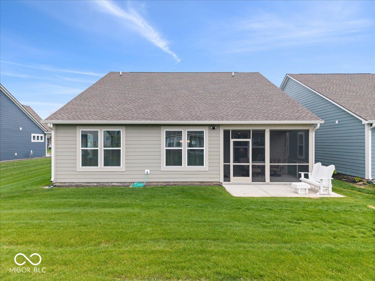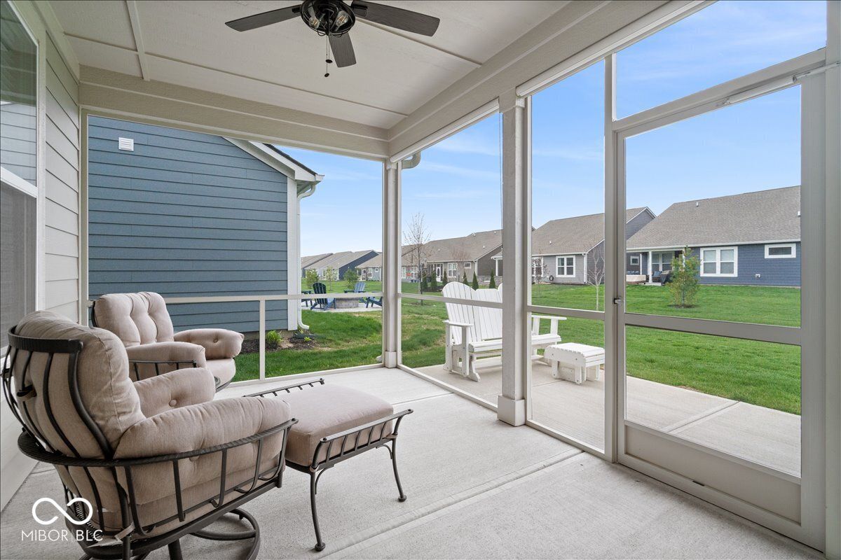 Experience refined living in this exceptional 3-bedroom, 3-full-bath home, showcasing the highly sought-after Shafer C floor plan by Lennar, built in 2023. Thoughtfully designed with elegance and functionality in mind, this home offers a spacious open-concept, split floor plan layout, with the primary suite on the main level, a private office, a guest bedroom with full bath. The sophisticated entry is highlighted by a tray ceiling and custom wainscoting. Sliding barn doors introduce the main-level office, where a transom window fills the space with natural light-ideal for remote work or creative pursuits. Crown molding throughout the main level enhances the home's polished aesthetic, while generous storage and closet spaces add everyday convenience. Primary suite is a private retreat featuring a tray ceiling, an expansive walk-in closet customized by Closets by Design, double comfort-height vanity, and a spa-inspired walk-in shower complete with grab bars and a built-in seat. Thoughtfully designed laundry room offers dual access from the primary closet and hallway. Off the kitchen, a beautifully appointed screened-in porch invites indoor-outdoor living accessible by a new Pella sliding door with built-in blinds. The upper level offers a versatile loft, additional bedroom, and a full bath-ideal for hosting guests or creating a private secondary living space. The garage includes a 4-foot bump-out with a window, providing enhanced storage or workshop potential. Residents enjoy resort-style living within this premier 55+ community, featuring two clubhouses, including the impressive 9,000-square-foot main clubhouse, The Retreat. Amenities include lap and leisure pools, two fitness centers, pickleball and tennis courts, bocce ball, gaming areas, firepits, scenic ponds, and walking trails, along with a vibrant calendar of social events! Lawn care, mulching, and snow removal are included for maintenance-free living, while the irrigated yard ensures effortless upkeep!