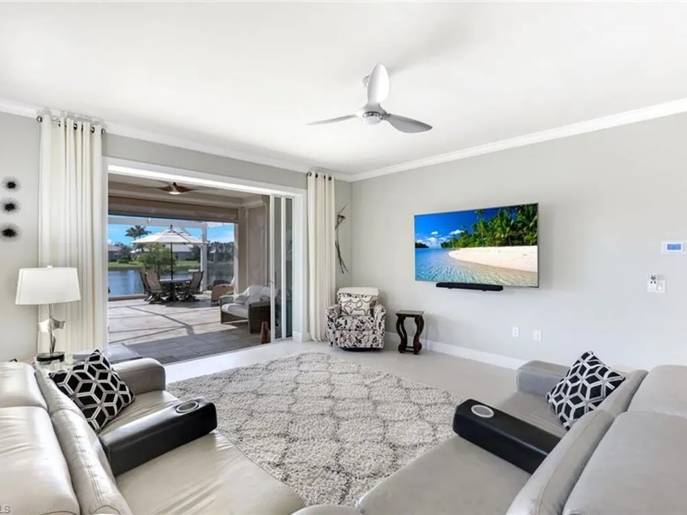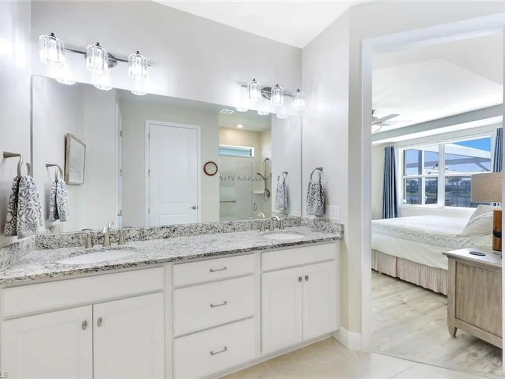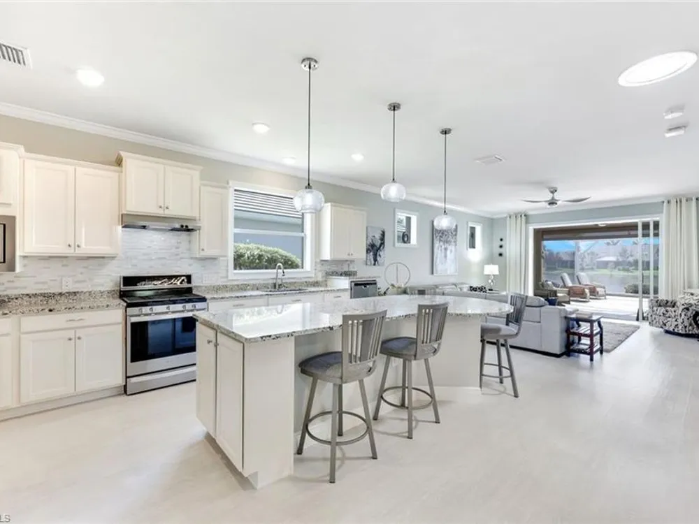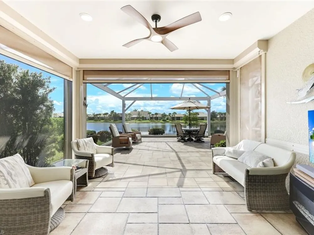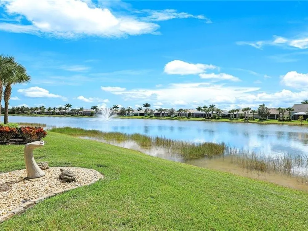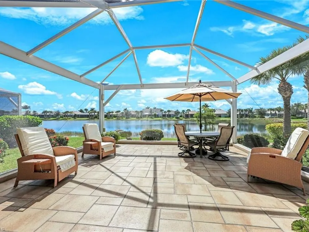 Nestled in the picturesque city of Estero, this exquisite lakefront property offers a blend of luxury and functionality, perfect for those seeking a vibrant community lifestyle. The home is located in a prestigious gated community, where residents enjoy top-tier amenities, including a state-of-the-art fitness center, pickleball and tennis courts, bocce, a rejuvenating spa, a community pool, and a charming library. Designed for entertaining and relaxation, the outdoor space features a 20x20 extended lanai and a covered patio, showcasing breathtaking views of the serene lake. Culinary enthusiasts will appreciate the gourmet kitchen, equipped with stainless steel appliances, a conveniently raised dishwasher, instant hot water, a gas range, and elegant 42' cabinetry. Recent renovations have enhanced the home's functionality, adding a separate 10x12 workroom area in the garage, a pull-down ladder to access attic storage, and crown molding throughout. The property boasts custom landscaping serviced by a drip system, ensuring year-round beauty, and electric storm screens on the lanai and accordion shutter on all windows offer added protection and No CDD. For ultimate convenience, a generator is included, ensuring peace of mind during Florida's stormy seasons. Ideally positioned close to pristine beaches, the property is just minutes from a variety of dining and shopping destinations, including Miromar Outlets, Hertz Arena, Gulf Coast Center, and Coconut Point Shopping areas, with the SWFL International Airport also within easy reach. This home represents combined luxury, comfort, and unrivaled convenience in a breathtaking lakeside setting.