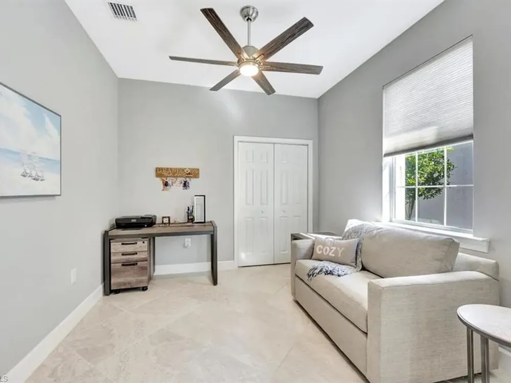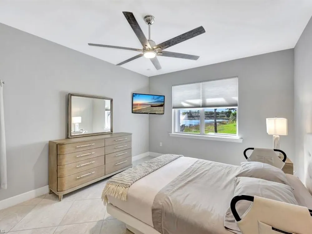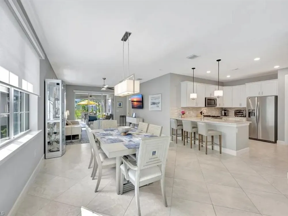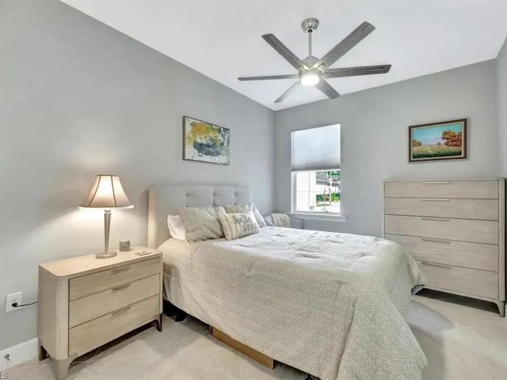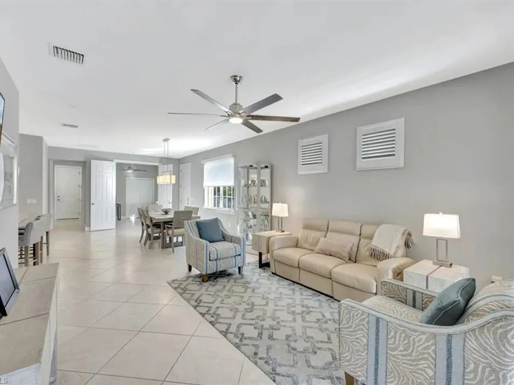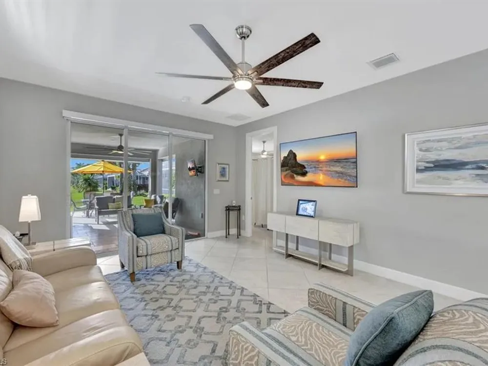 Welcome to this extraordinary lakefront home in vibrant Estero, where luxury meets convenience in this gated community. This home features an extended lanai offering a panoramic water view, exquisite tropical landscaping, perfect for relaxation and entertaining with your outdoor kitchen, travertine floor tile and **Oversized Spa with seating for up to 10 people.** Safety and comfort are paramount with electric hurricane screens and accordion shutters on all windows. Inside you will find sleek stainless-steel appliances, a natural gas cooktop and French doors leading to the third bedroom or den. Custom lighting and fans throughout. This home offers handicap accessibility, with a primary bathroom designed to accommodate a wheelchair. Recent updates enhance peace of mind, including a new hot water heater in 2024, new A/C in 2025, roof cleaning in 2024, and a new saltwater tank for the spa in 2025. Additional features like epoxy garage floors further elevate the property's allure. ***NO CDD or FLOOD INSURANCE REQUIRED. *** This community is enriched with unmatched resort style amenities. Experience an active lifestyle with access to the Amenities, Fitness Center, Library, Pickleball, Tennis, Bocce, Dog park, Cabanas, BBQ area, and a stunning Community Pool complete with lap lanes and spa. Conveniently located near shopping, RSW Airport, Hertz Arena, sunny beaches, restaurants, and healthcare facilities, this home perfectly balances tranquil living with urban accessibility.