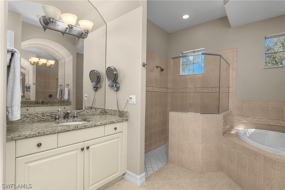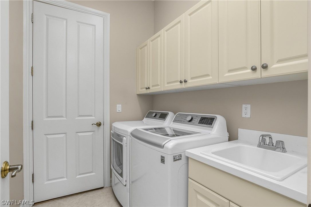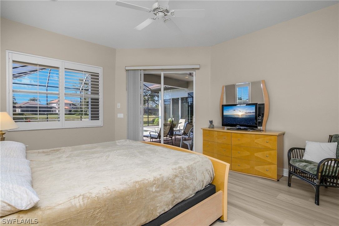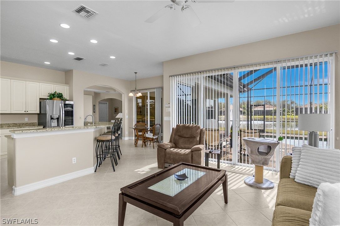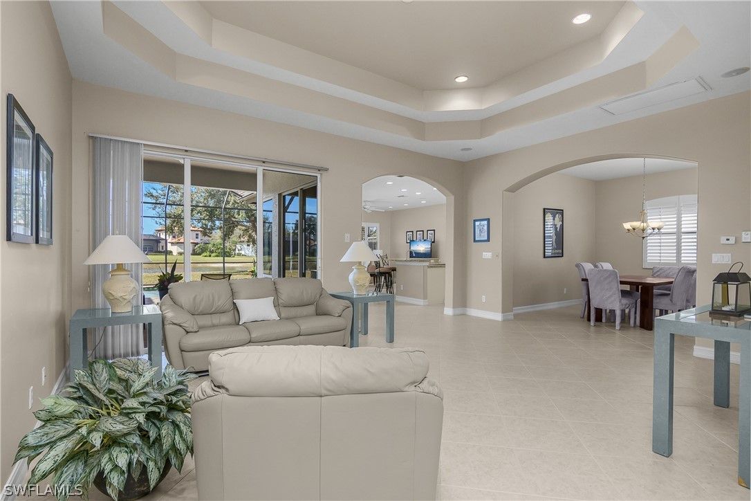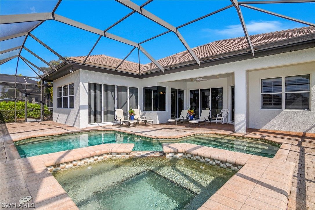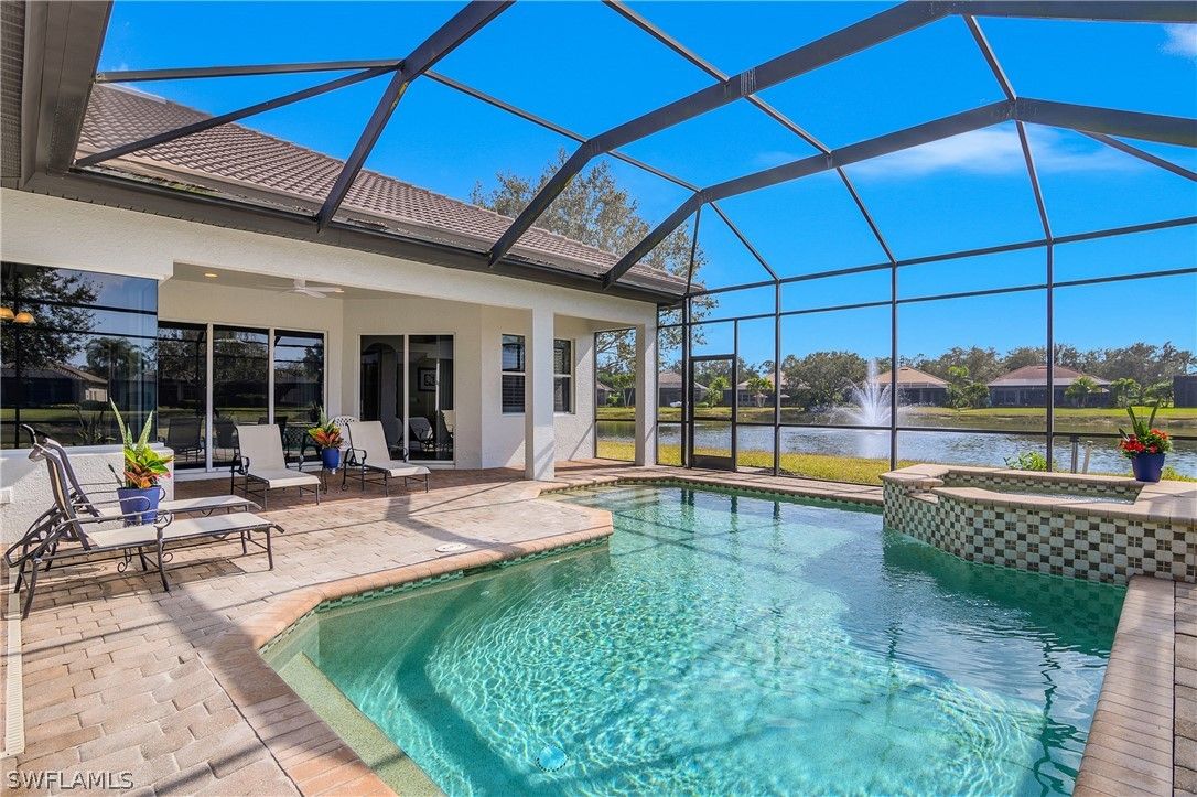 One of a kind CUL-DE-SAC END OF PENINSULA LAKE FRONT lot surrounded by WATER ON TWO SIDES!! NEW ROOF(10/22), Exterior painted(7/25), ALL NEW LG PREMIUM APPLIANCES in kitchen and laundry room(2/22), NEW high end LVP FLOORING in all three bedrooms(10/25), tile and grout cleaned and sealed(2/26), New water heater(12/24), New backflow valve(10/24), New AC system(8/19), New AC condenser(8/24), pool cage rescreened(10/22). View the fountain in the lake and the trees on the island in the middle of the road as you approach your LONG DRIVEWAY to enter your private retreat. Enjoy the spaciousness of 10' minimum ceiling heights throughout and a 14' ceiling in the foyer and a double coffered 13' ceiling in the living room as well as rounded corners and 8' doors in this Stock built home. All countertops are granite in the kitchen and bathrooms, natural wood shelving in the kitchen pantry and all closets, plantation shutters and upgraded 42" cabinets in the kitchen. Pool/spa area has preferred western and southern exposure and is surrounded by a wrap around lake with fountain. Grandezza has a 53,000 square foot Clubhouse with fine dining indoors and in the Hub Bar with outdoor dining on the Veranda all on the second floor. The first floor offers a newly remodeled fitness center and casual dining at Bogey's. There is a covered Cabana Bar outdoors adjacent to the Junior Olympic-size pool. Grandezza has active Golf and Tennis communities and many other clubs and activities for residents. Close to shopping, dining, sporting events, entertainment, I-75 and the RSW airport. OPTIONAL GOLF MEMBERSHIP IS CURRENTLY AVAILABLE at the 18-hole Championship golf course. Located in desired Zone "X".