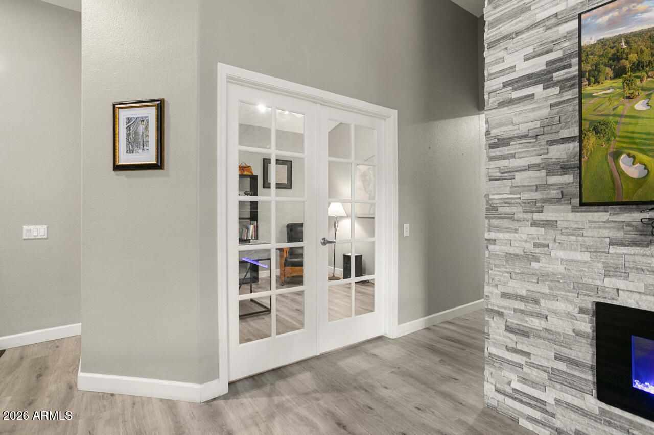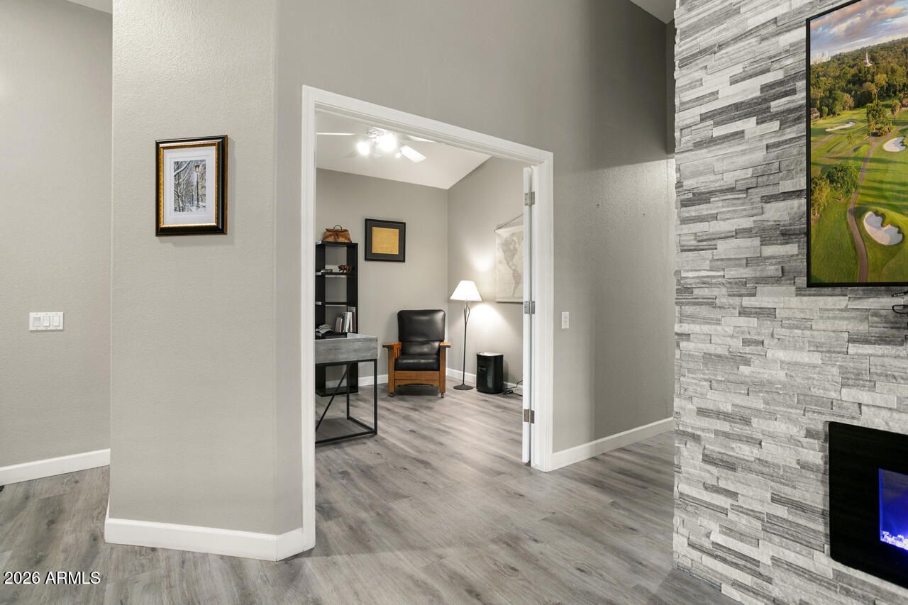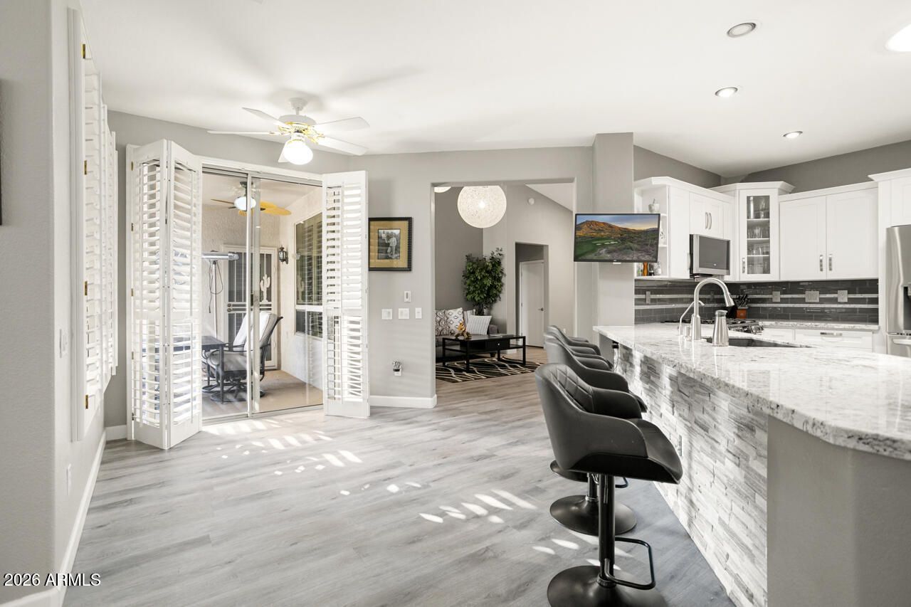 Come see this exceptional Stonecrest before it's gone! One of the few with the stunning formal dining in lieu of the great room. Starting with great curb appeal, beautiful finishes, and standout stone accents, this is a true showstopper. Completely remodeled in 2020, this 3BD/3BA home blends modern updates with cohesive design. Features include a custom stone TV wall with electric fireplace in living space, luxury vinyl plank flooring throughout, and a neutral gray and white color palette. The kitchen boasts a 3rd pantry, updated cabinets, granite countertops, 2025 New Appliances large breakfast bar and newer appliances—ideal for those who love to cook or entertain. The split floor plan offers privacy for guests, with a second bedroom that includes a full ensuite bath. The primary bedroom is extended with a bay window, big enough for a sitting area, a private exit to the patio, a full ensuite bath with large soaking tub and walk-in shower, lots of designer tile, and a walk-in closet. There is plenty of room in the 2.5 car garage for added storage and workspace. The relocated laundry in the garage, keeps the heat and noise out of the home. Outside, enjoy lush landscaping with fruit trees, a private backyard with an expanded covered patio, cool deck surface, partial walls and a cozy fireplaceperfect for outdoor living and entertaining.