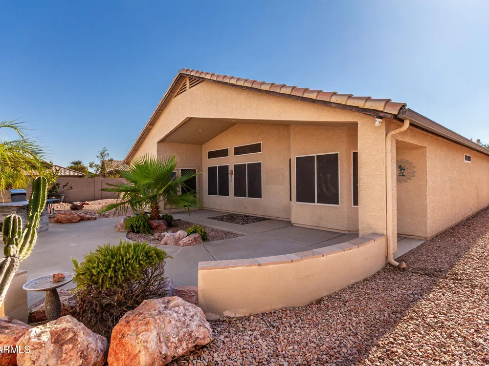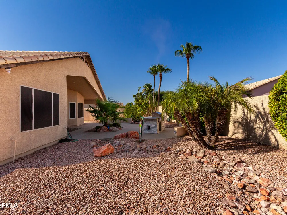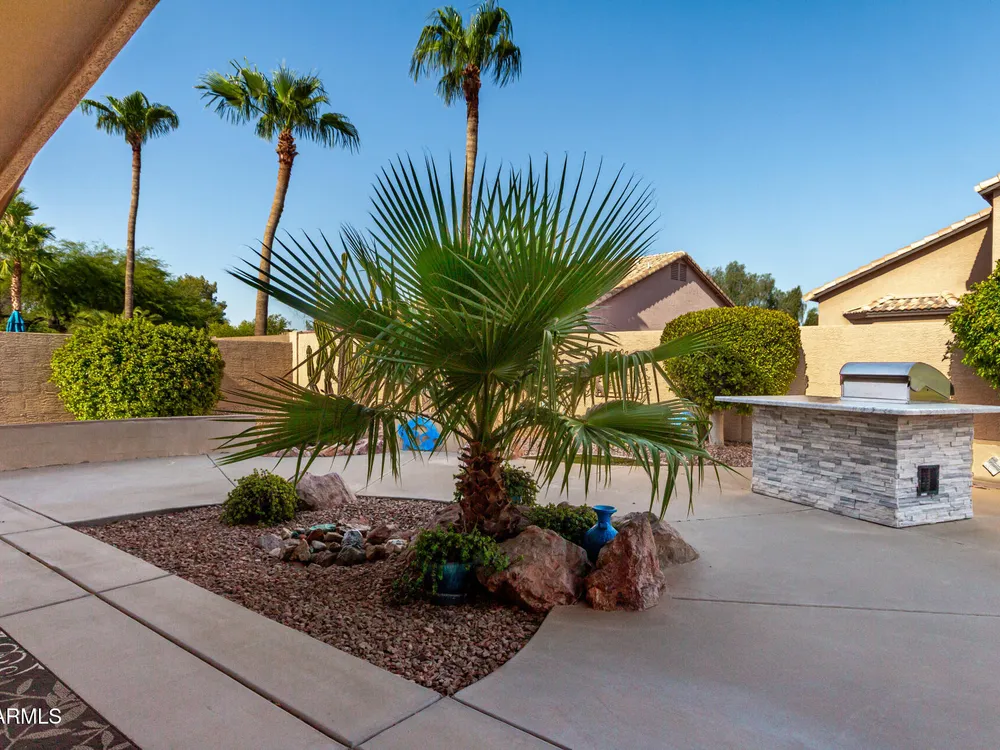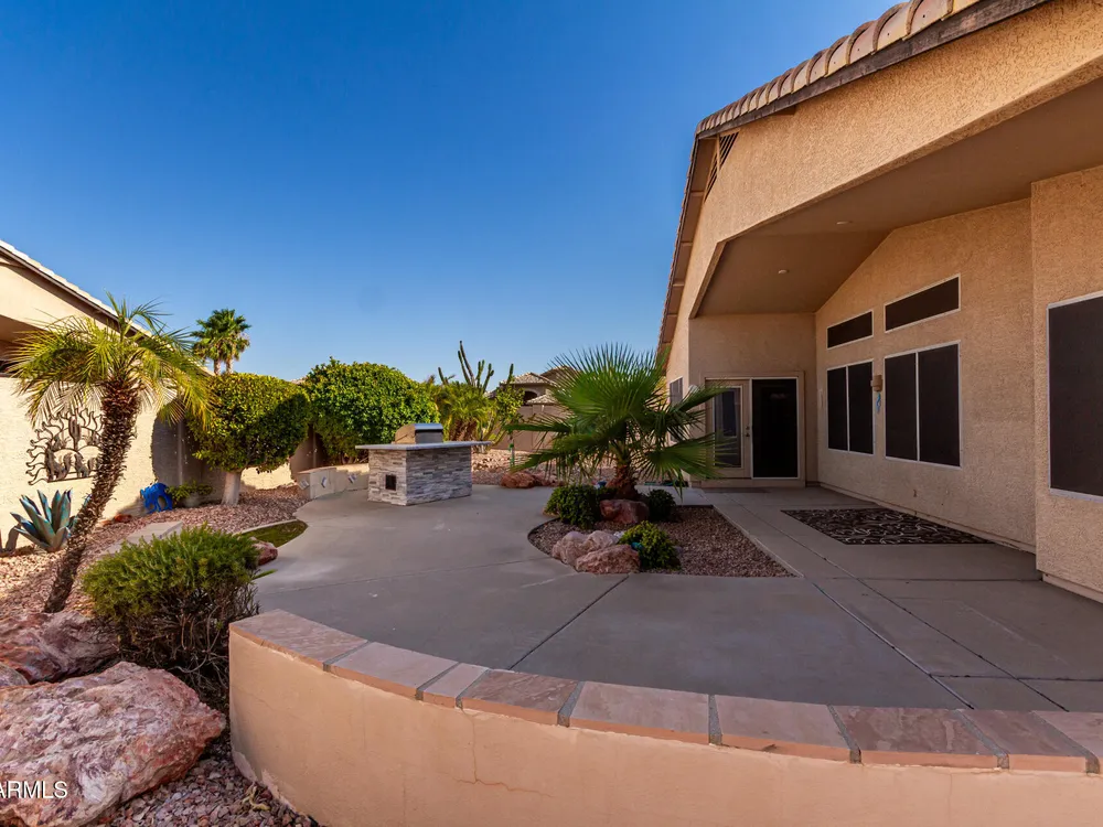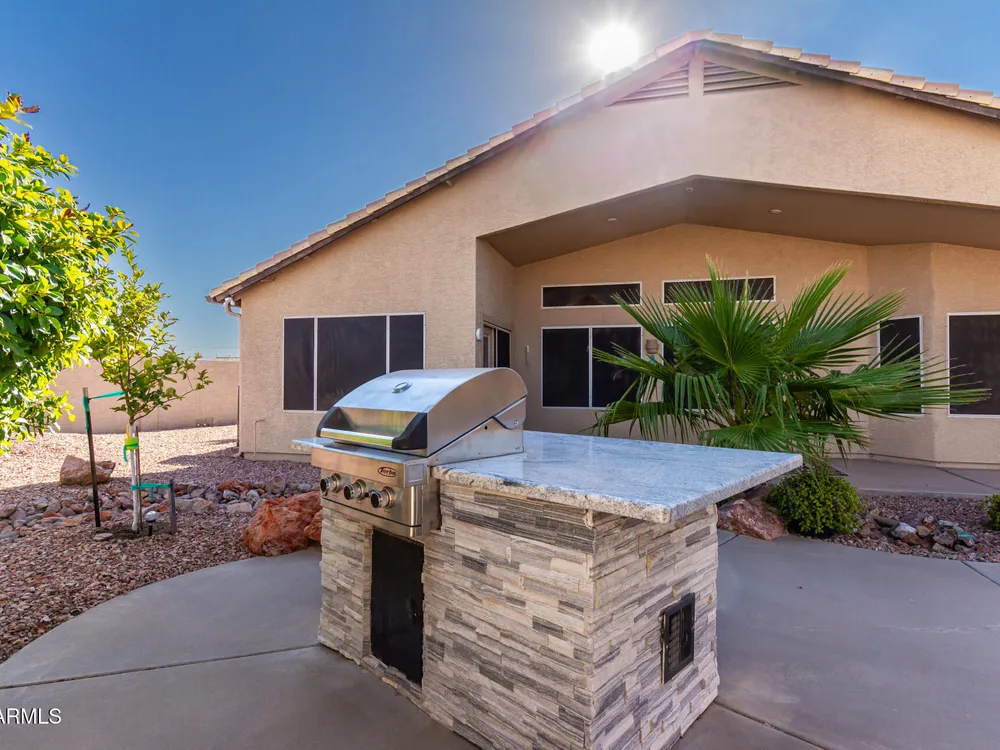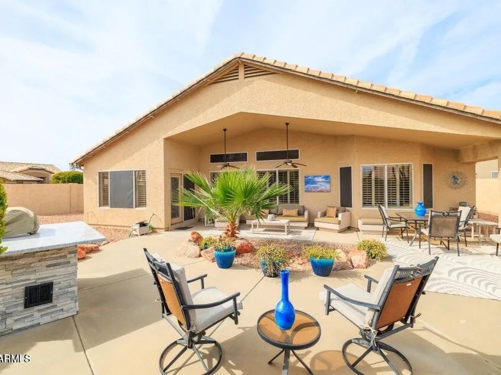Beautifully designed desert retreat inspires you to relax & enjoy this open-concept split floor plan home, w/2 primary suites plus a versatile office/den/3rd bedroom. Updated kitchen flows seamlessly into the living & dining areas, featuring a bar-height counter for casual dining, white cabinetry w/pull-outs, tile countertops, & SS appliances, includes new dishwasher, gas range & hood (2025). Vaulted ceilings & wood shutters highlight this home's warm, inviting style. French doors lead to your private backyard oasis & lush greenery & extended patio set the stage for Arizona living at its best. Entertain w/ease at the stacked-stone BBQ island w/granite counter & built-in natural gas grill or simply relax & soak in the breathtaking sunrises & sunsets. An extra-wide garage w/side-yard access completes this exceptional home designed for comfort, style, & the Arizona lifestyle. Home is close to the Yacht Club pool, spa, sports courts, and billiards room. Residents of Ventana Lakes enjoy 9 lakes, 4 pools, 4 jetted spas, fitness center, 2 saunas, billiards room, lending library, pickle ball, sports courts, numerous clubs, planned social activities, Bingo, and so much more. Catch & release fishing, walking paths around the lakes, & non-motorized boating are some of the additional pastimes. Frequent lake visitors include ducks, geese & other wildlife. Close to lake walking paths, local amenities, shopping & more! Quick commute to the 101 & 303 Note: staging items & staging furniture are not included in sale. Two plants in pots at each side of garage are not included in sale.