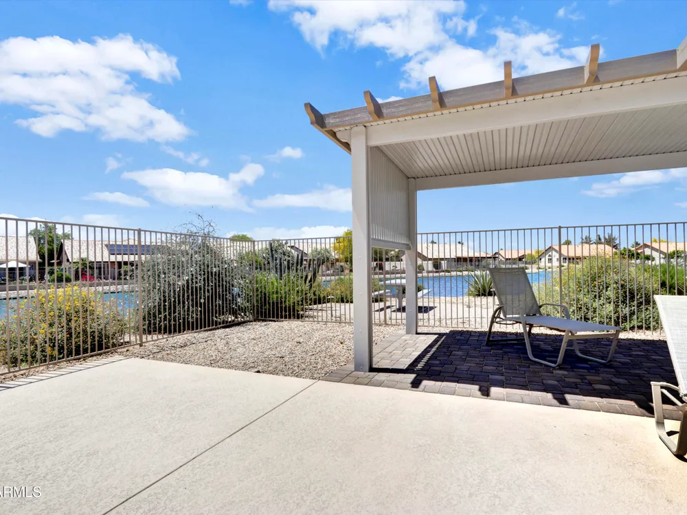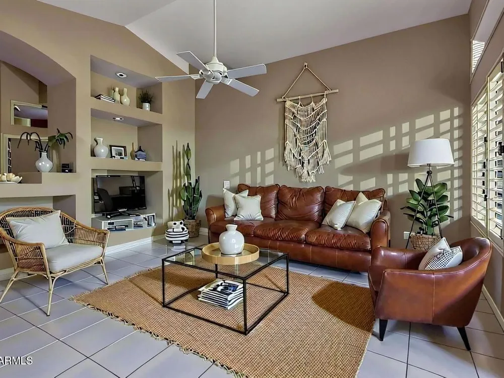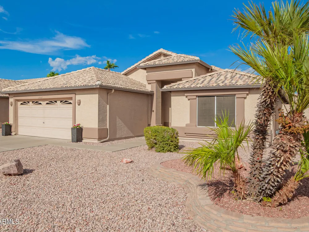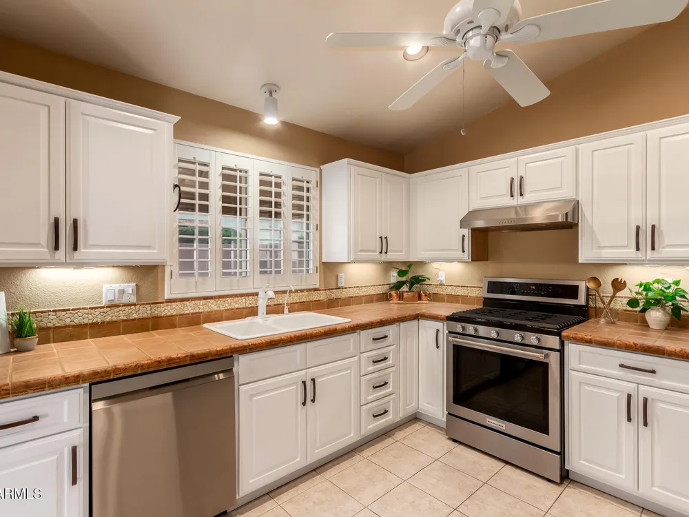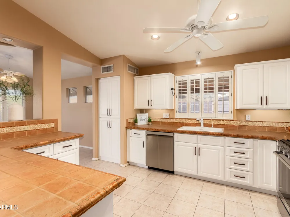 Beautifully designed desert retreat inspires you to relax & enjoy this open-concept split floor plan home, w/2 primary suites plus a versatile office/den/3rd bedroom. Updated kitchen flows seamlessly into the living & dining areas, featuring a bar-height counter for casual dining, white cabinetry w/pull-outs, tile countertops, & SS appliances, includes new dishwasher, gas range & hood (2025). Vaulted ceilings & wood shutters highlight this home's warm, inviting style. French doors lead to your private backyard oasis & lush greenery & extended patio set the stage for Arizona living at its best. Entertain w/ease at the stacked-stone BBQ island w/granite counter & built-in natural gas grill or simply relax & soak in the breathtaking sunrises & sunsets. An extra-wide garage w/side-yard access completes this exceptional home designed for comfort, style, & the Arizona lifestyle. Home is close to the Yacht Club pool, spa, sports courts, and billiards room. Residents of Ventana Lakes enjoy 9 lakes, 4 pools, 4 jetted spas, fitness center, 2 saunas, billiards room, lending library, pickle ball, sports courts, numerous clubs, planned social activities, Bingo, and so much more. Catch & release fishing, walking paths around the lakes, & non-motorized boating are some of the additional pastimes. Frequent lake visitors include ducks, geese & other wildlife. Close to lake walking paths, local amenities, shopping & more! Quick commute to the 101 & 303 Note: staging items & staging furniture are not included in sale. Two plants in pots at each side of garage are not included in sale.