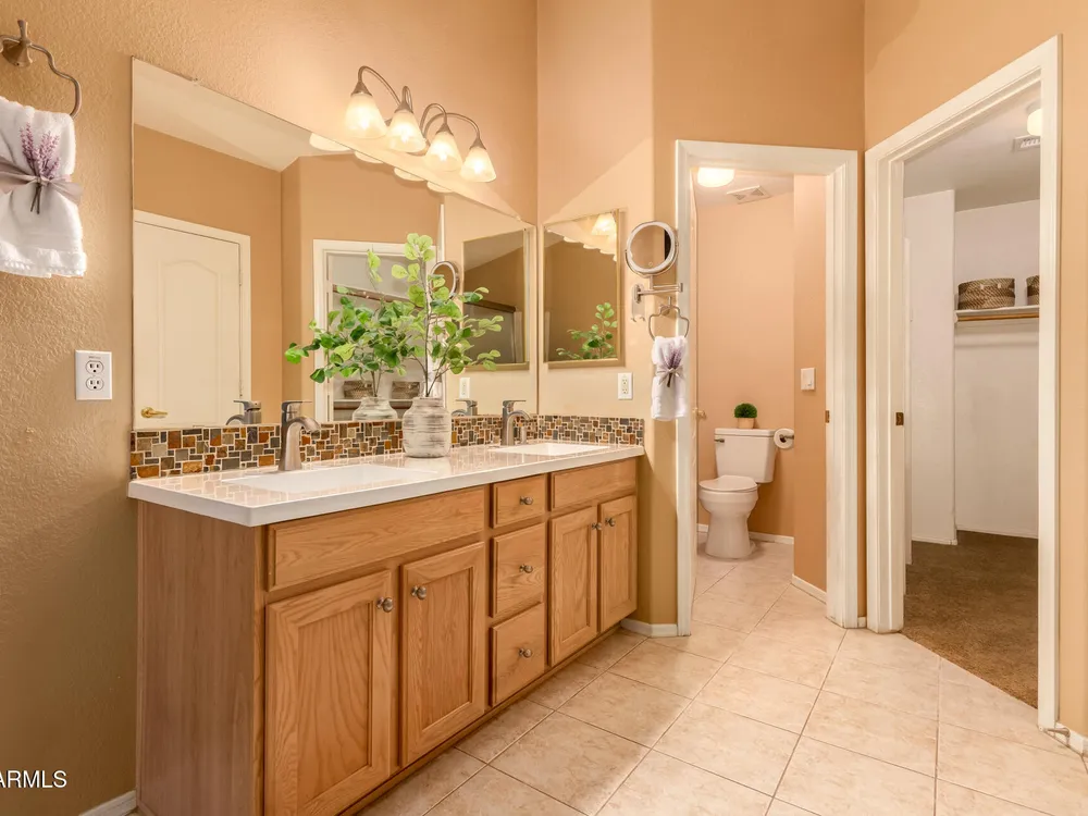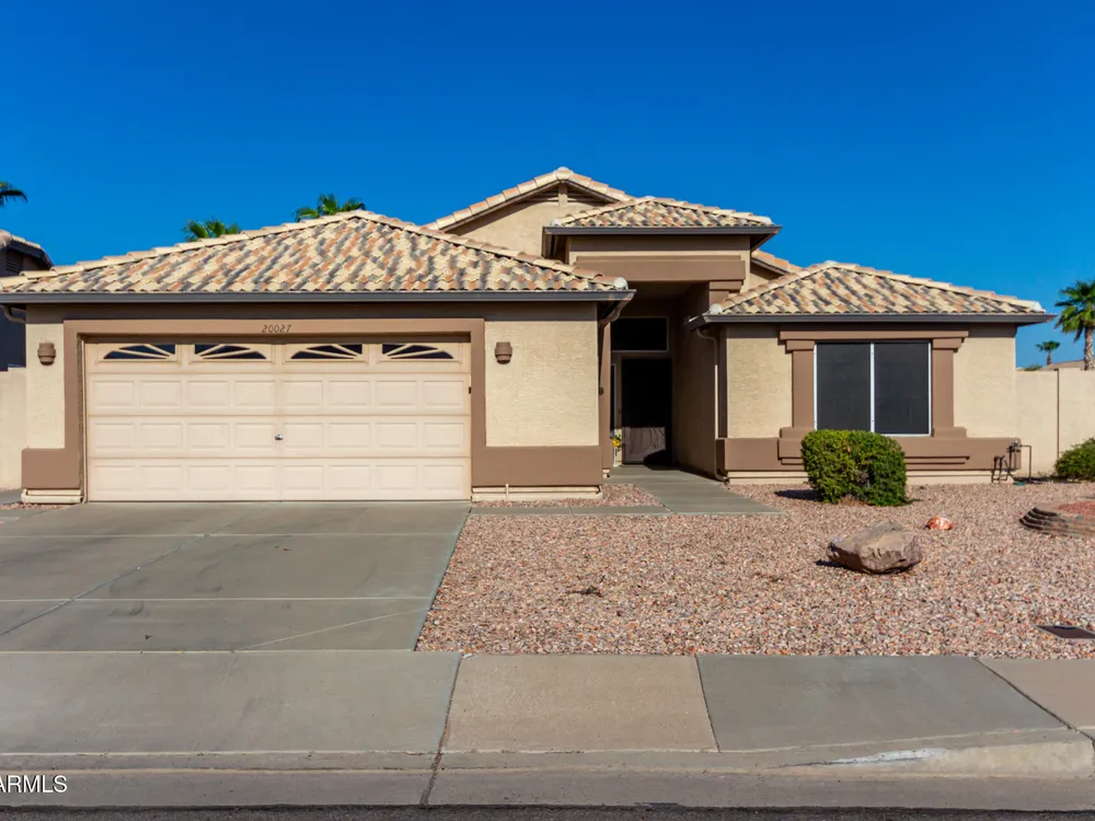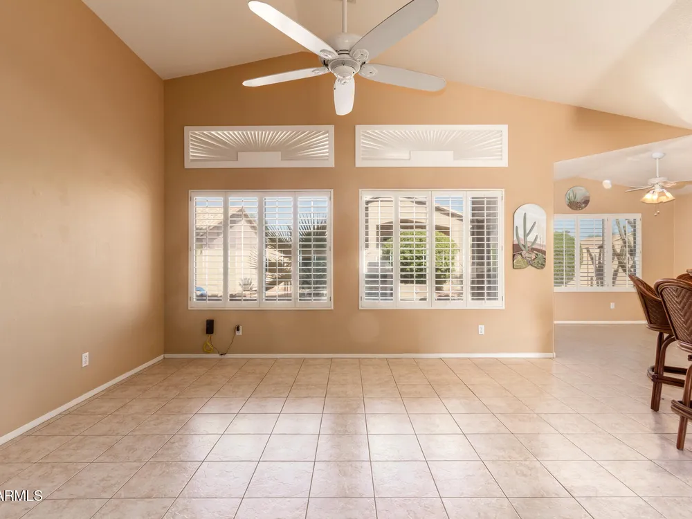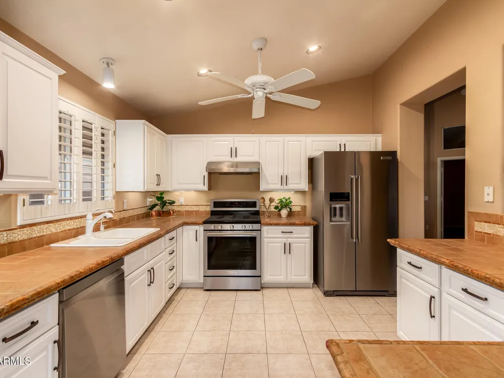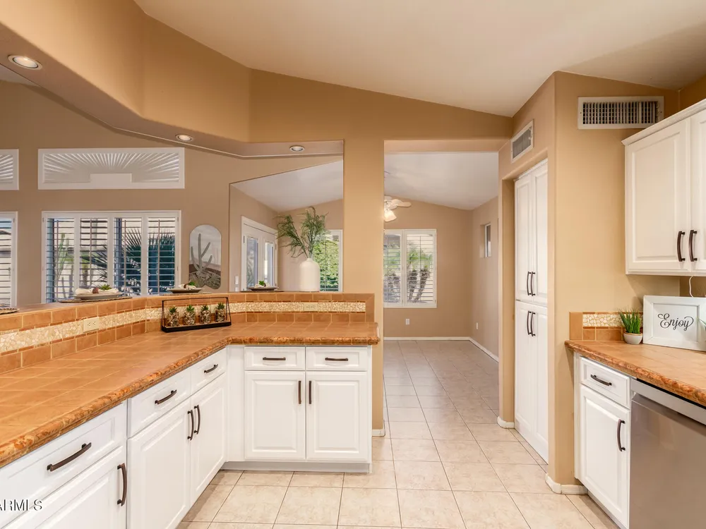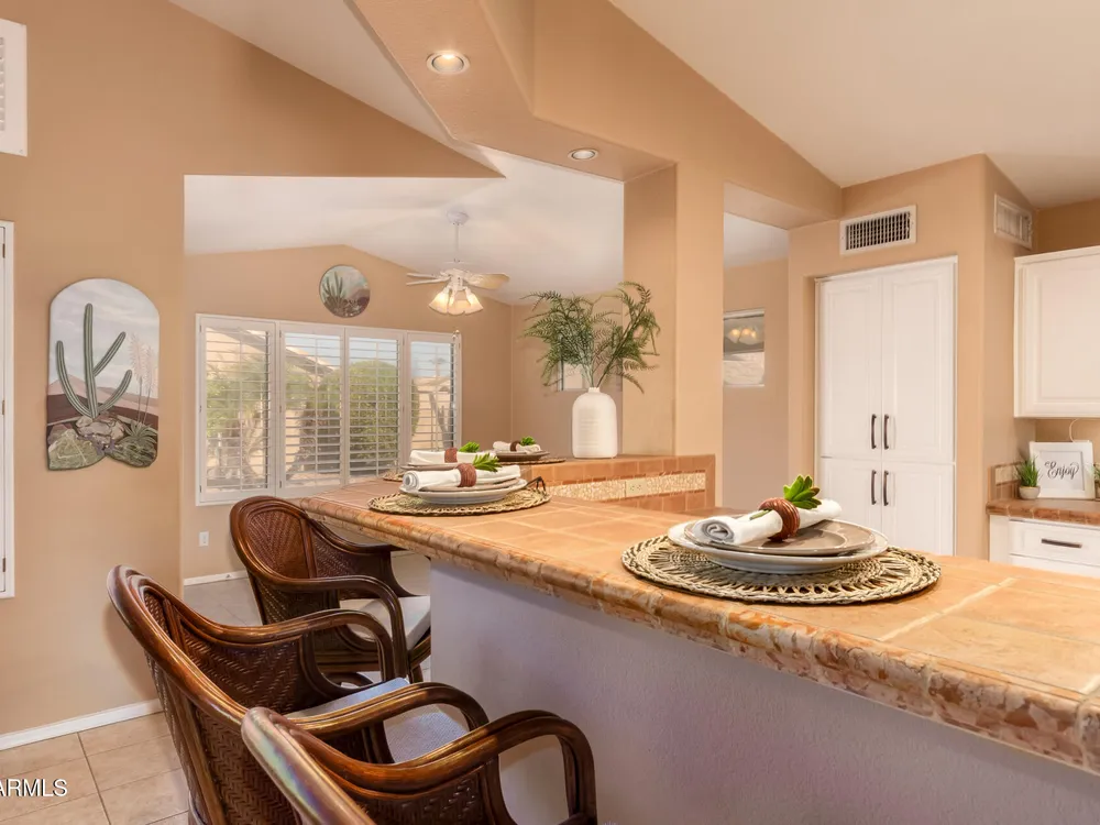 Beautifully designed desert retreat inspires you to relax & enjoy this open-concept split floor plan home, w/2 primary suites plus a versatile office/den/3rd bedroom. Updated kitchen flows seamlessly into the living & dining areas, featuring a bar-height counter for casual dining, white cabinetry w/pull-outs, tile countertops, & SS appliances, includes new dishwasher, gas range & hood (2025). Vaulted ceilings & wood shutters highlight this home's warm, inviting style. French doors lead to your private backyard oasis & lush greenery & extended patio set the stage for Arizona living at its best. Entertain w/ease at the stacked-stone BBQ island w/granite counter & built-in natural gas grill or simply relax & soak in the breathtaking sunrises & sunsets. An extra-wide garage w/side-yard access completes this exceptional home designed for comfort, style, & the Arizona lifestyle. Home is close to the Yacht Club pool, spa, sports courts, and billiards room. Residents of Ventana Lakes enjoy 9 lakes, 4 pools, 4 jetted spas, fitness center, 2 saunas, billiards room, lending library, pickle ball, sports courts, numerous clubs, planned social activities, Bingo, and so much more. Catch & release fishing, walking paths around the lakes, & non-motorized boating are some of the additional pastimes. Frequent lake visitors include ducks, geese & other wildlife. Close to lake walking paths, local amenities, shopping & more! Quick commute to the 101 & 303 Note: staging items & staging furniture are not included in sale. Two plants in pots at each side of garage are not included in sale.