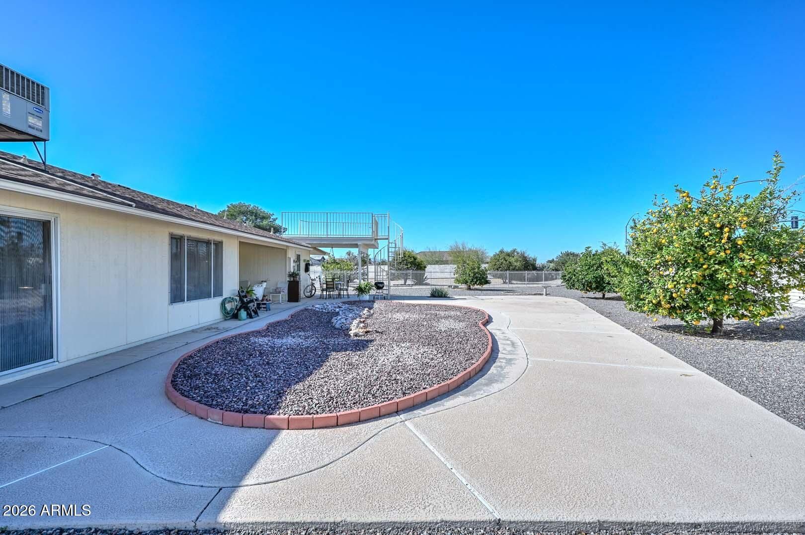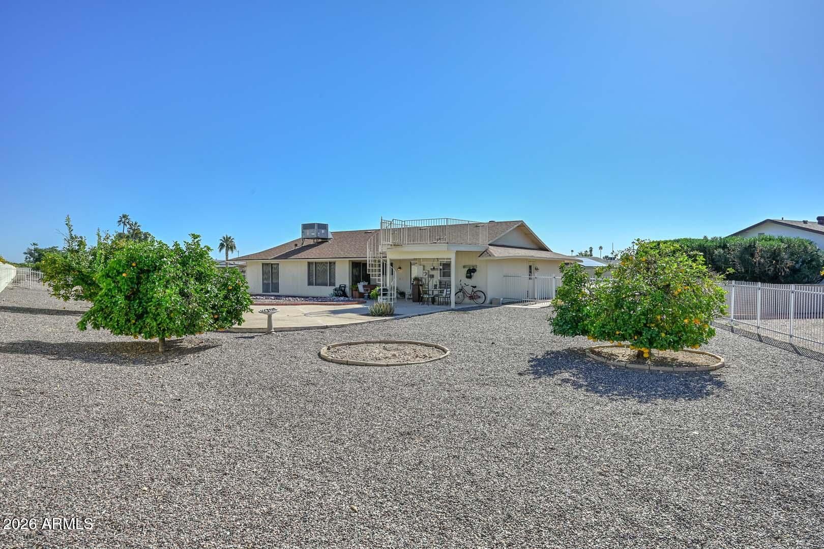 This wonderful extended Wilmington model that is a 2‑bedroom home offers great curb appeal and sits on a quiet cul‑de‑sac in Phase 3 of Sun City. The light and bright open floor plan features a kitchen with hickory cabinets, granite countertops, and stainless steel appliances. Both bathrooms have been updated, and the spacious laundry/hobby room includes a utility sink and abundant storage. Tile flooring is found in the kitchen, laundry room, and baths. The garage offers additional built‑in cabinets, while the backyard includes a covered patio with extended decking, an upper balcony with stair access, three fruit trees, and a fully fenced yard perfect for pets, plus low‑maintenance desert landscaping in front. There have been many updated done to this home between 2012 - 2025 so make sure to ask your agent about the updates that have been done. This is a must see home it is price to sell!