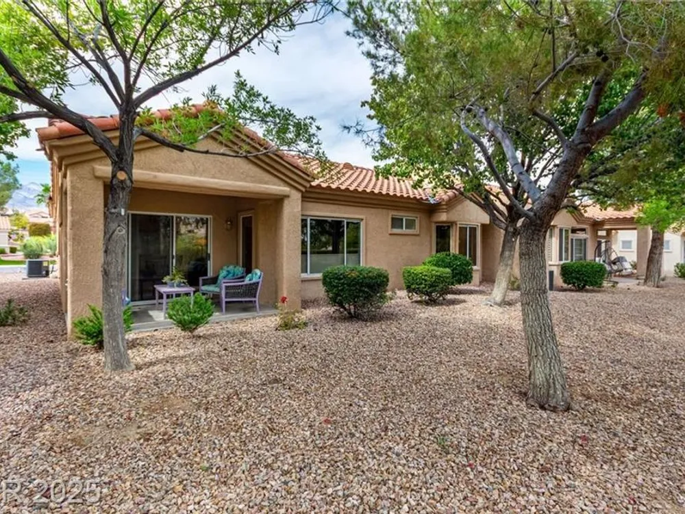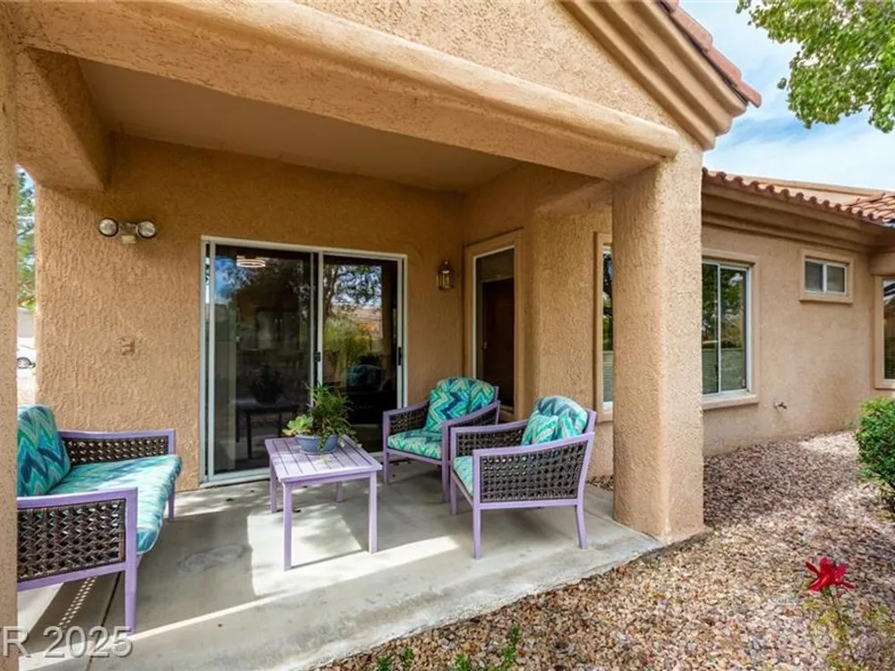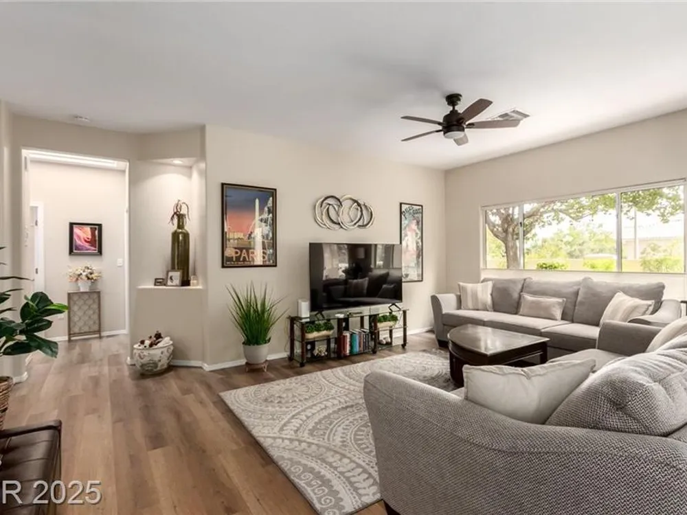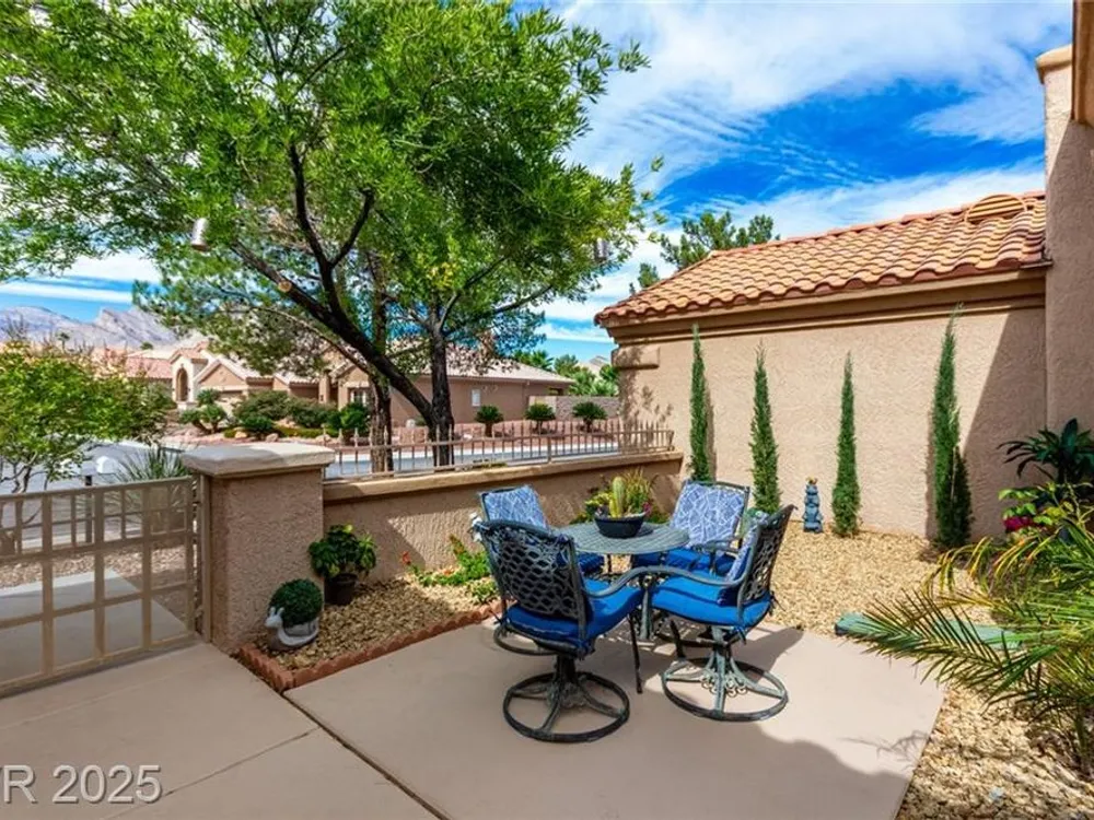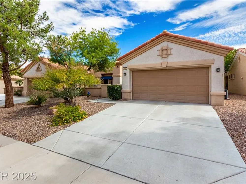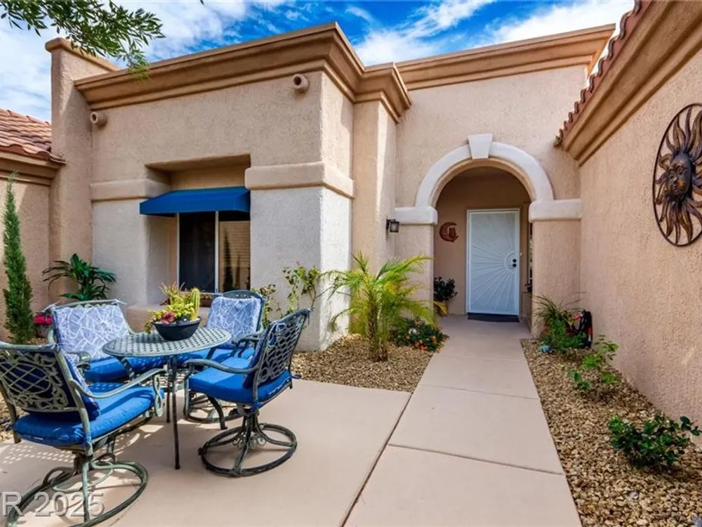 Discover the charm of this inviting 2-bed, 2-bath townhome in Sun City Summerlin! Starting with a 2-car garage, a low-maintenance landscape, and a gated front patio. Come inside to find a seamlessly flowing living & dining room, perfect for gatherings. Natural light filled the welcoming interior, complemented by a neutral palette, and tile & wood-look flooring in all the right places. The impressive kitchen boasts stainless steel appliances, wood cabinetry, and ample counter space. The primary bedroom has a bay window and a private bathroom with dual sinks. While the secondary bedroom can be an office as well. The laundry room includes a sink & cabinetry for added convenience. Check out the tranquil backyard, featuring a covered patio to relax and mature trees for a constant breeze! Sun City Summerlin is a 55+ Community, offering resort-style amenities such as golf courses, fitness centers, pools, and social clubs designed for an active lifestyle. Don't miss this excellent opportunity!