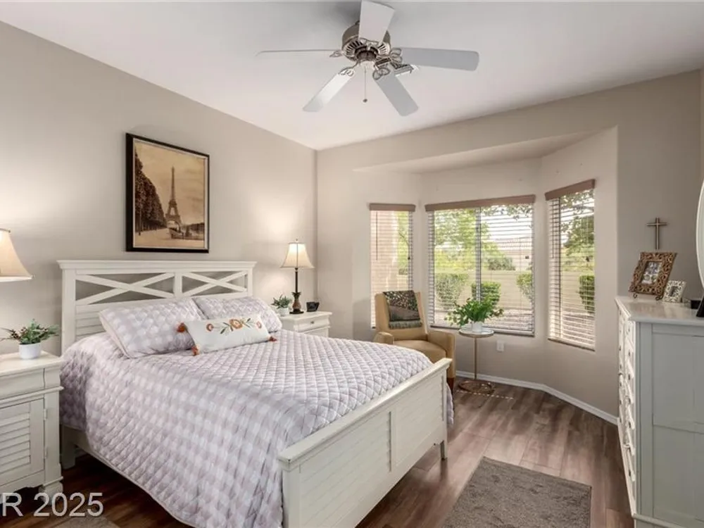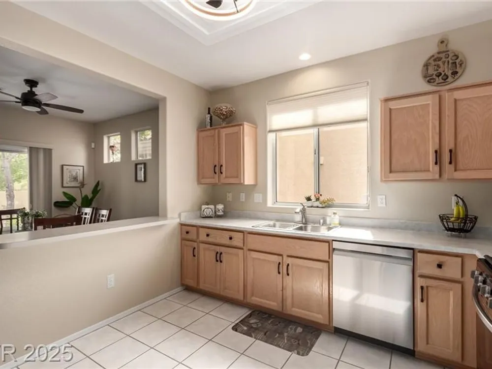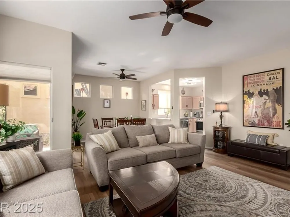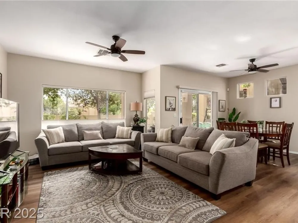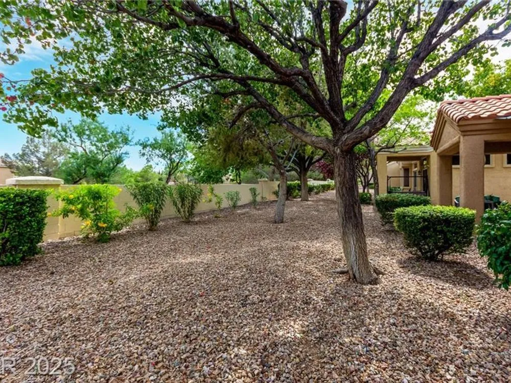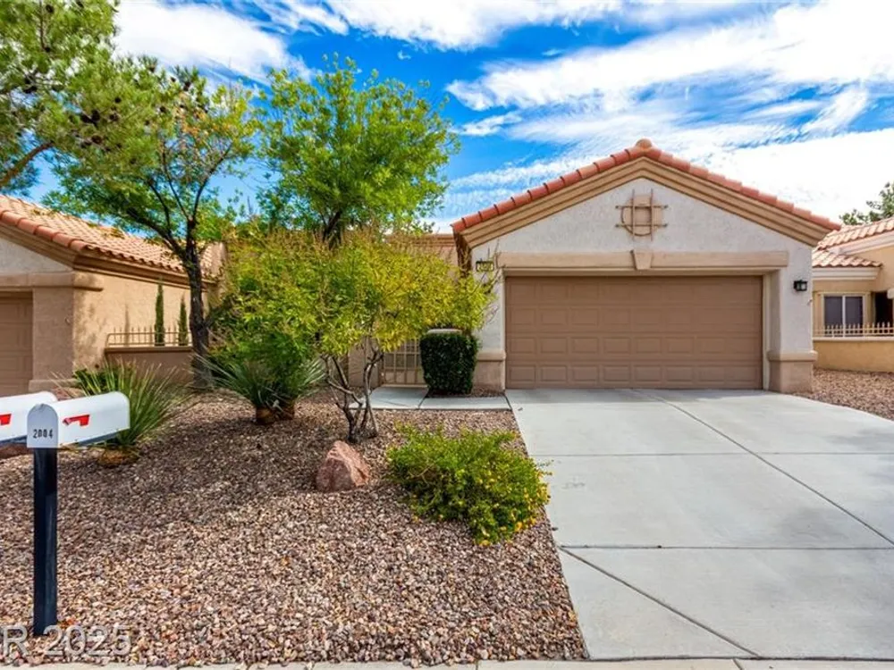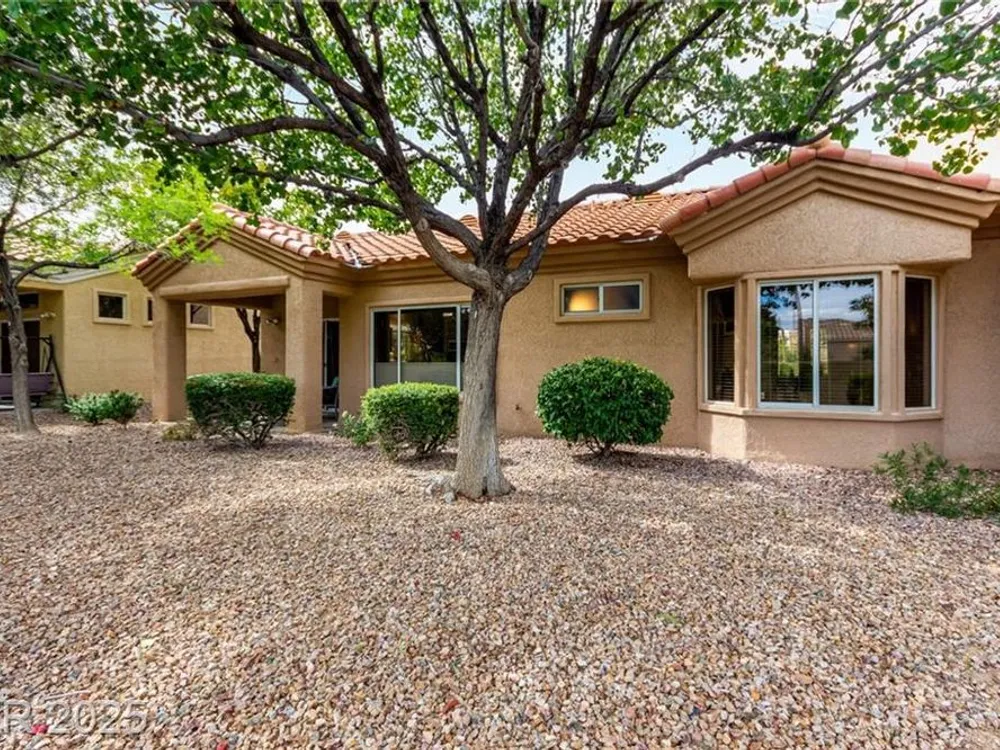 Discover the charm of this inviting 2-bed, 2-bath townhome in Sun City Summerlin! Starting with a 2-car garage, a low-maintenance landscape, and a gated front patio. Come inside to find a seamlessly flowing living & dining room, perfect for gatherings. Natural light filled the welcoming interior, complemented by a neutral palette, and tile & wood-look flooring in all the right places. The impressive kitchen boasts stainless steel appliances, wood cabinetry, and ample counter space. The primary bedroom has a bay window and a private bathroom with dual sinks. While the secondary bedroom can be an office as well. The laundry room includes a sink & cabinetry for added convenience. Check out the tranquil backyard, featuring a covered patio to relax and mature trees for a constant breeze! Sun City Summerlin is a 55+ Community, offering resort-style amenities such as golf courses, fitness centers, pools, and social clubs designed for an active lifestyle. Don't miss this excellent opportunity!