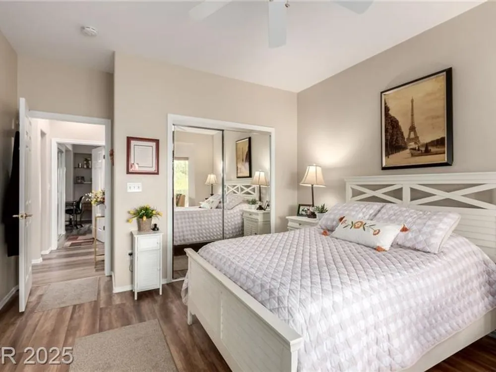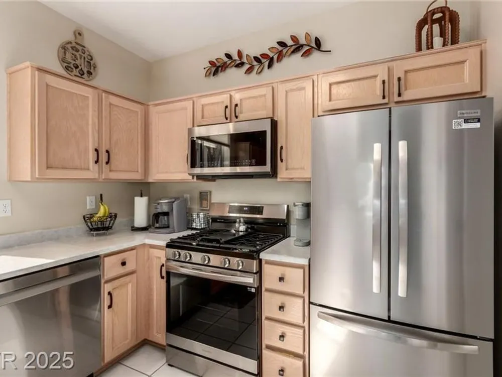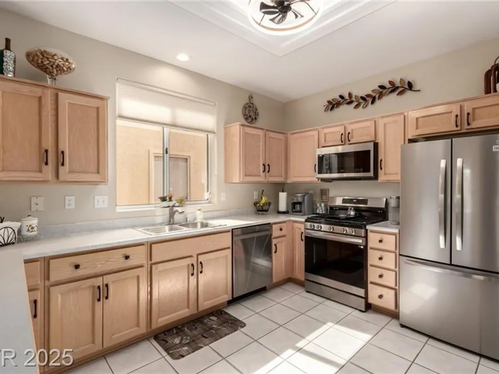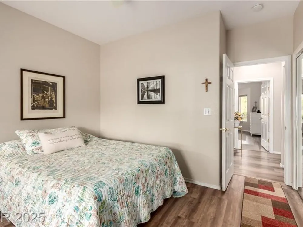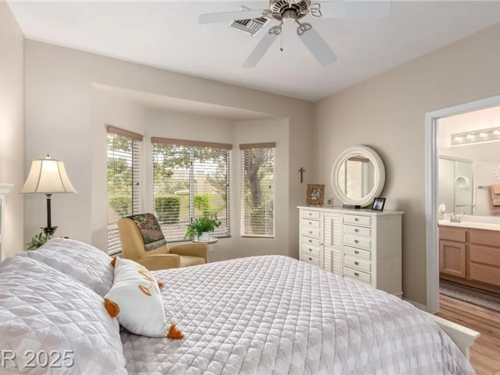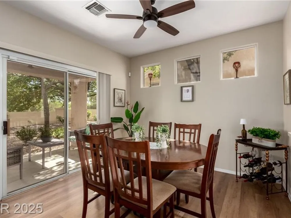 Discover the charm of this inviting 2-bed, 2-bath townhome in Sun City Summerlin! Starting with a 2-car garage, a low-maintenance landscape, and a gated front patio. Come inside to find a seamlessly flowing living & dining room, perfect for gatherings. Natural light filled the welcoming interior, complemented by a neutral palette, and tile & wood-look flooring in all the right places. The impressive kitchen boasts stainless steel appliances, wood cabinetry, and ample counter space. The primary bedroom has a bay window and a private bathroom with dual sinks. While the secondary bedroom can be an office as well. The laundry room includes a sink & cabinetry for added convenience. Check out the tranquil backyard, featuring a covered patio to relax and mature trees for a constant breeze! Sun City Summerlin is a 55+ Community, offering resort-style amenities such as golf courses, fitness centers, pools, and social clubs designed for an active lifestyle. Don't miss this excellent opportunity!