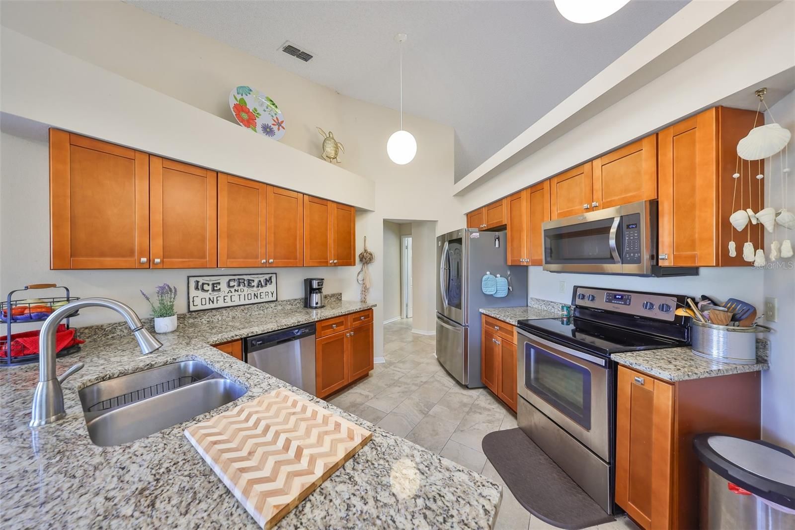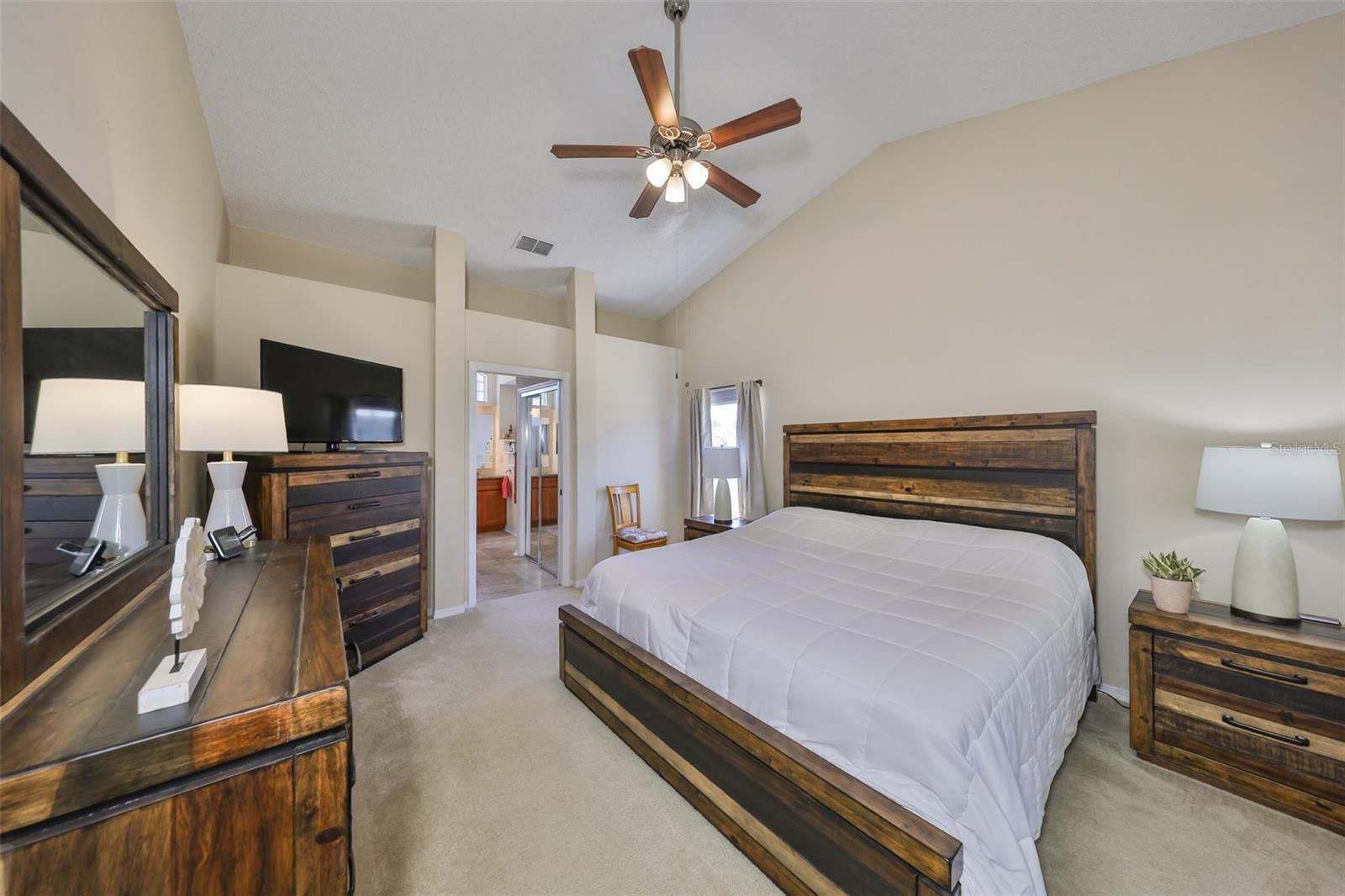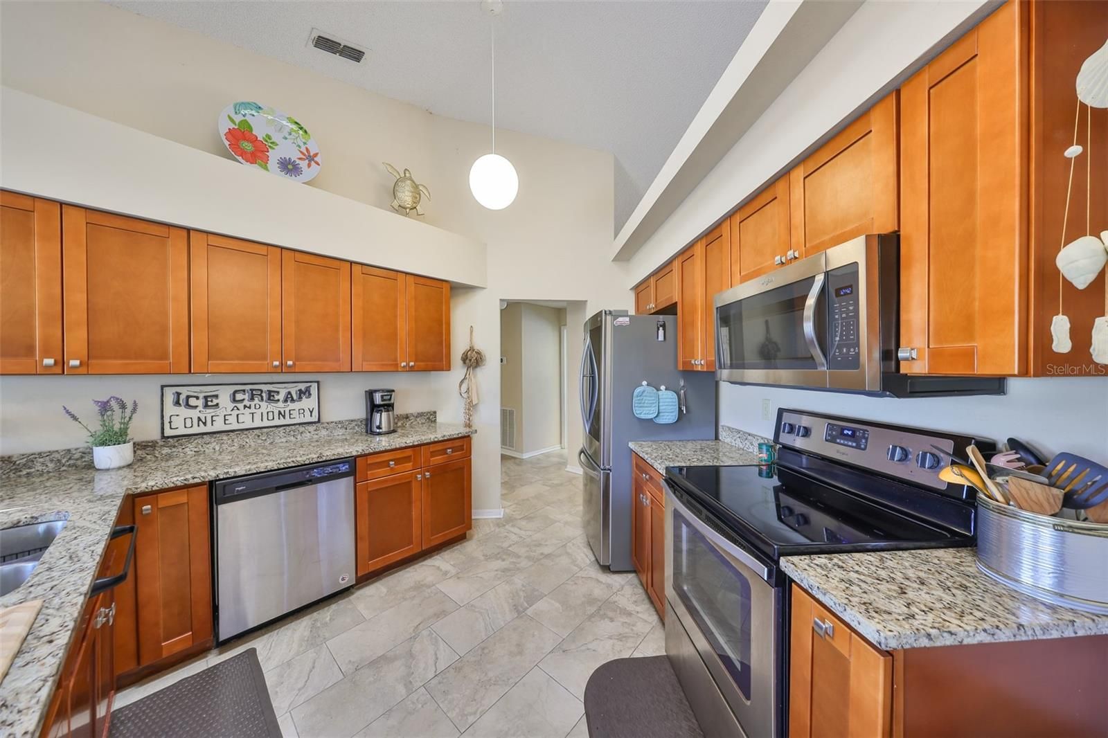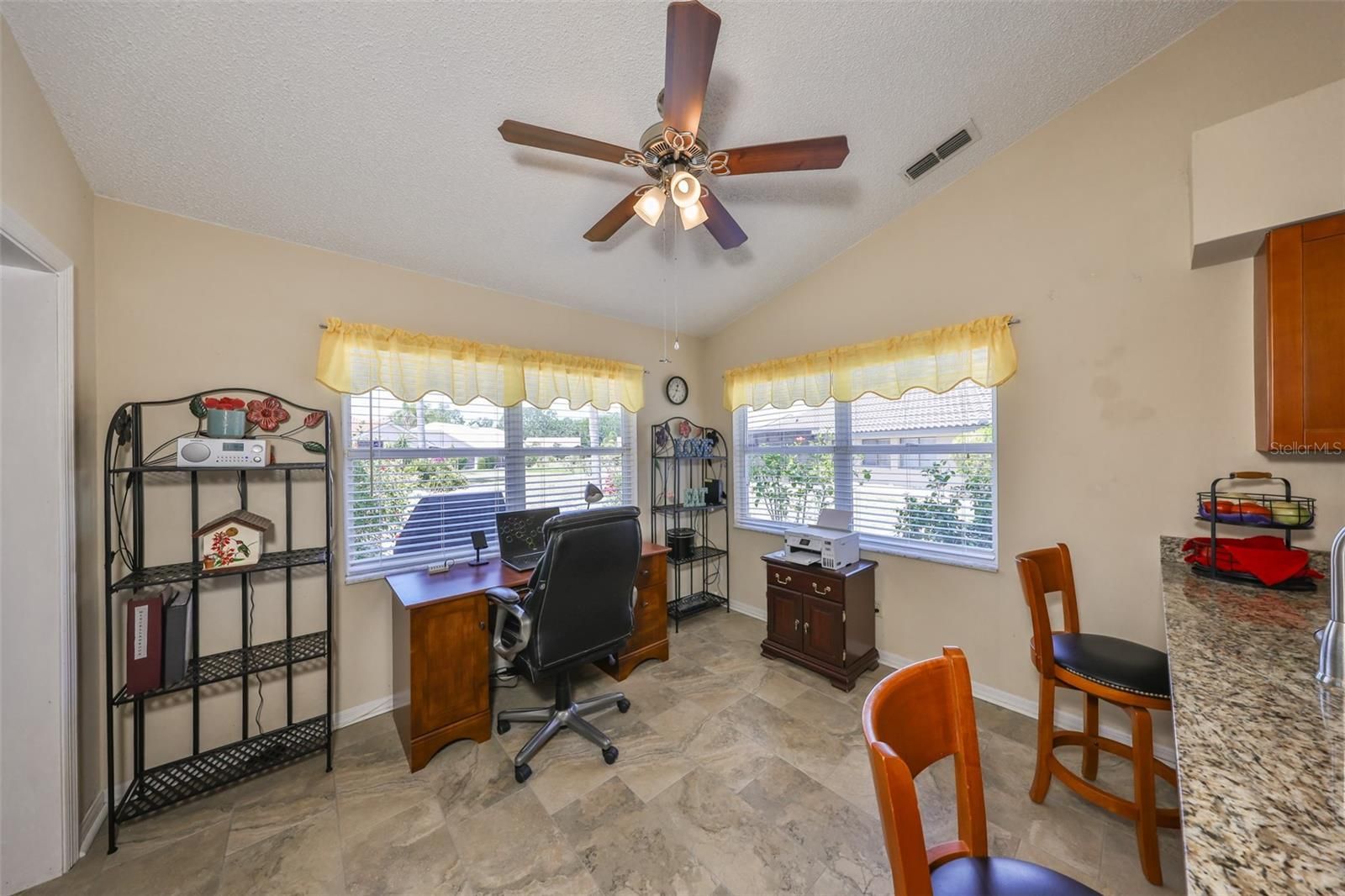- Cathedral Ceiling(s), Ceiling Fan(s), Eat-in Kitchen, High Ceilings, Living/Dining Room, Main Level Primary, Split Bedrooms, Stone Counters, Thermostat, Vaulted Ceiling(s), Window Treatments