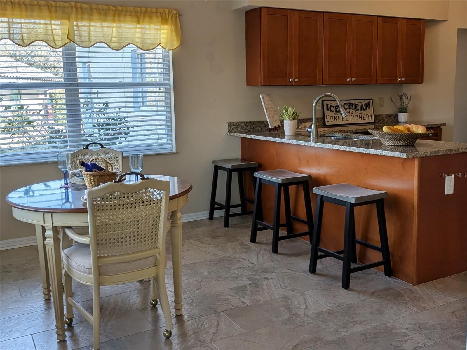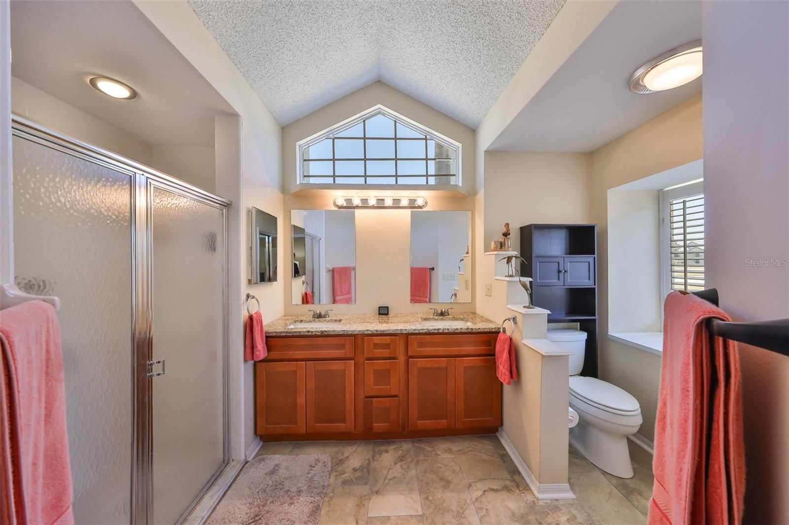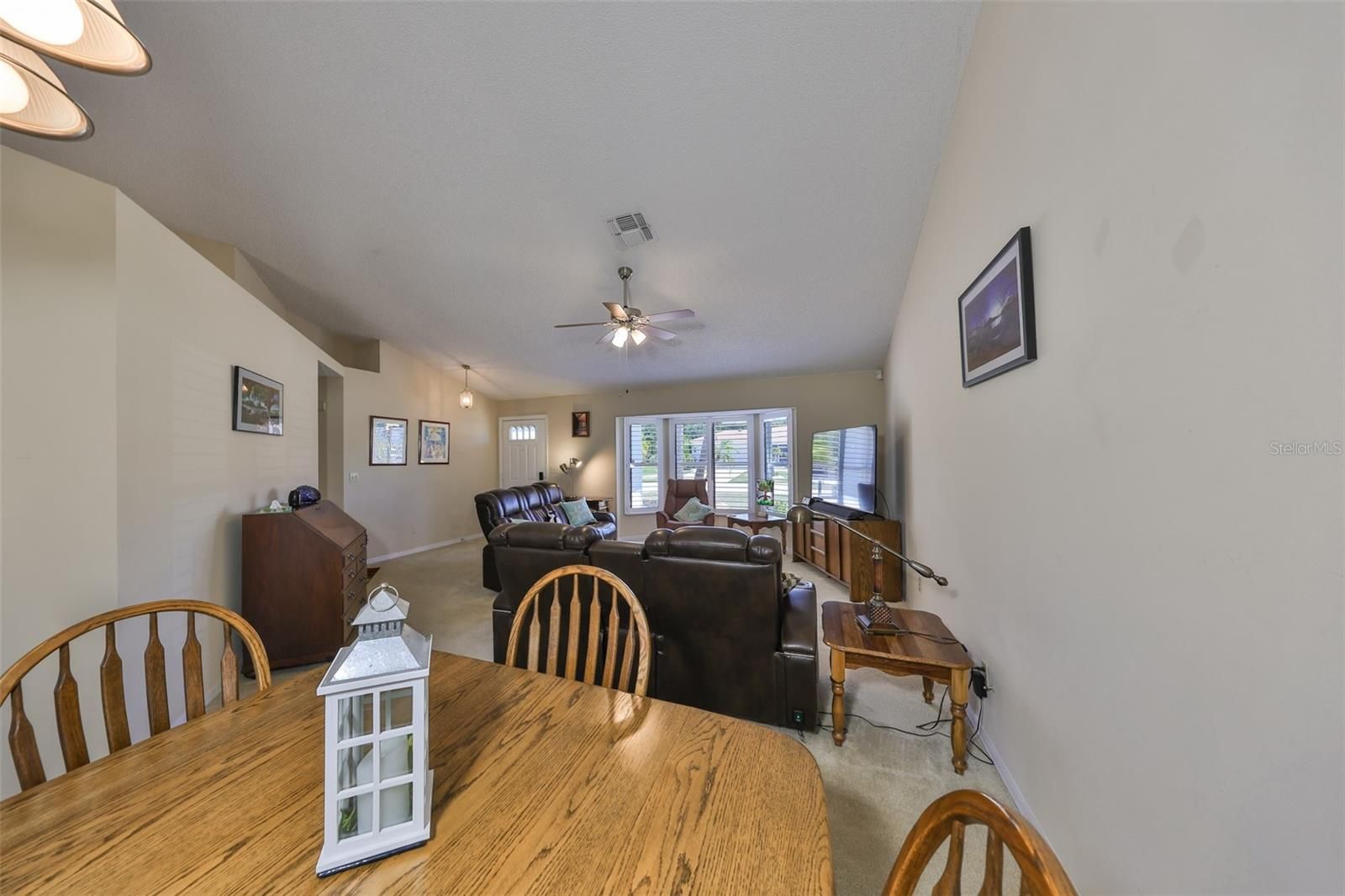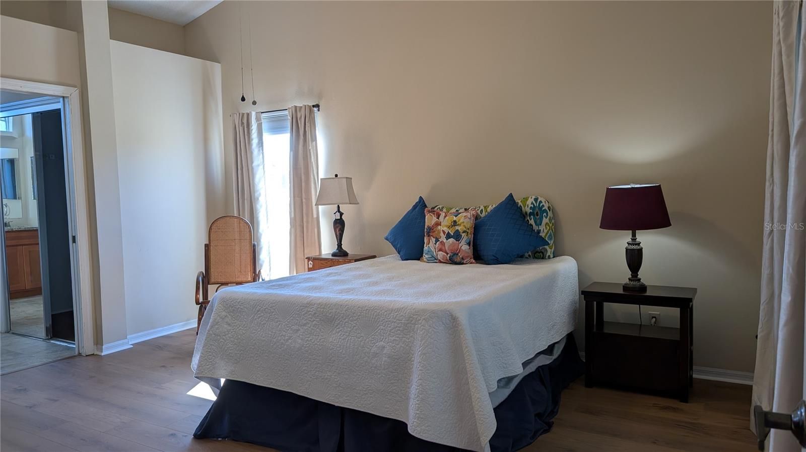 - Cathedral Ceiling(s), Ceiling Fan(s), Eat-in Kitchen, High Ceilings, Living/Dining Room, Main Level Primary, Split Bedrooms, Stone Counters, Thermostat, Vaulted Ceiling(s), Window Treatments