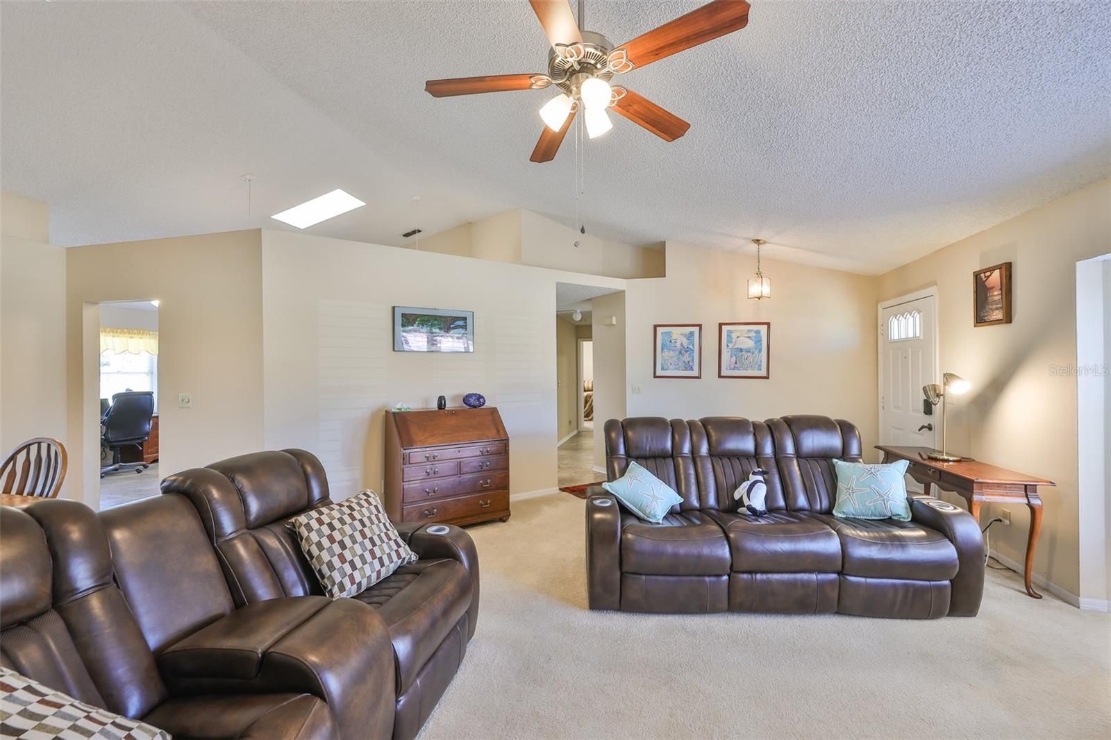 WELCOME TO YOUR CHARMING HOME WITH LOW HOA, 2 BEDROOM WITH DEN & NEWER TILE ROOF. This split, Berkshire floorplan home is nestled in a quiet & peaceful area on the south side of Sun City Center. From the moment you walk up to the quaint front porch & step through your front door you will be delighted by the light and surprised by the amount of space in this pleasant home. Inside you will love the bright & cheerful color scheme, cathedral ceilings, the updated eat-in kitchen, attractive rectangle tile in high traffic areas, and NEWER TILE ROOF (2017). This 2-bedroom home has a den that can be used in any way that suits your lifestyle…..as an office, craft room, or for additional guest quarters; just the place for a day or Murphy bed. The living/dining combo is spacious & has a lovely bay window. The kitchen has ample soft close cherry cabinetry, appealing granite countertop, new modern brushed nickel handles, stainless steel appliances, skylight, and breakfast bar that opens into your eat-in kitchen. The primary bedroom ensuite bath features 2 sizeable walk-in closets, matching cherry, comfort height dual sink vanity & a tiled walk-in shower. The guest bedroom is located on the opposite side of this home, allowing for maximum privacy for you and your guests and is both roomy & inviting. It provides additional closet walk-in space which is convenient for all your overnight visitors. Gain additional living space from the home’s enclosed lanai complemented by the roll down blinds for maximum seclusion. The covered rear screened lanai that delivers plenty of outdoor entertainment space. Spend your time relaxing while sipping your morning coffee or enjoying a favorite beverage at end of your day. The interior laundry room has washer/dryer, multipurpose utility sink, & cabinets to keep you and your home organized and leads to your spacious 2 car garage with side entry & metal storage rack. UPGRADES: 2022: REPLUMBED, 2021: ELECTRIC PANEL REPLACED, 2021: HOTWATER REPLACED, 2020: HVAC & DUCTWORK REPLACED, 2017: TILE ROOF. Sun City Center (SCC) is an active 55+ golf cart community. It is close to airports, beaches, shopping & big city nightlife & entertainment. SCC offers outdoor pools & spas, a well-equipped fitness center, a community hall, library, arts/crafts, outdoor sports, lawn bowling, pickleball and golf. Hurry & schedule a showing today! Please don’t overlook this delightful treasure that you can make your own. You will love your new SCC lifestyle.